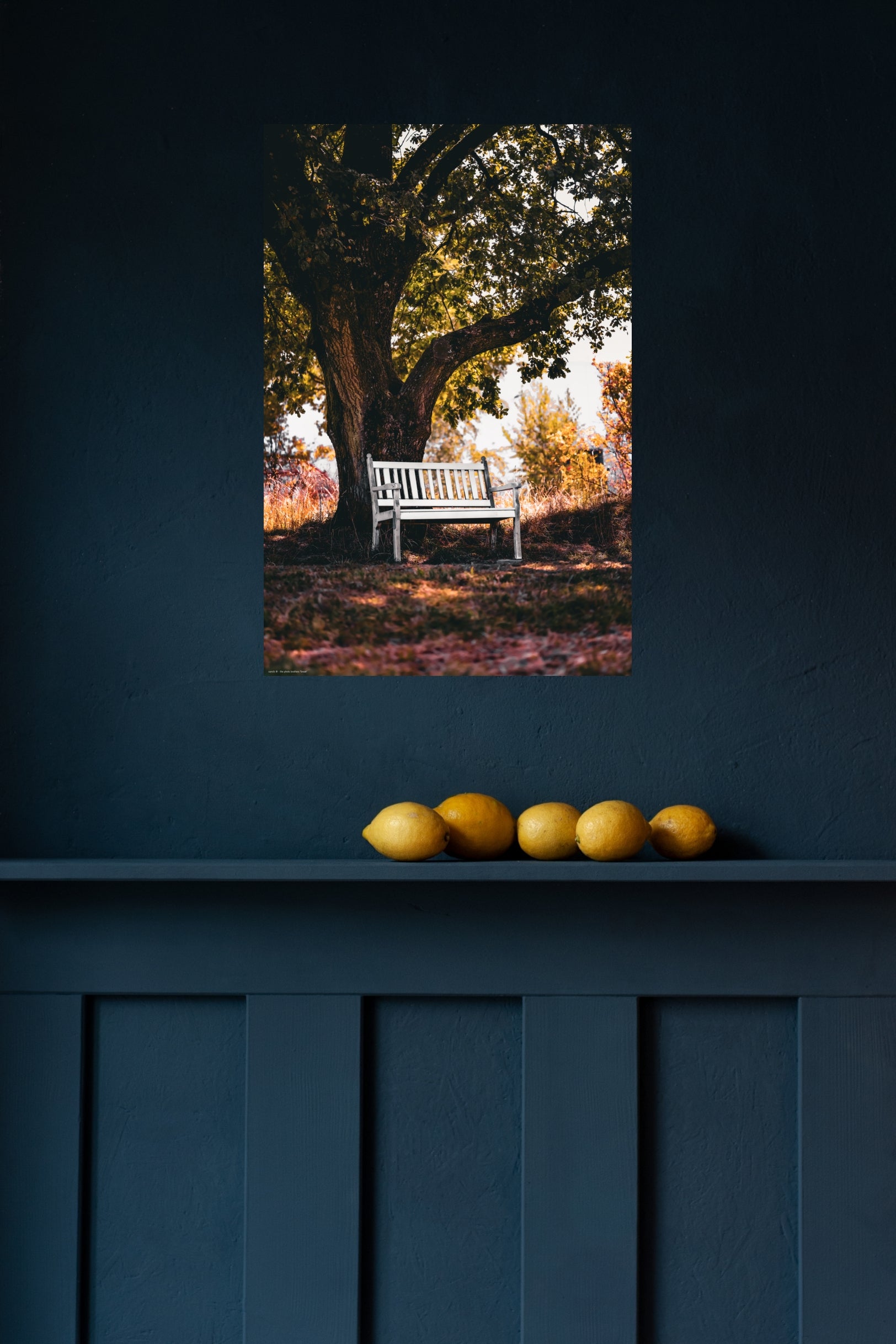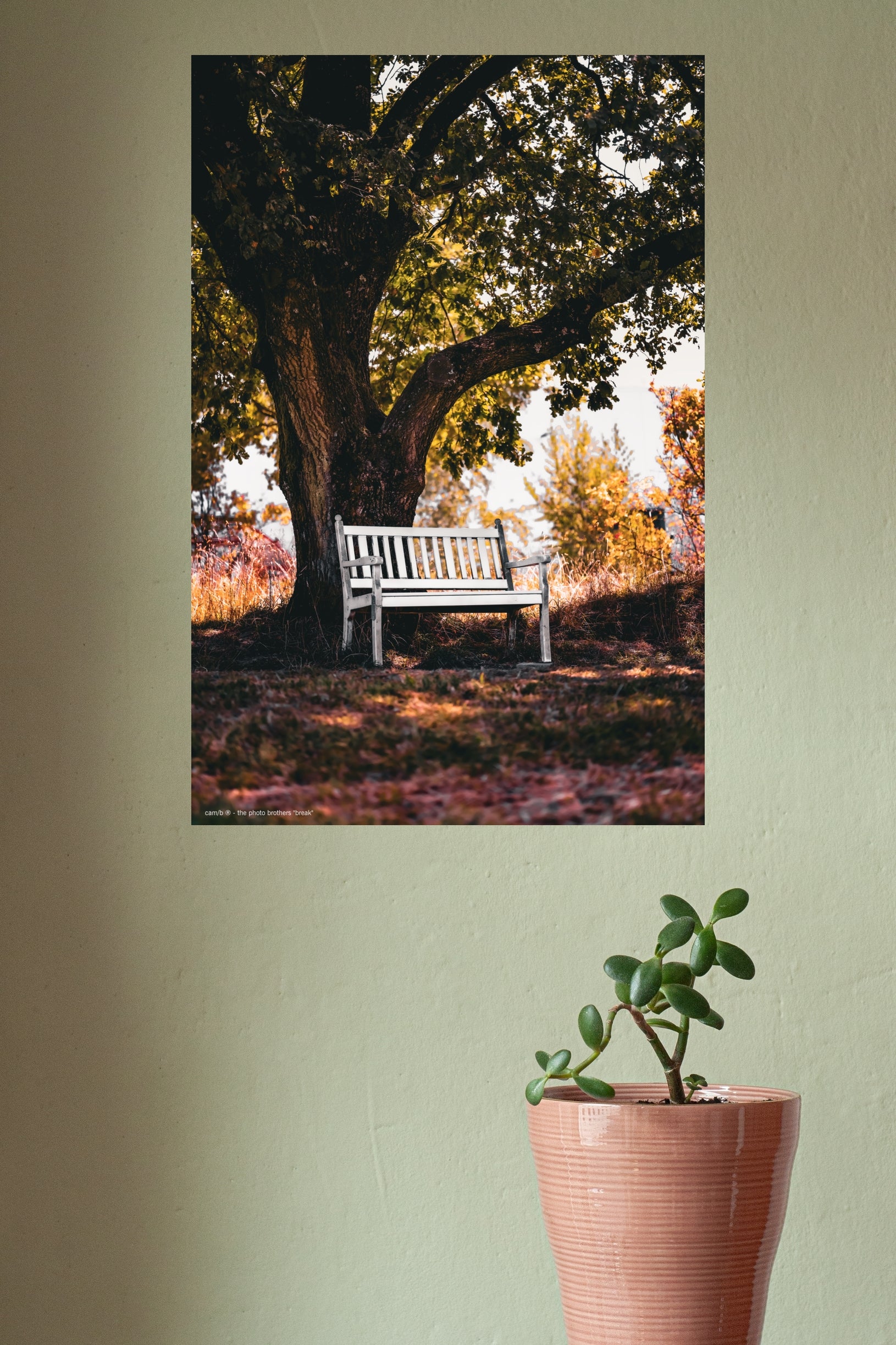 A beautiful autumnal mural depicting a white bench in the countryside under a tree. How pleasant it must be to spend your break here and enjoy a little time out. And although this picture was taken in Solingen, it could be (almost) anywhere in the world (Photographer: DE, 2025).