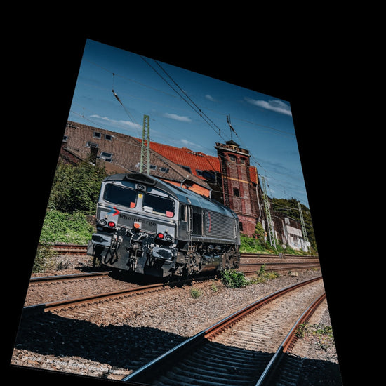 A mural of contrasts: the modern power of the Rhine Cargo DE 61 locomotive moves the flow of goods, while in the background an old tower stands guard as a silent witness to the past (Photographer: DE, 2022).