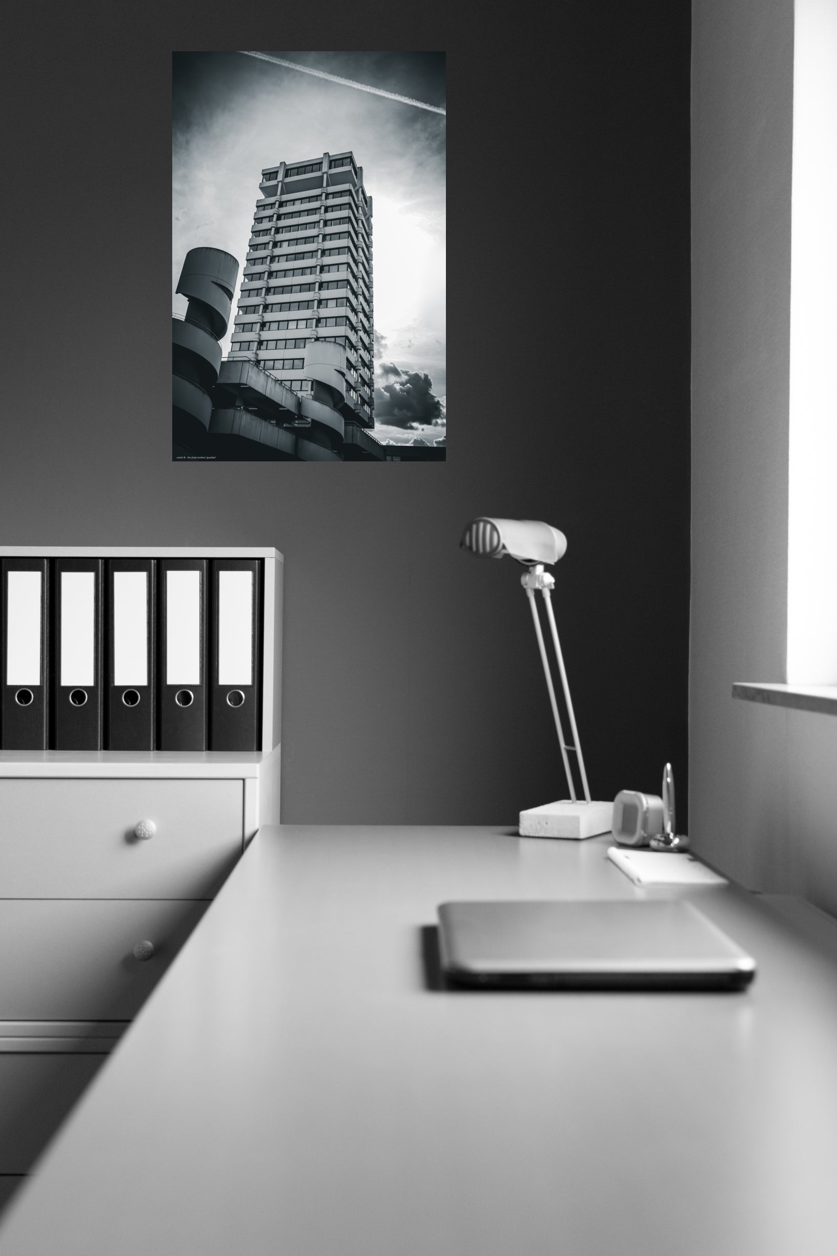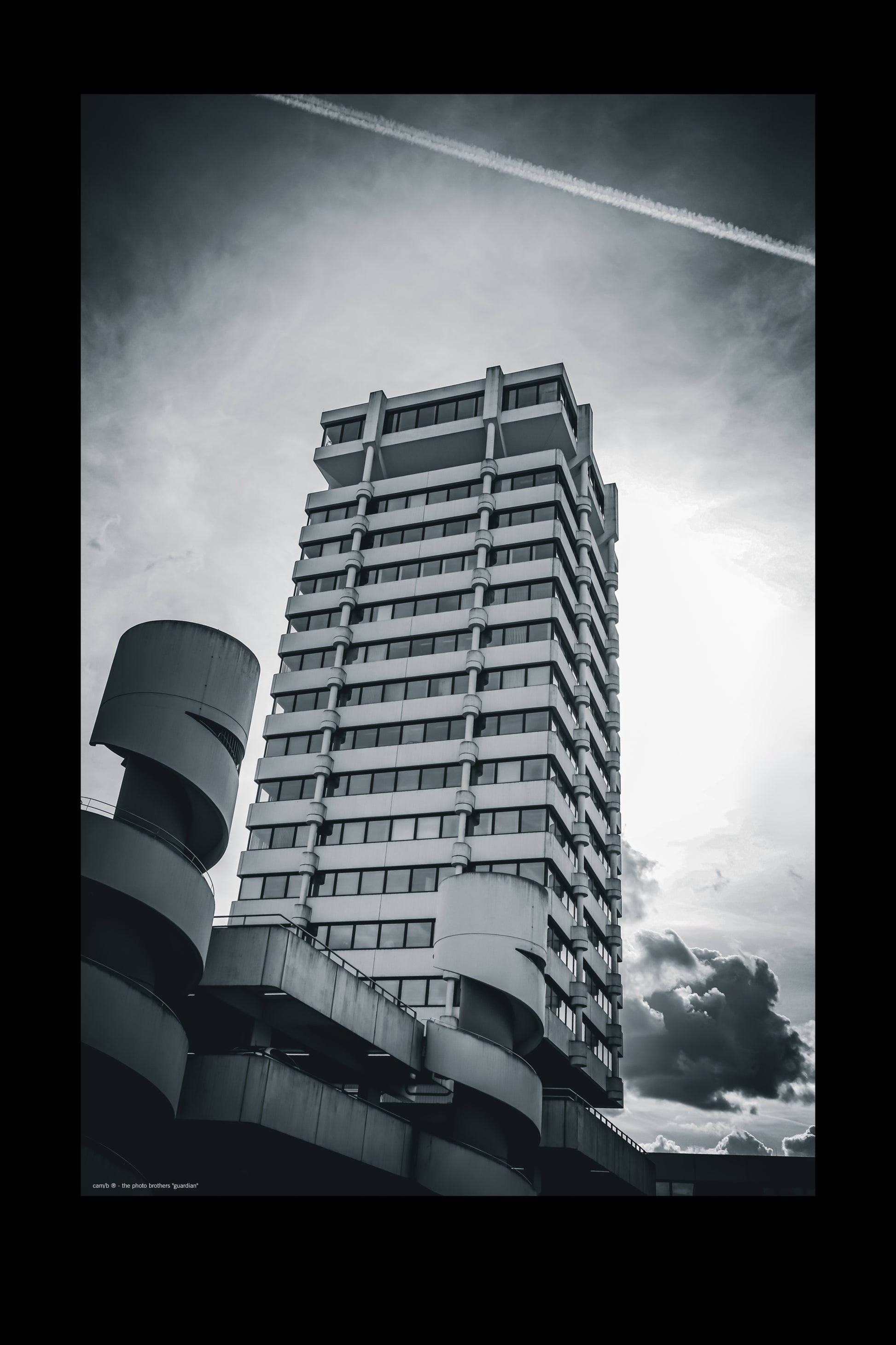 The main branch of the Stadtsparkasse Wuppertal with the two staircases to the parking garage shows this interesting b/w picture (Photographer: DE, 2023).