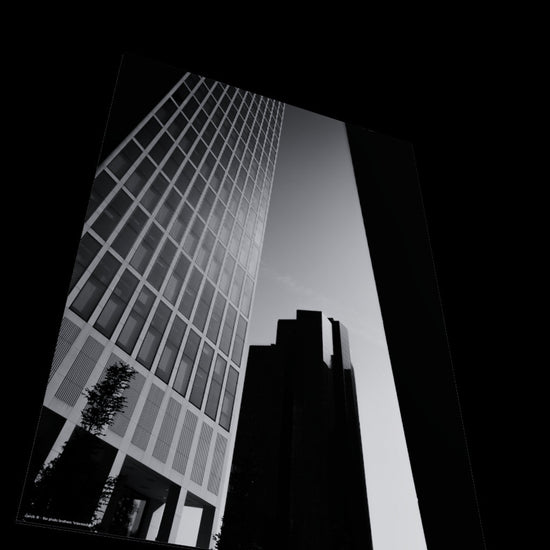 View between the skyscrapers in Frankfurt am Main in a fascinating black and white edit (Photographer: DE, 2022).