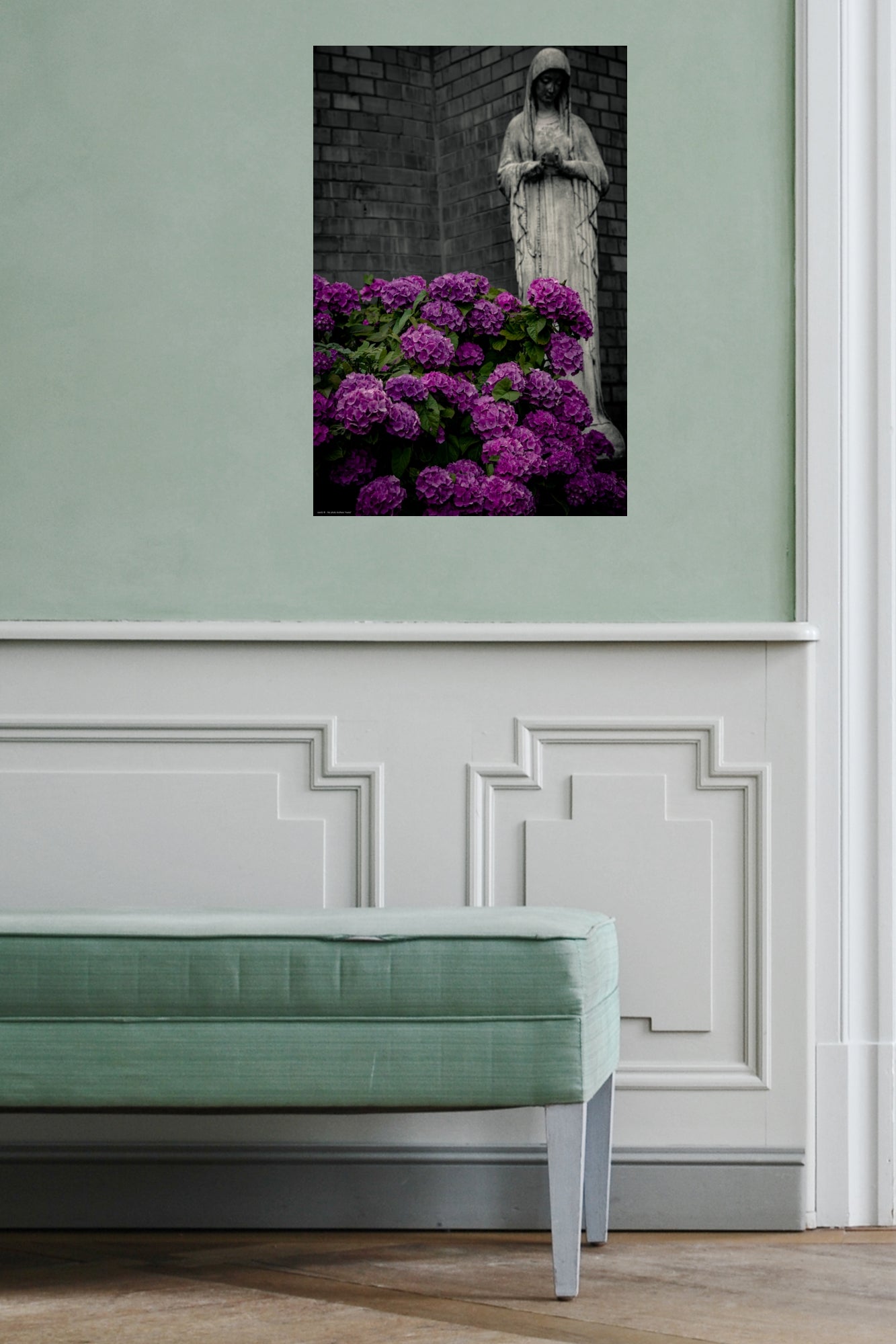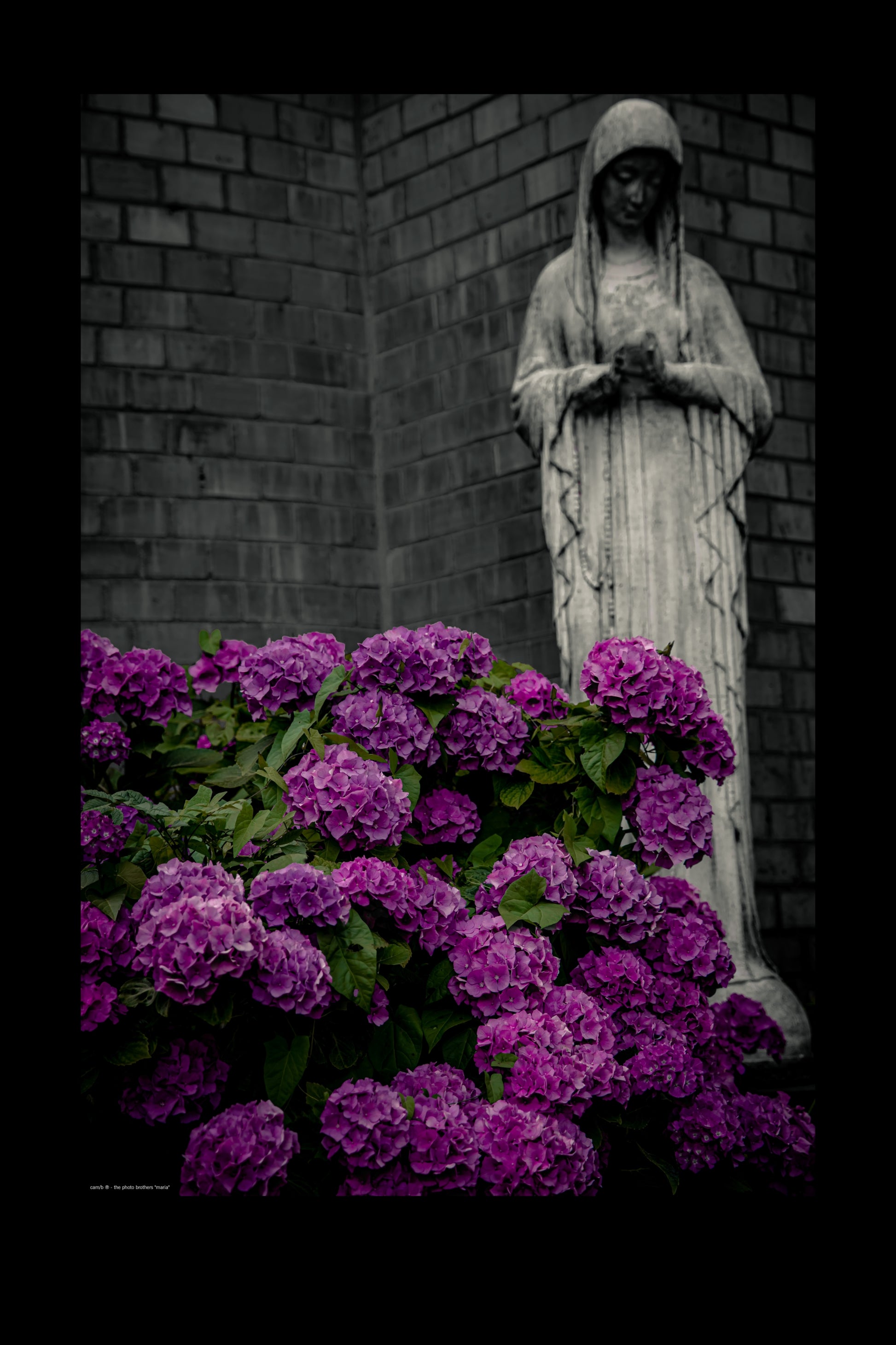 Beautiful hortension in front of the church St. Marien in Wuppertal. In the background a Mary sculpture (Photographer: DE, 2023).