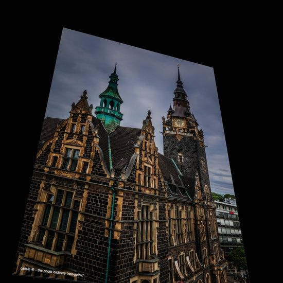 This exclusive wall mural captures the impressive architecture of the historic Elberfeld Town Hall in Wuppertal. A masterpiece of neo-Gothic and eclectic style, it was built at the turn of the 20th century. The façade captivates with its striking contrast between the dark Londorf basalt lava and the delicate, light sandstone decorations, which give the work a unique texture. With its imposing clock tower and detailed gables, this image is an eye-catcher that brings classic elegance and historical depth to any room. It is the perfect choice for lovers of architecture and urban history (Photographer: DE, 2022).