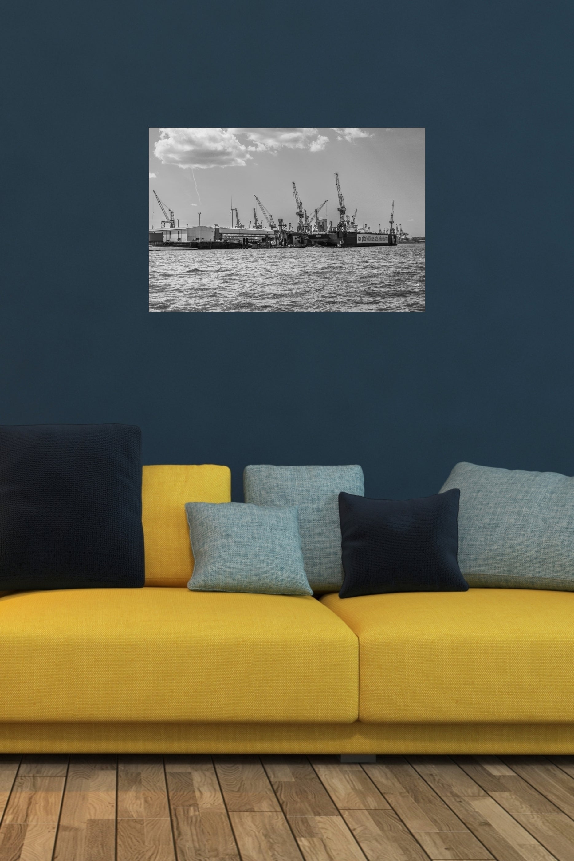 Finely structured black-and-white mural of the Osteriff, a hopper dredger, in the port of Hamburg (Photographer: Luise, 2025).