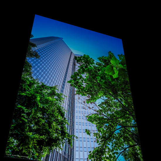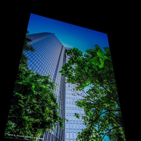 Green and blue dominate this fantastic mural depicting Frankfurt am Main. Amidst the urban canyons of skyscrapers, trees and shrubs can be found here and there, standing in stark contrast to the modern architectural design (Photographer: DE, 2022).