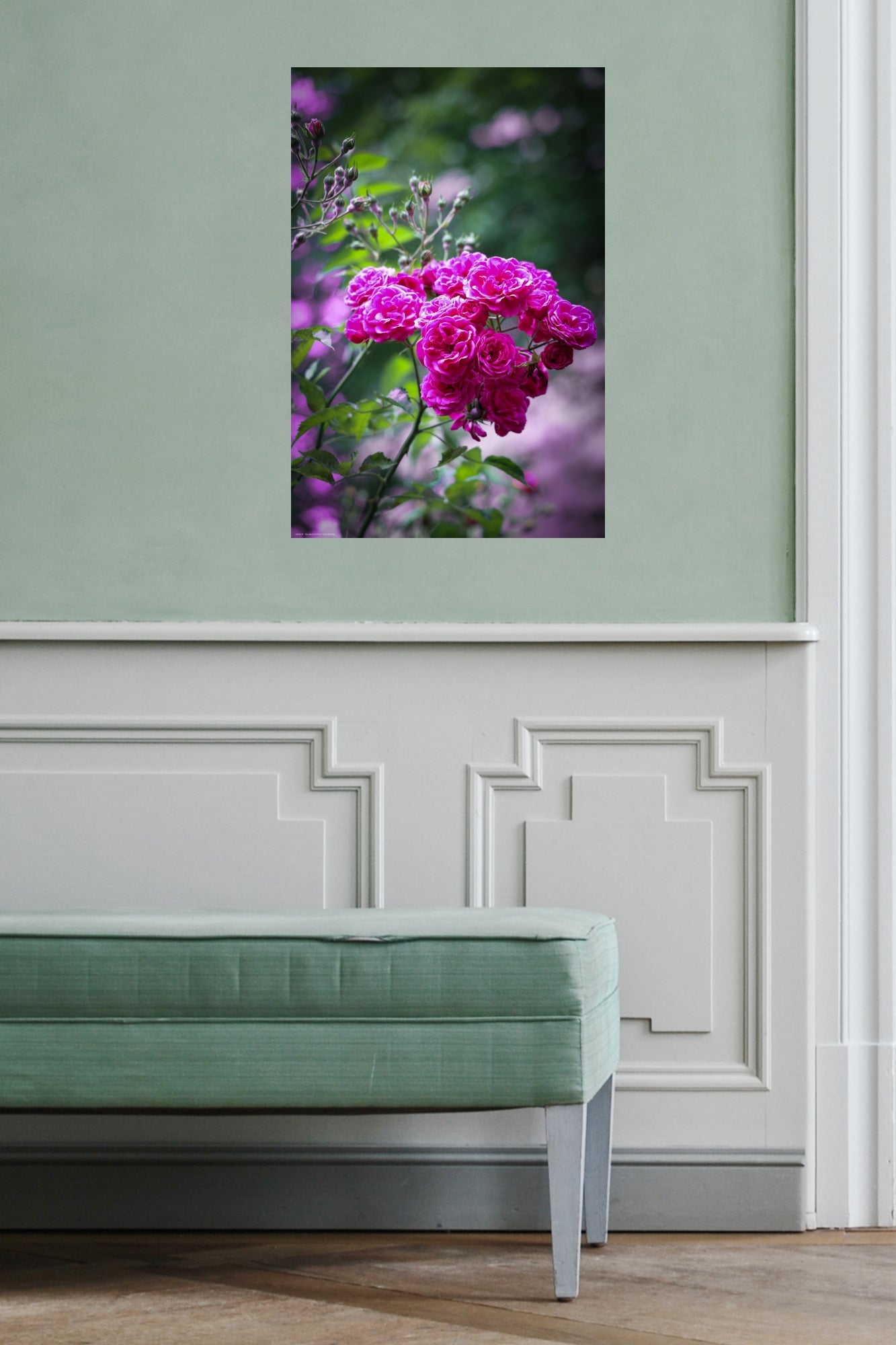 Beautiful wall art of the fir rose (Rosa abietina Gren. ex Christ). This plant originates from the Alpine region and can grow up to 1.5 meters tall as a shrub. The flowers bloom from June to July (Photographer: DE, 2024).