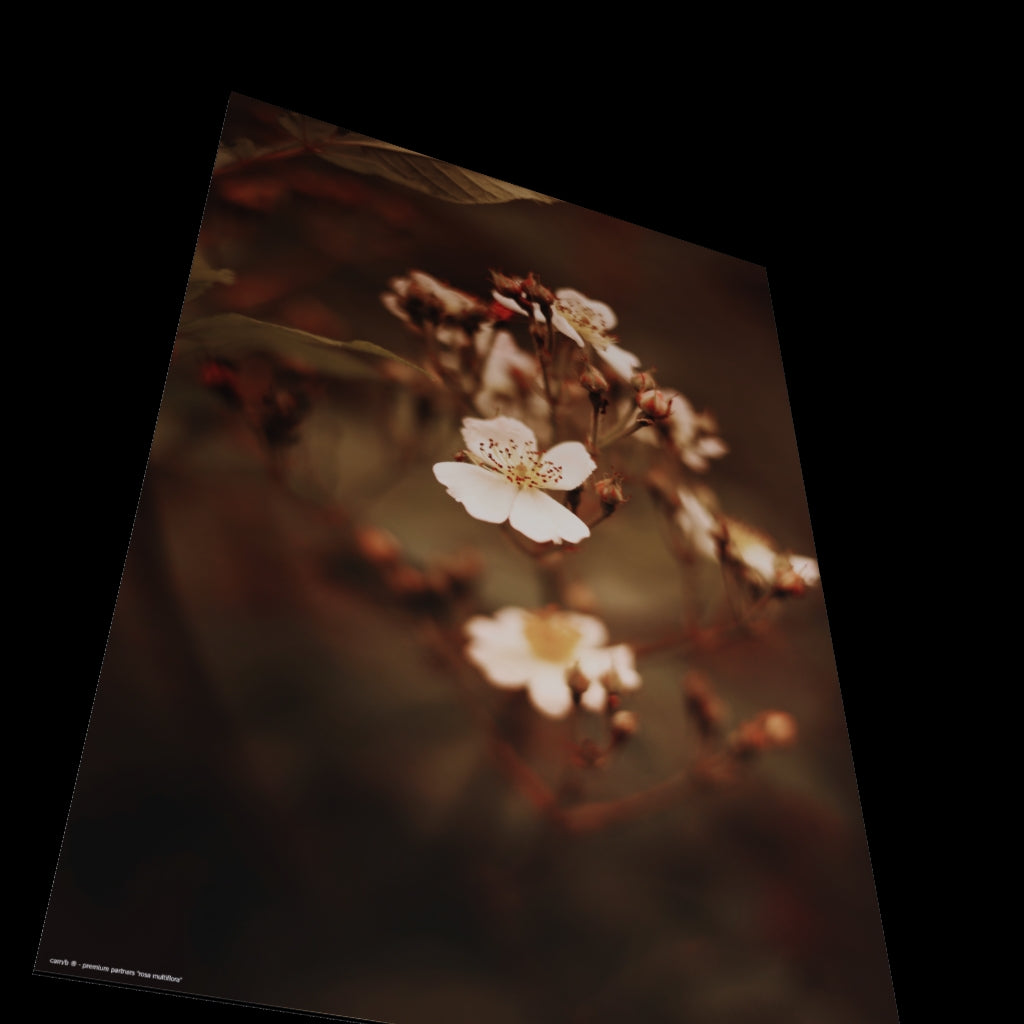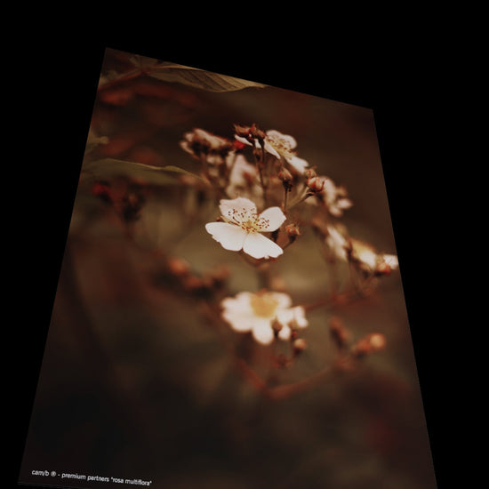 Fantastic picture in delicate brown and white tones with a focus on the blossom of the tufted rose. It can grow up to 3 m high. Rosa multiflora is perfect as a climbing rose on fences or trellises, also because it grows particularly densely and has hardly any thorns (Photographer: wuppigraphy, 2024).