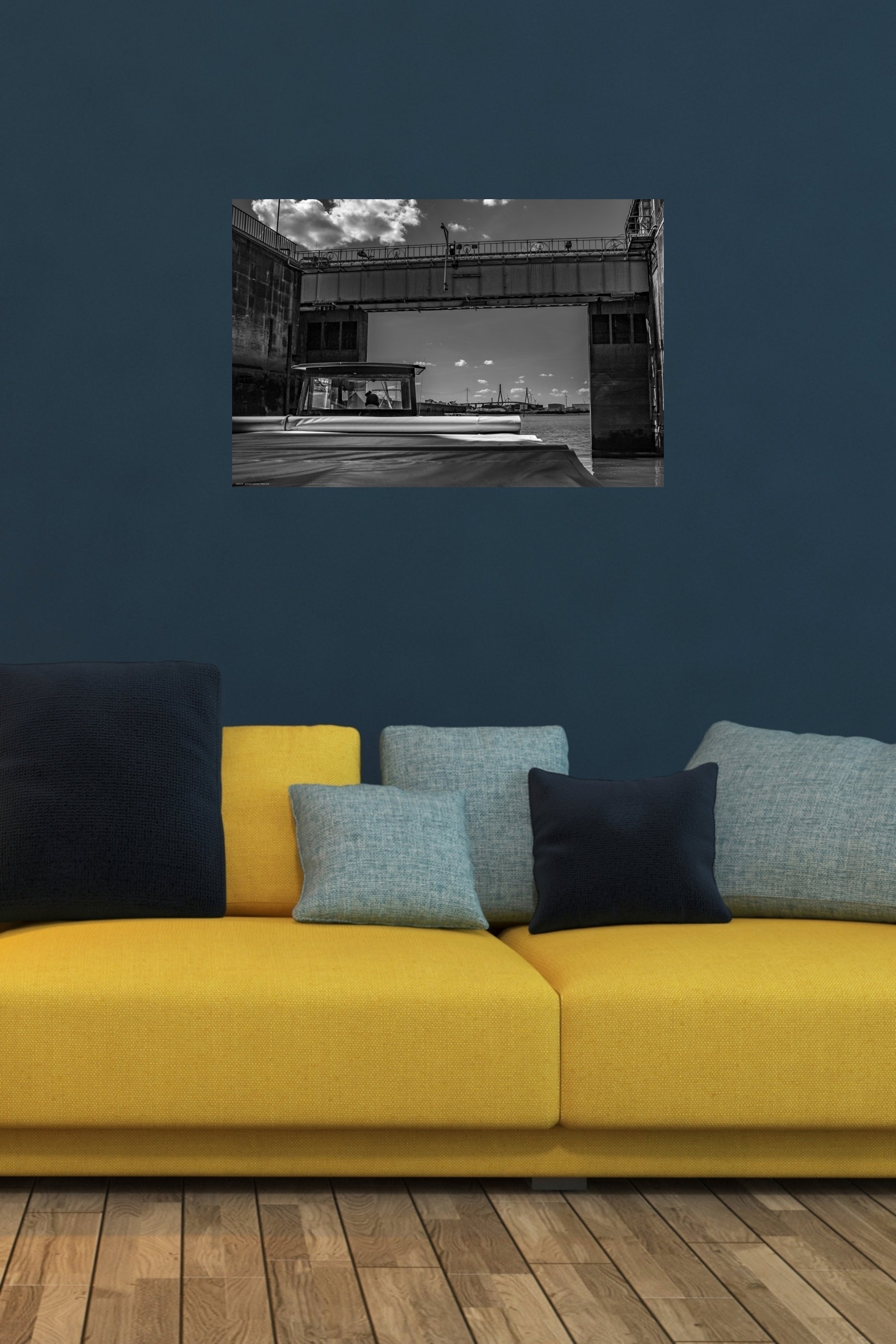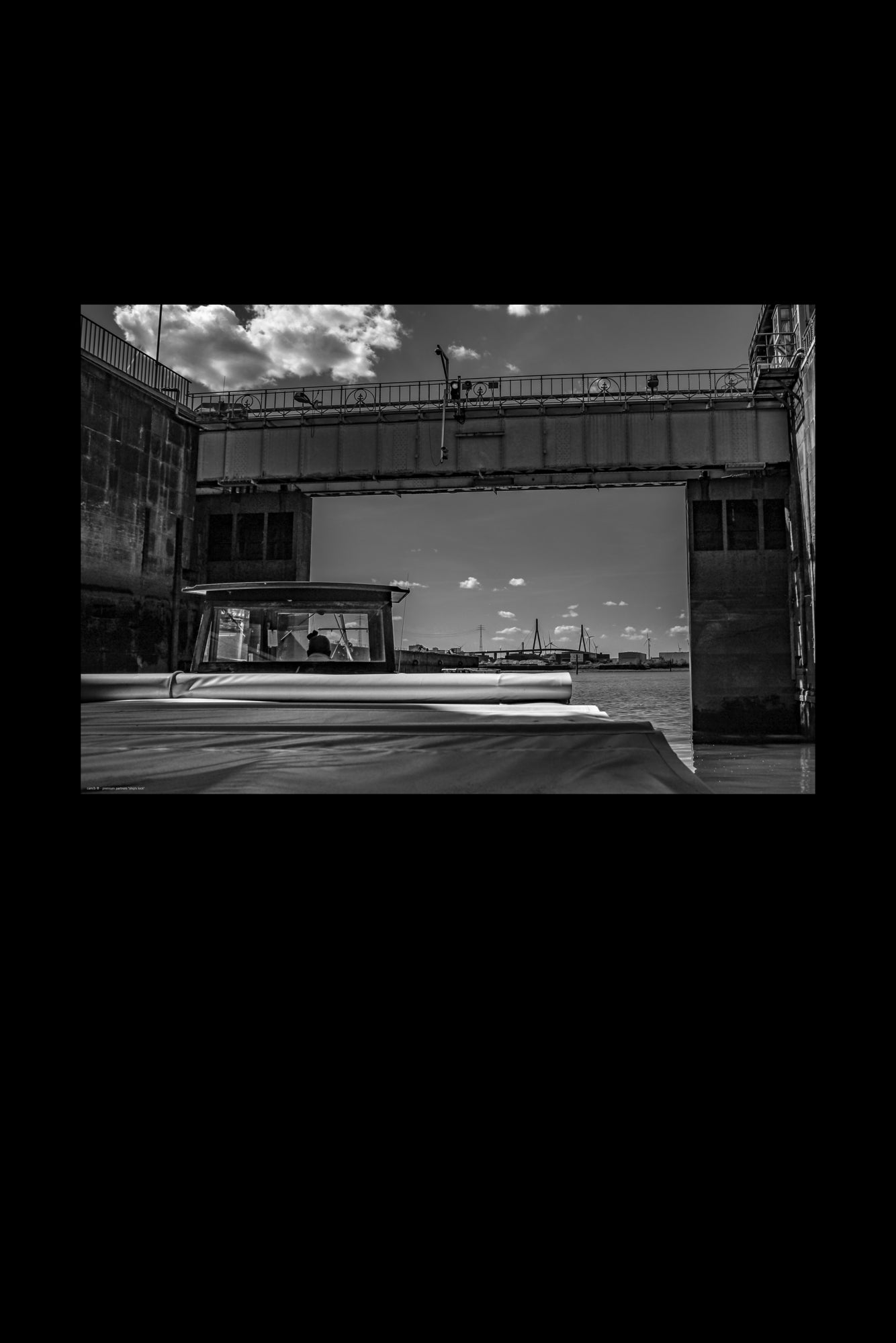Beautiful b/w photograph of the entrance to the port of Hamburg through a lock gate. In the background is the Köhlbrand Bridge, which has connected the Elbe island of Wilhelmsburg with the federal highway 7 since 1974 (Photographer: Luise, 2025).
