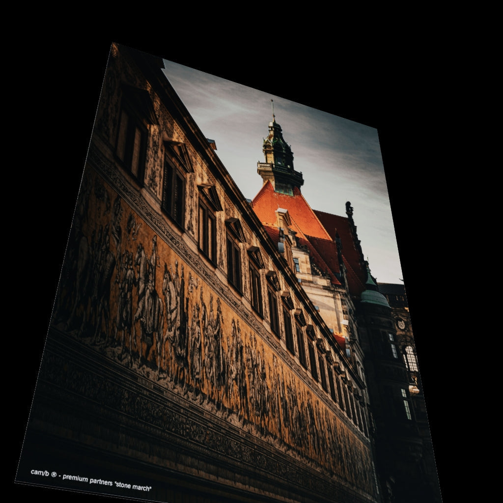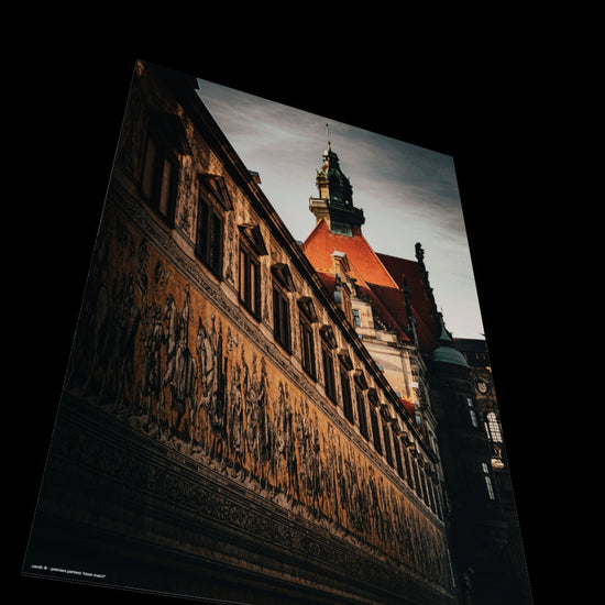 This mural, depicting Dresden's Fürstenzug, brings the history of Saxony's ruling dynasty back to life. With a length of 102 meters, the Fürstenzug is considered the largest porcelain mural in the world. It depicts a total of 35 princes and kings, as well as scientists, artists, craftsmen, and farmers. A timeless work of art that brings majestic elegance to your home or office as a mural (Photographer: Christian Horenkamp, 2024).