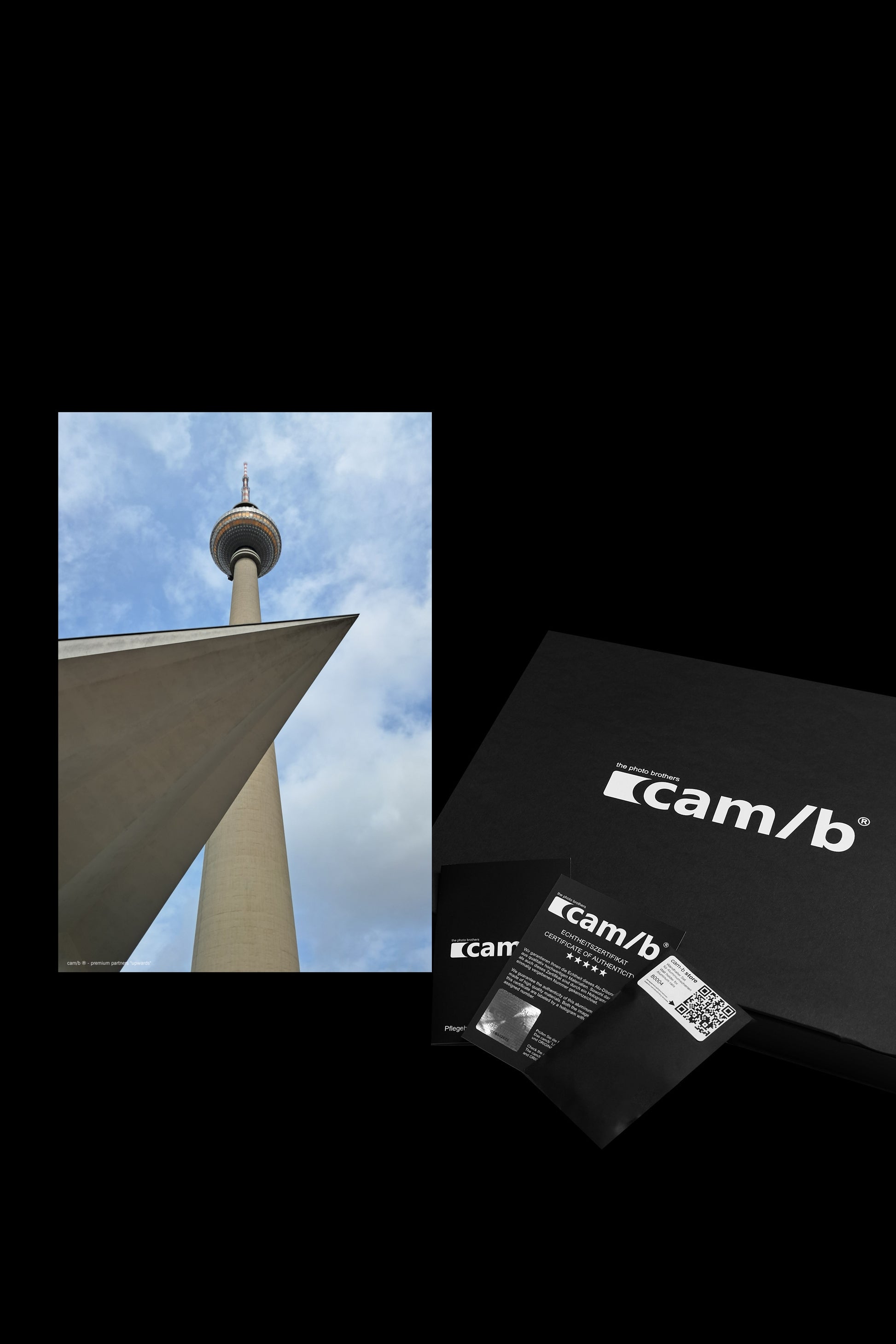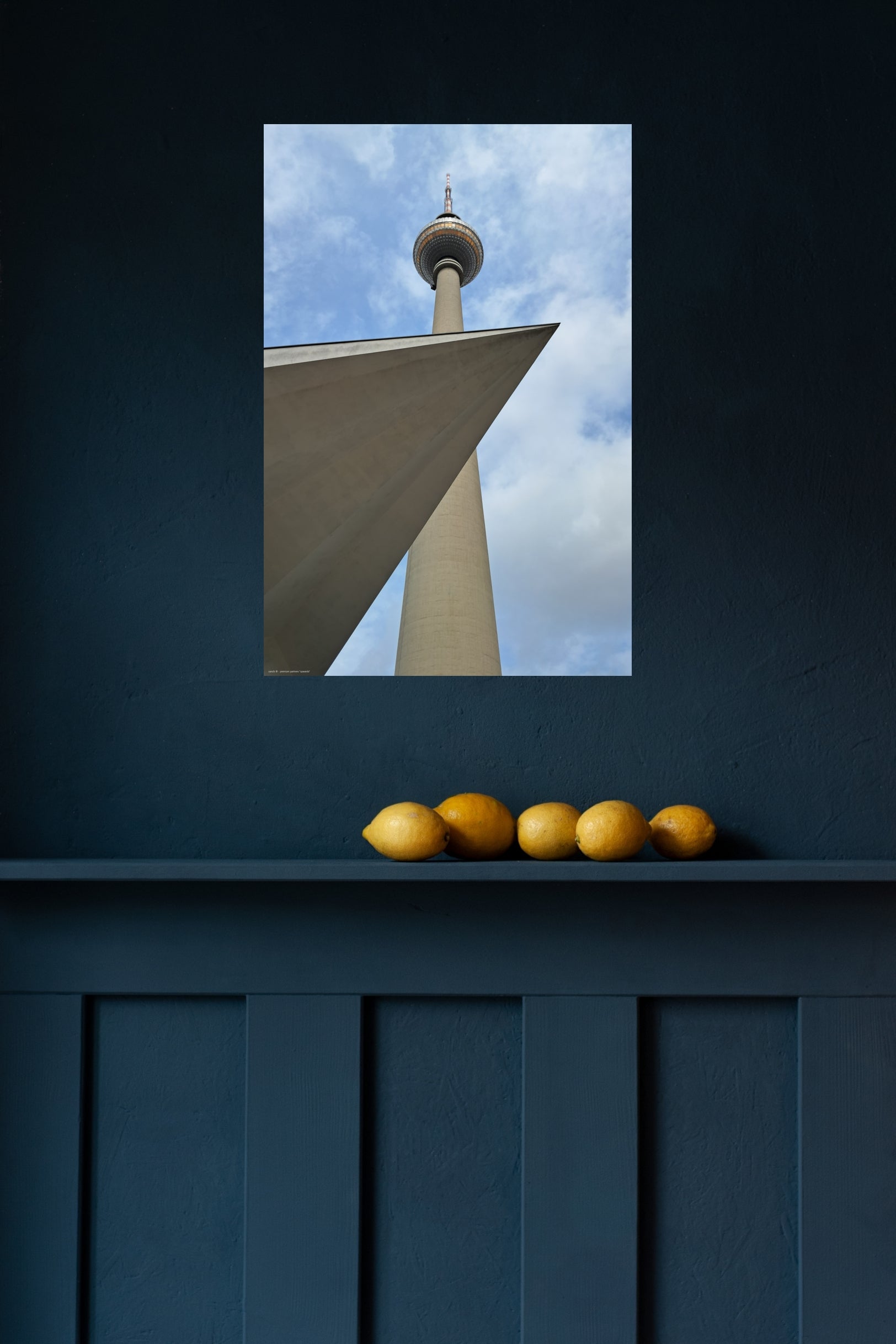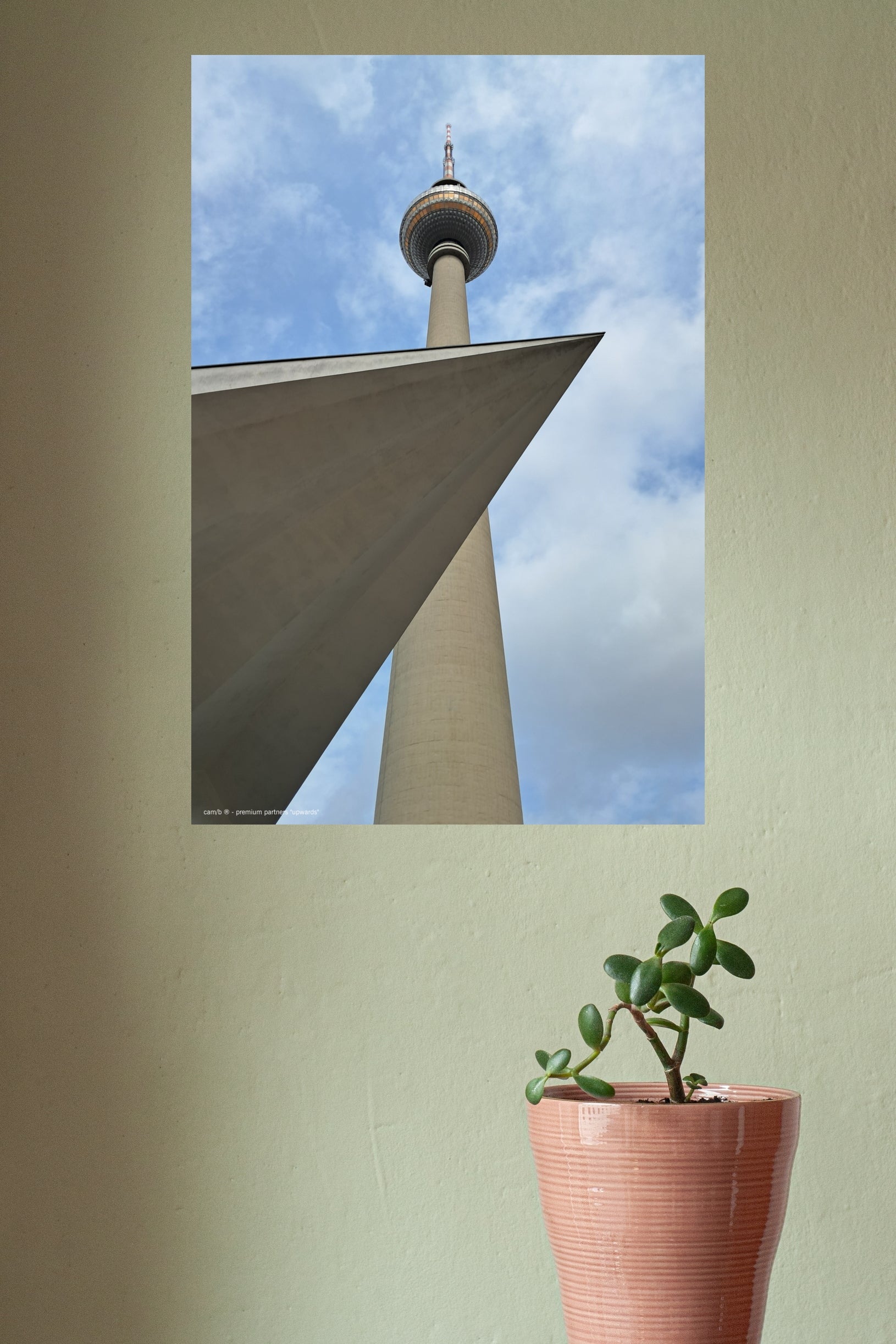 Perspective and proportions are the key elements in this minimalist-looking aluminum Dibond wall mural of the television tower in Berlin's Alexanderplatz, which, at 368 meters, is the tallest structure in Germany. This imposing television tower was built by the German Post Office of the former GDR between 1965 and 1969 (Photographer: Manuel Heywinkel, 2025).