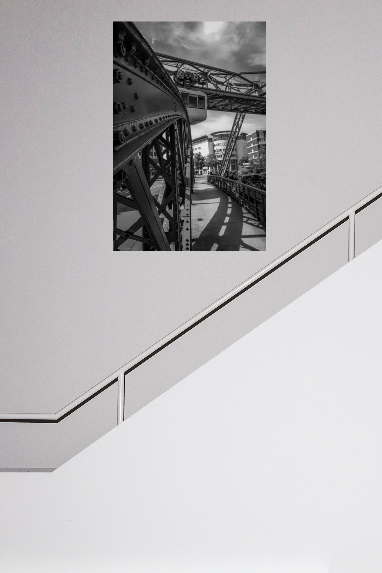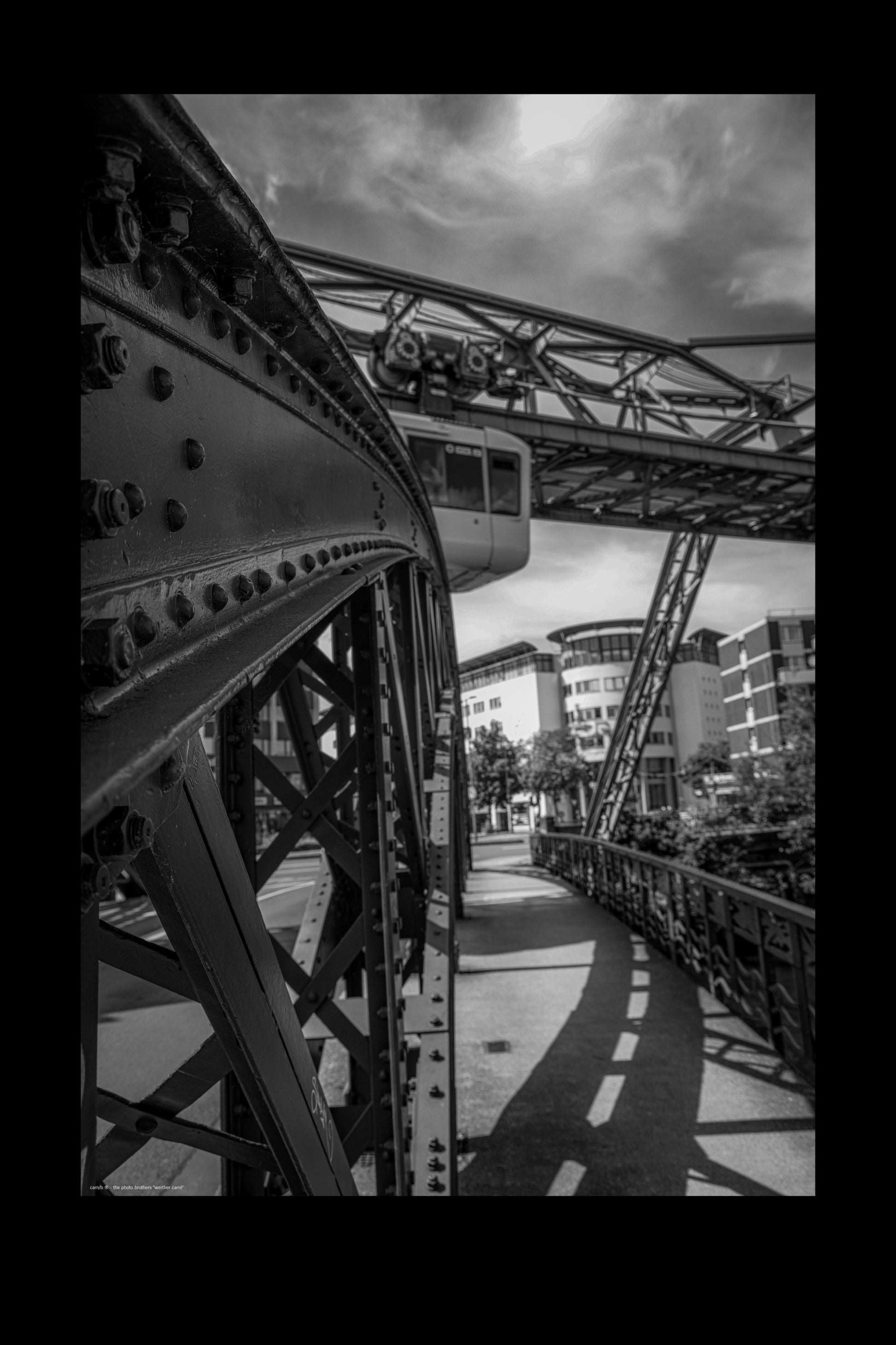 The Wuppertal suspension railway leaving the "Werther Brücke" station, with the Werther carré in the background (Photographer: DE, 2024).