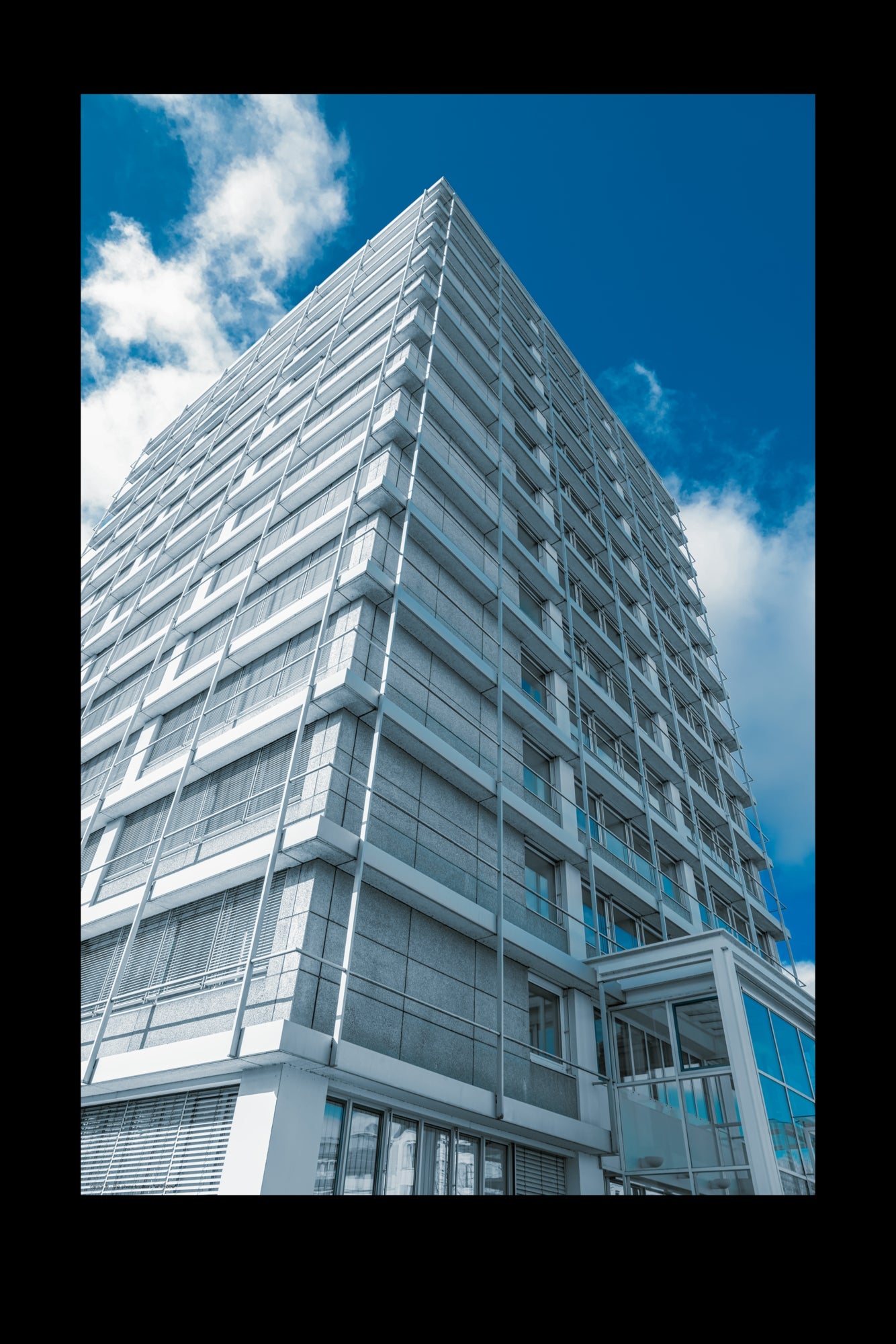 Beautifully coordinated colors in a light shade of blue and white characterize this mural of a high-rise office building on Robert-Daum-Platz in Wuppertal Elberfeld. Minimalist in form and color (Photographer: DE, 2025).