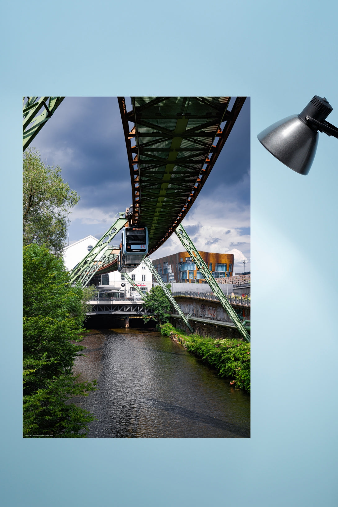 Die Wuppertaler Schwebebahn über der Wupper beim Verlassen des Knotenpunktes Döppersberg/Hauptbahnhof (Fotograf: DE, 2024).