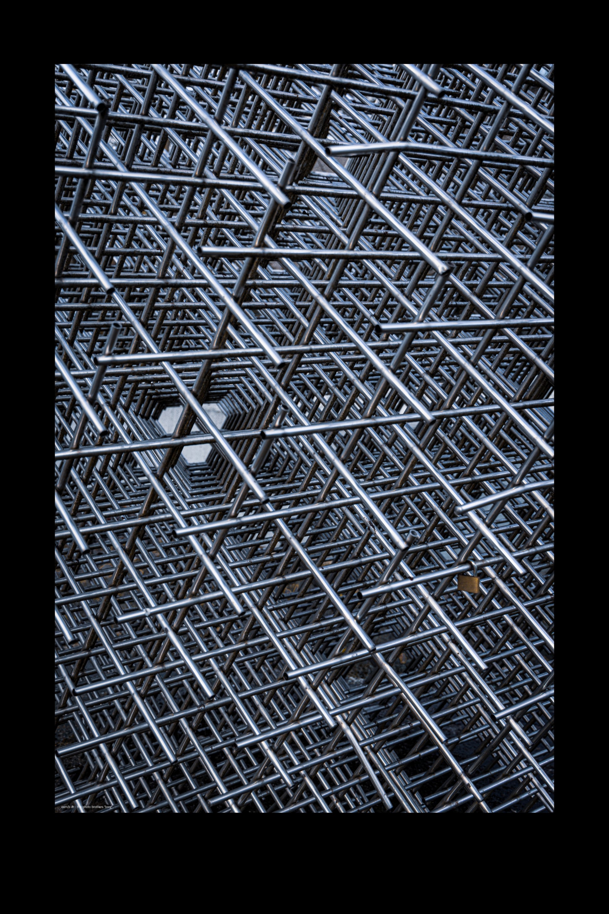 Die Gitterkugel „Sphère – trames“ vor dem Berufskolleg Wuppertal (BKWB) wiegt ca. 750 KG und wurde im Oktober 1978 der Öffentlichkeit übergeben. Das Kunstwerk stammt vom französischen Künstler Francois Morellet (Fotograf: DE, 2023).