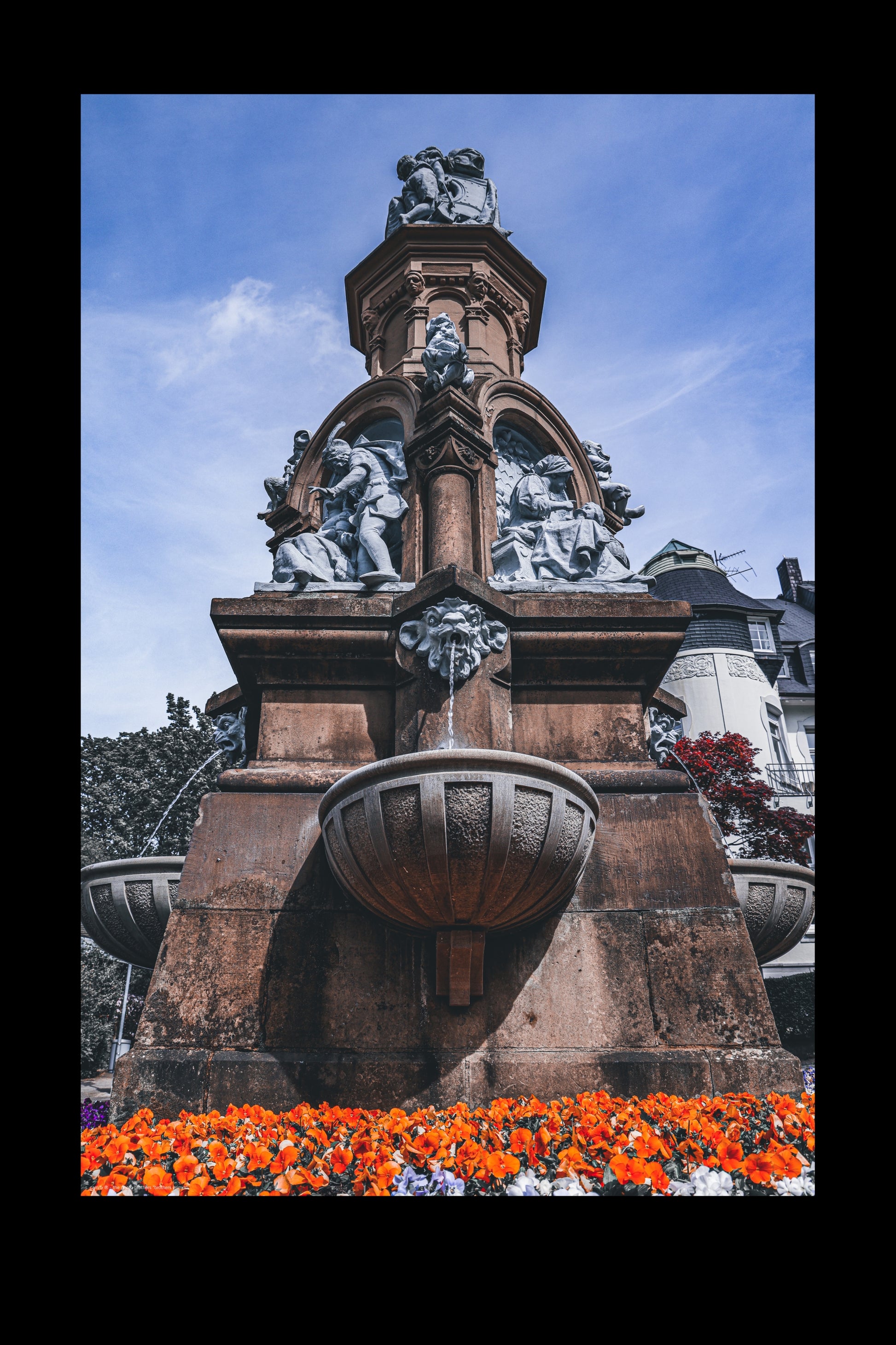 Schönes Bild des Märchenbrunnens im Wuppertaler Zooviertel. Hierauf befinden sich viele Figuren aus den Märchen der Gebrüder Grimm. Der Brunnen wurde 1897 aus Sandstein erbaut, die Figuren stammen aus der Hand des Kölner Bildhauers Wilhelm Albermann (Fotograf: DE, 2024).