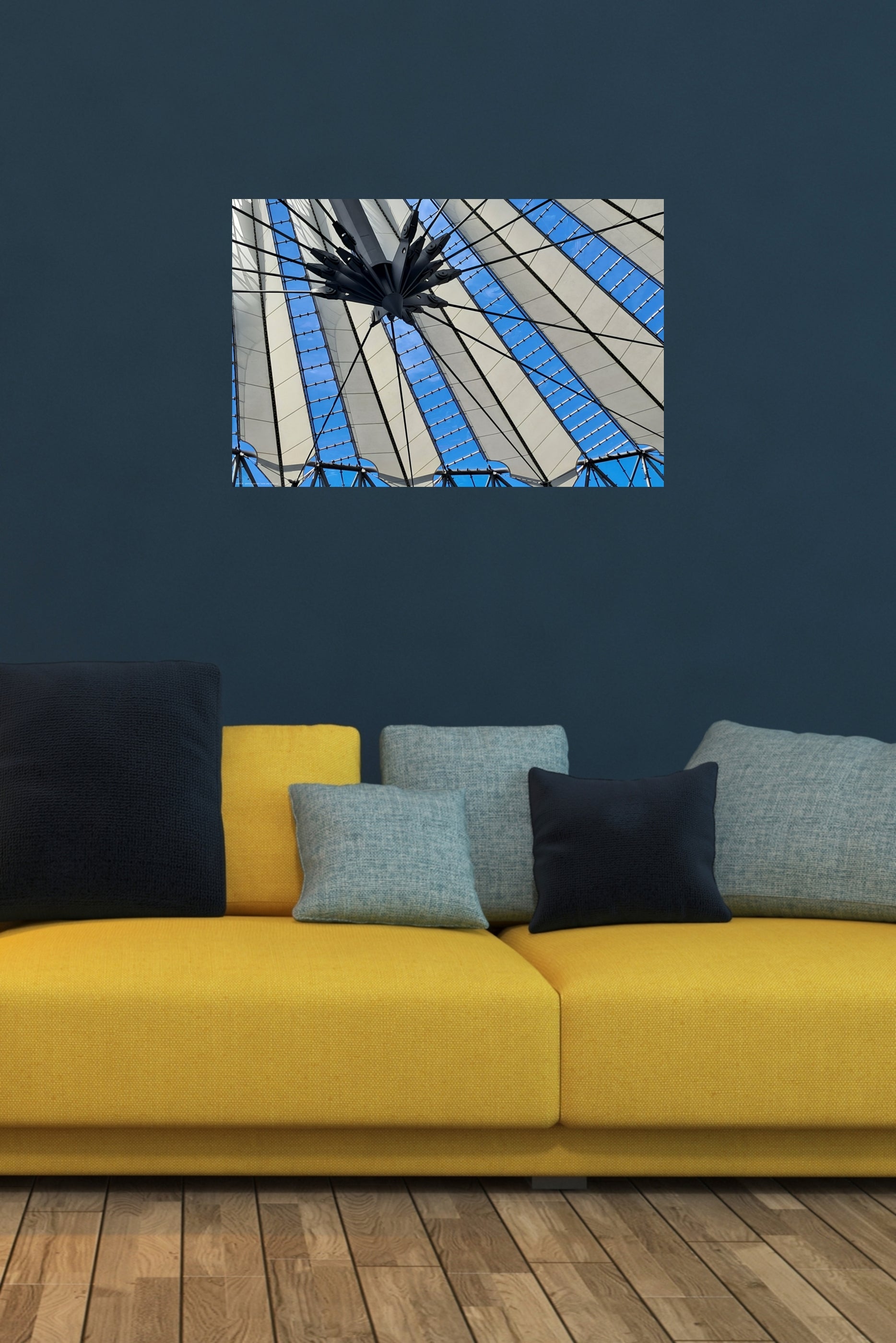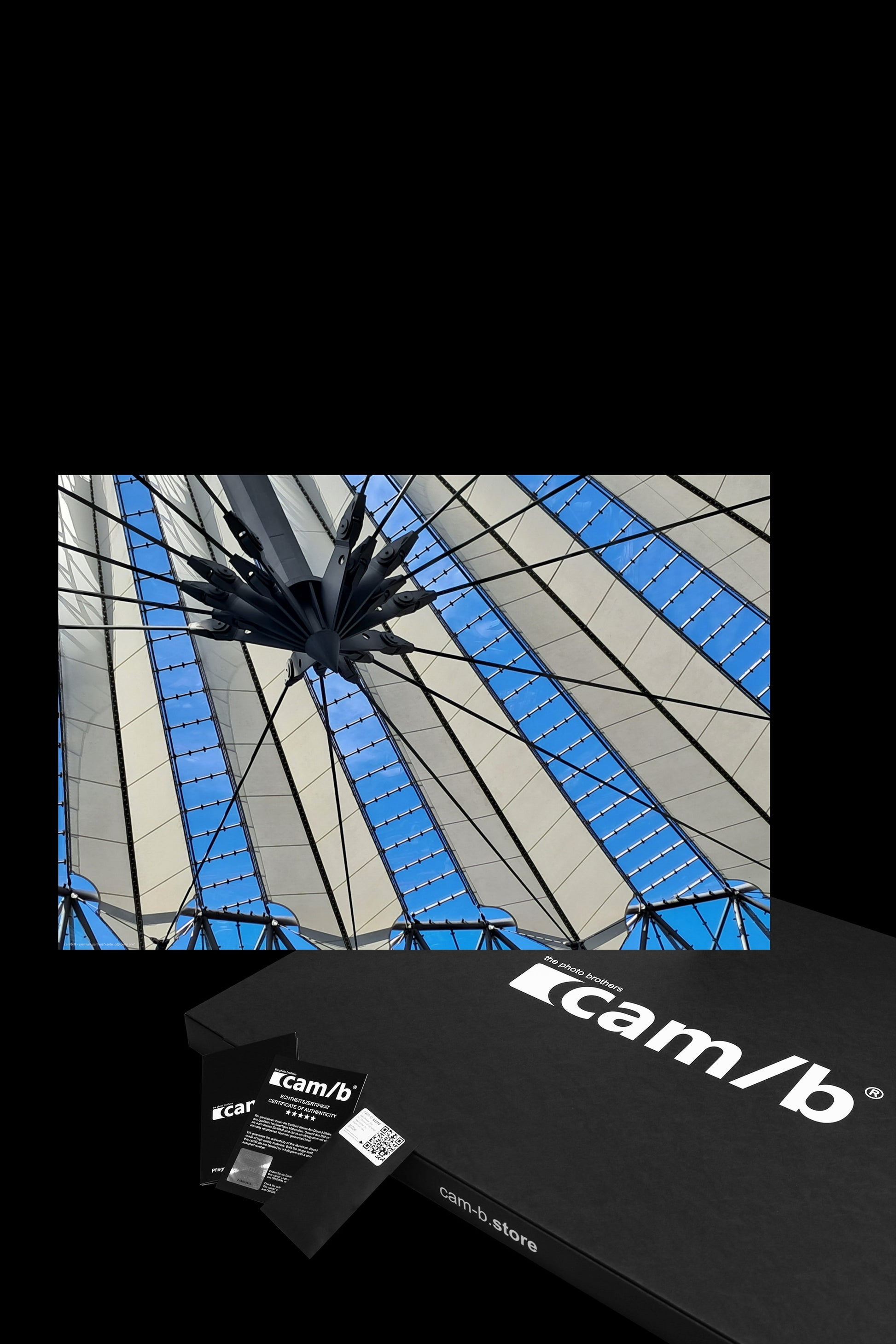 Ein Blick in die Konstruktion: Diese Aufnahme zeigt das Zentrum des Zeltdachs am Potsdamer Platz in Berlin. Strahlenförmig spannen sich Seile und Träger zwischen lichtdurchfluteten Membranflächen. Architektur als modernes Sonnensegel – geometrisch, technisch und zugleich poetisch leicht (Fotograf: Manuel Heywinkel, 2024).