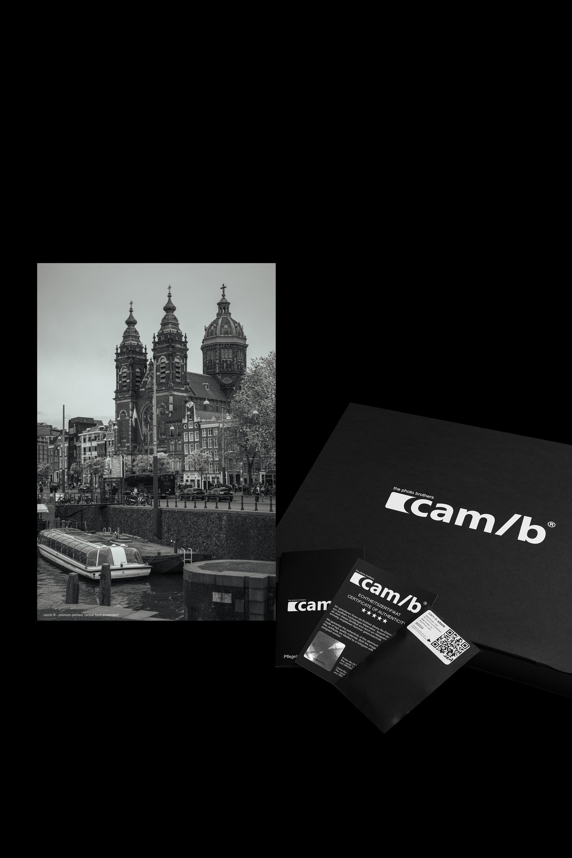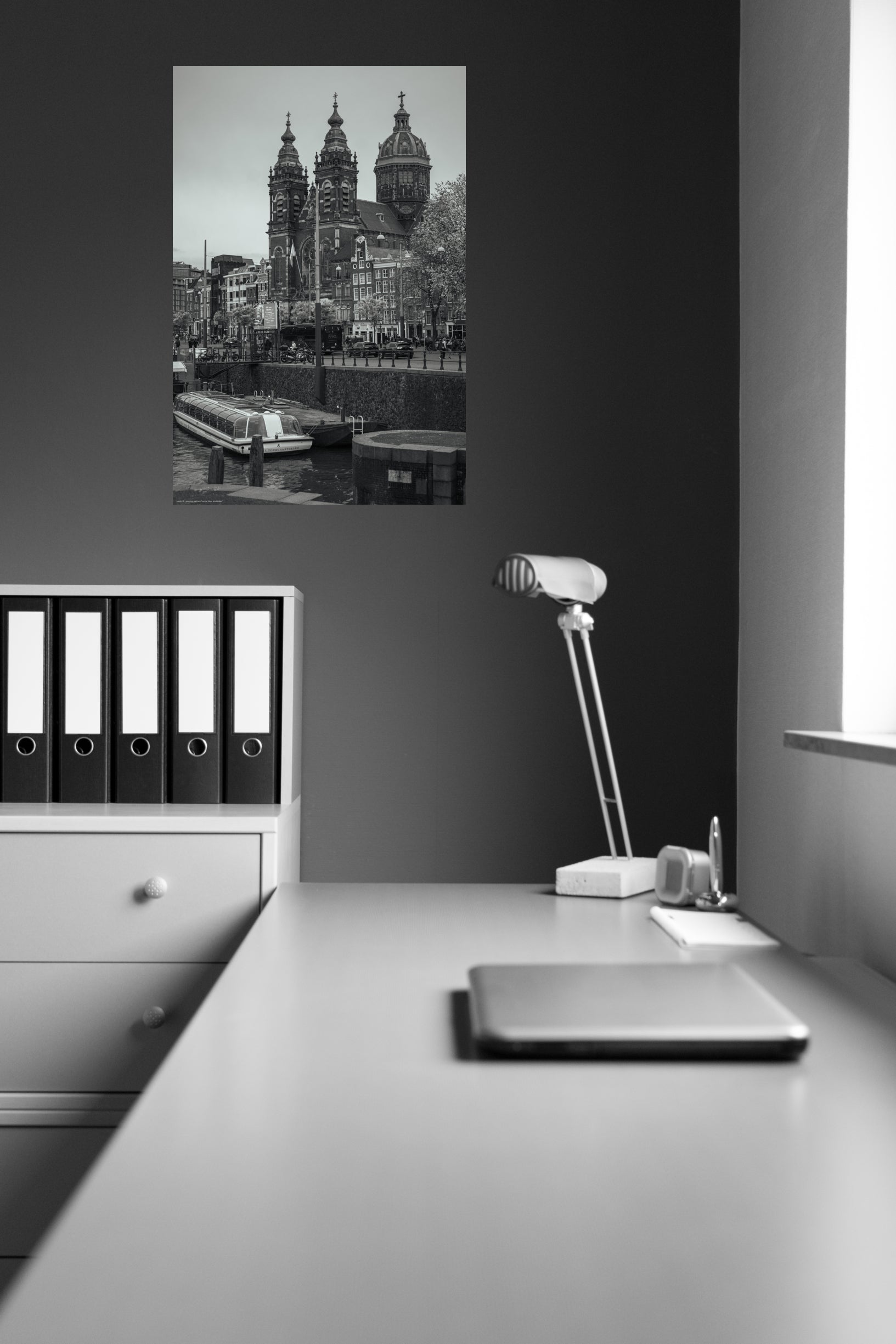 Sehr ästhetisches s/w Wandbild aus Amsterdam mit der römisch-katholischen Kirche Basilika St. Nikolaus. Im Vordergrund ein Touristenschiff der Central Tours Amsterdam (Fotograf: Luise, 2025).