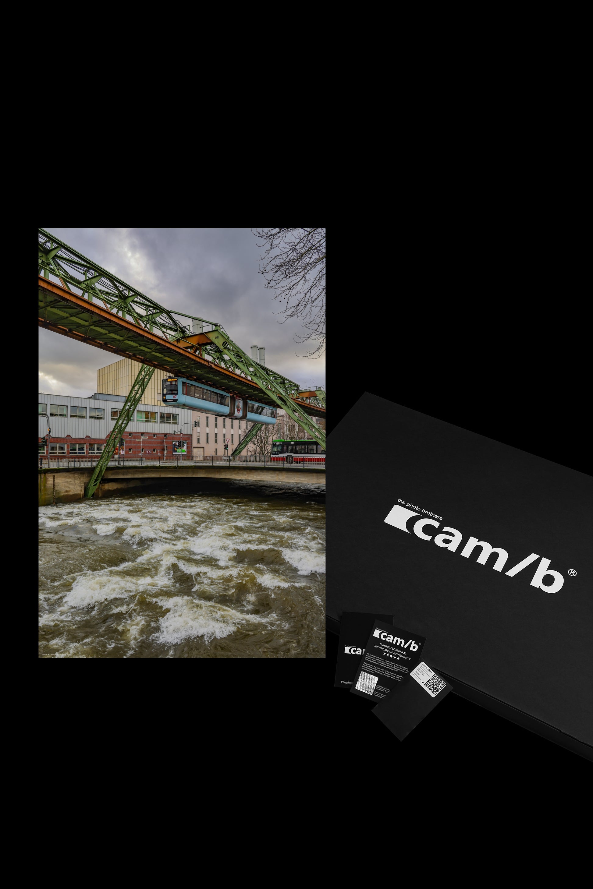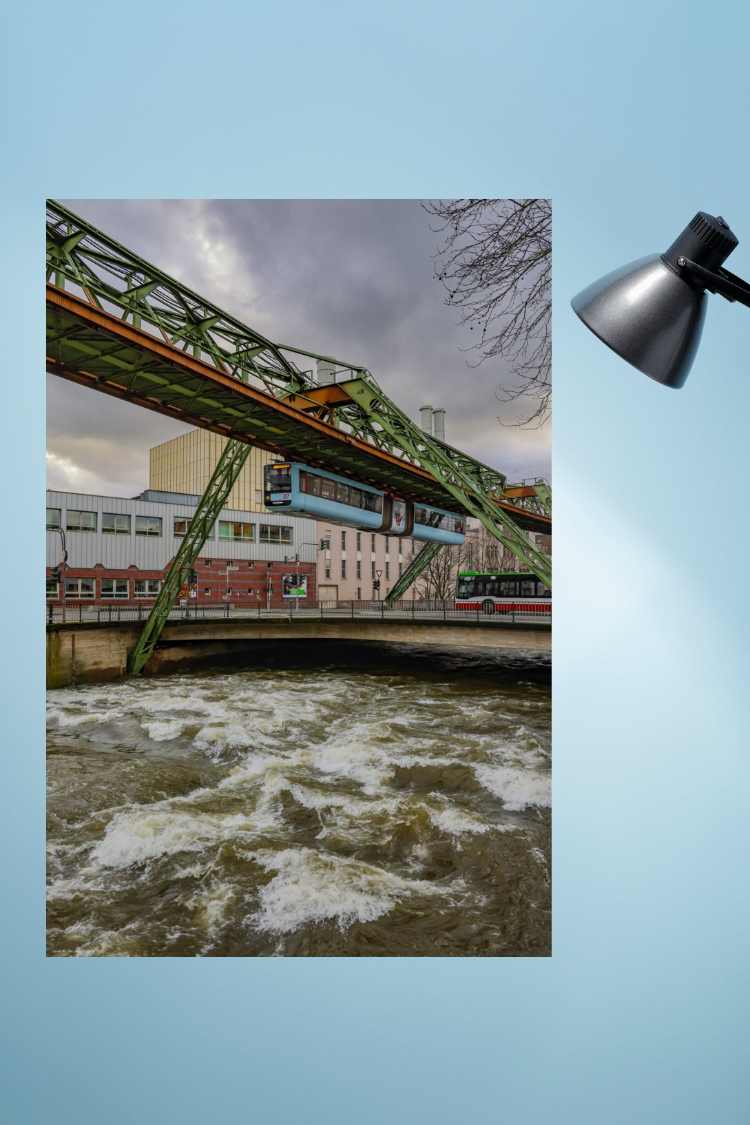 Die Wuppertaler Schwebebahn ist eines der Wahrzeichen der Stadt. Hier entlang der Wupper in Wuppertal Barmen (Fotograf: DE, 2023).