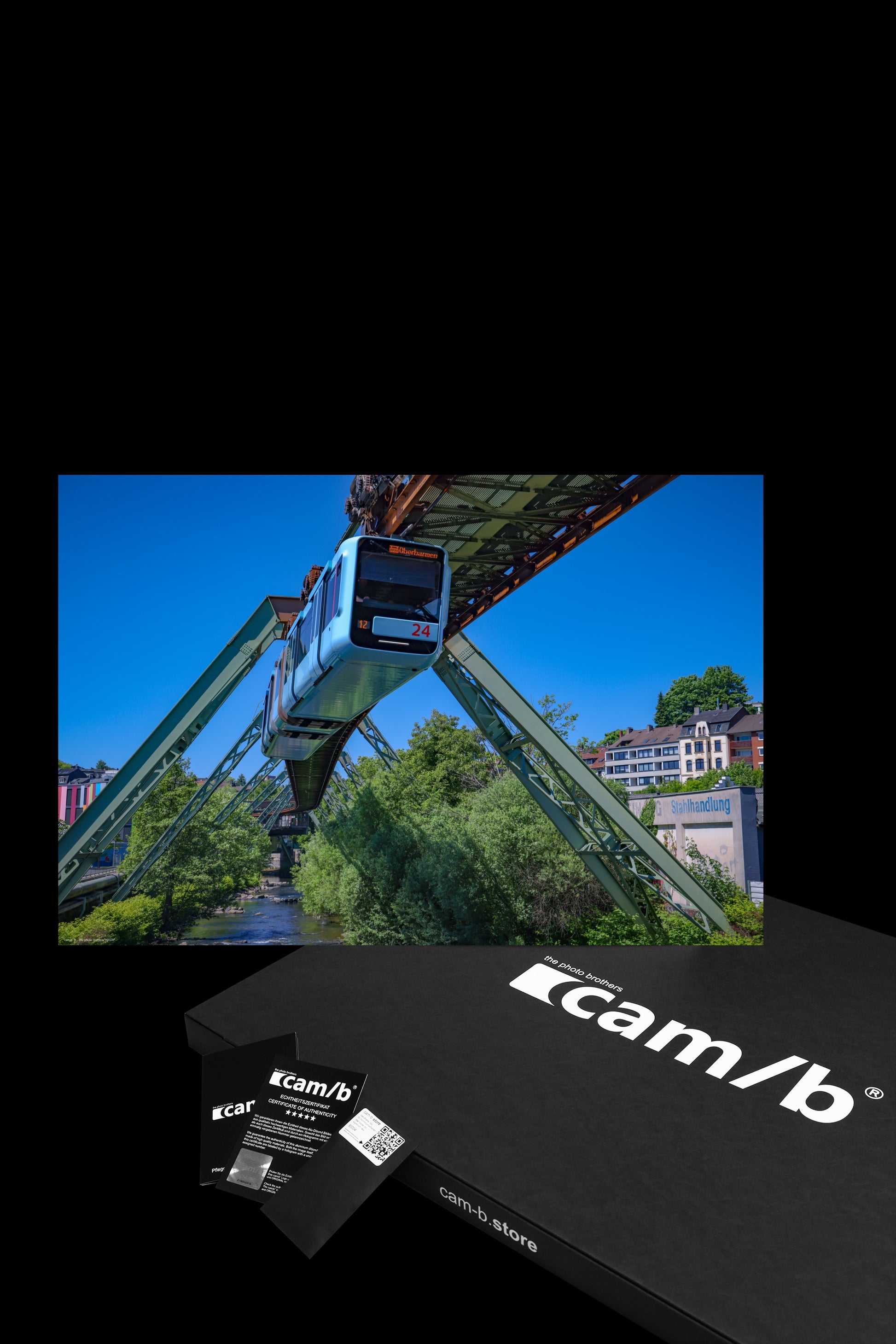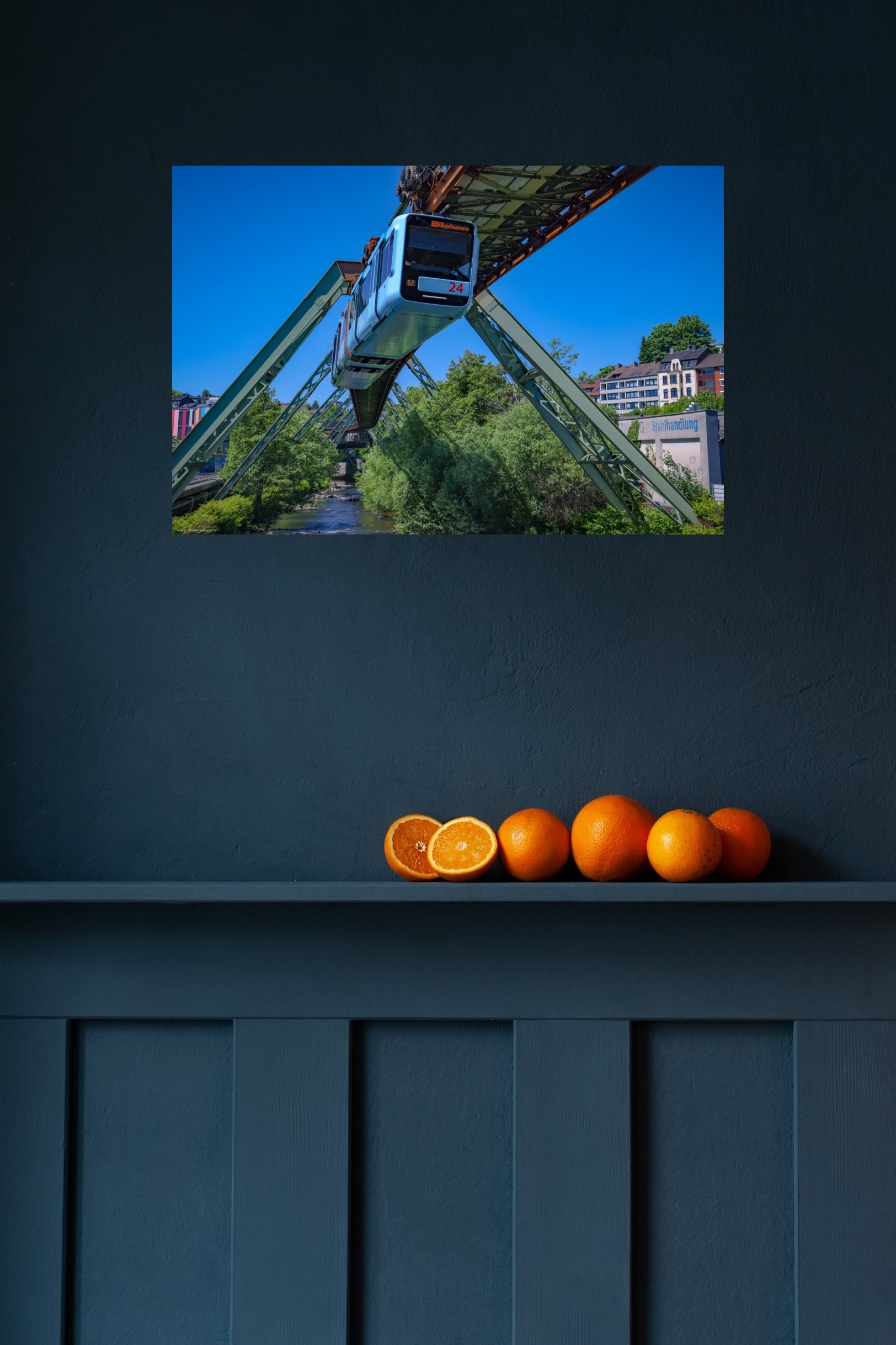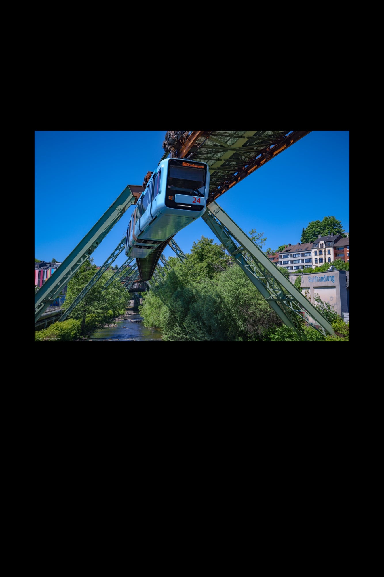 Die Wuppertaler Schwebebahn auf dem Weg Richtung Oberbarmen. Im Hintergrund rechts die Station Loher Brücke, im Hintergrund links die Junior Uni (Fotograf: DE, 2025).