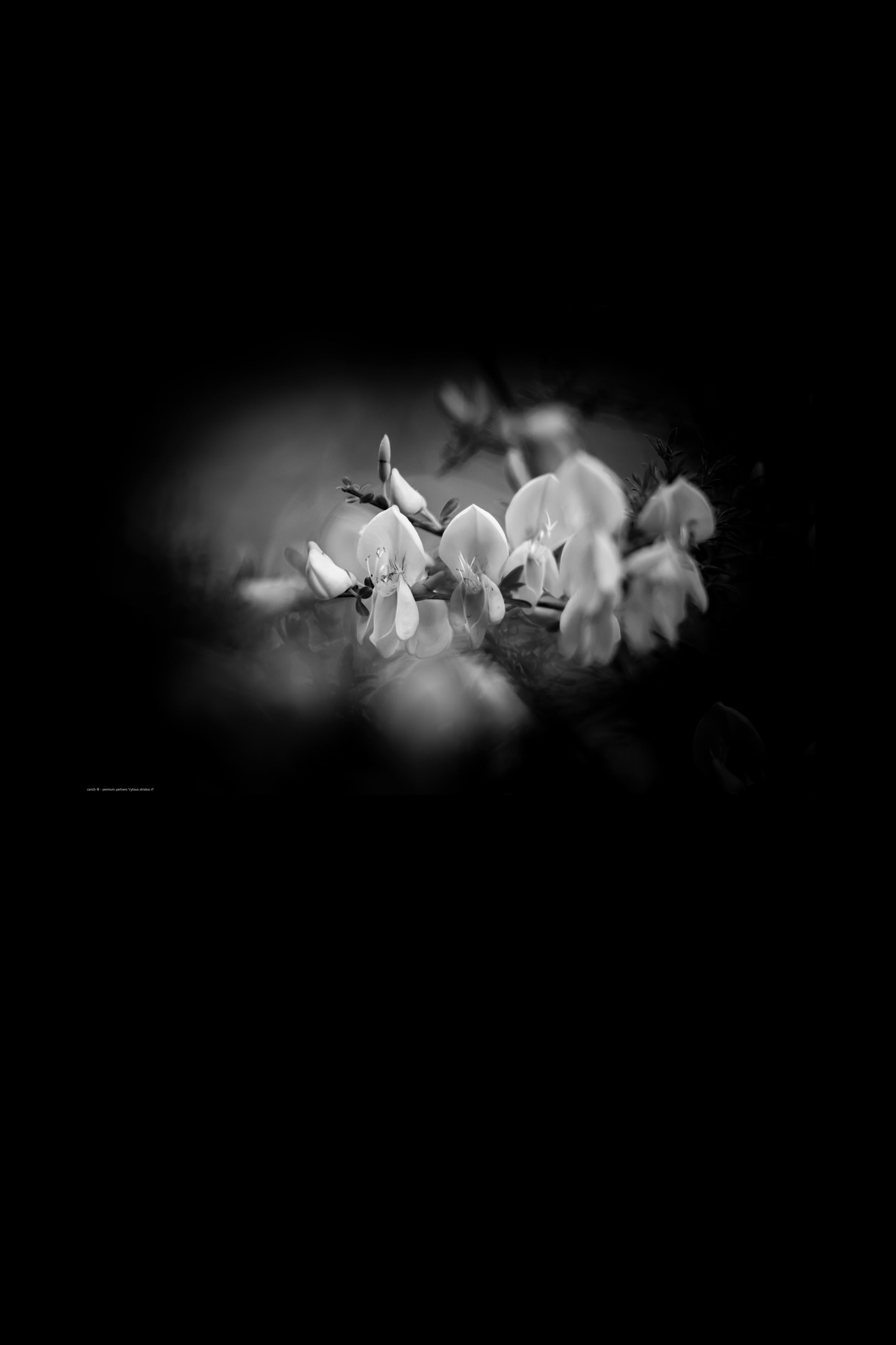 Wunderschönes schwarz-weiß Bild eines Streifenginsters mit leuchtenden Blüten (Fotograf: wuppigraphy, 2024).