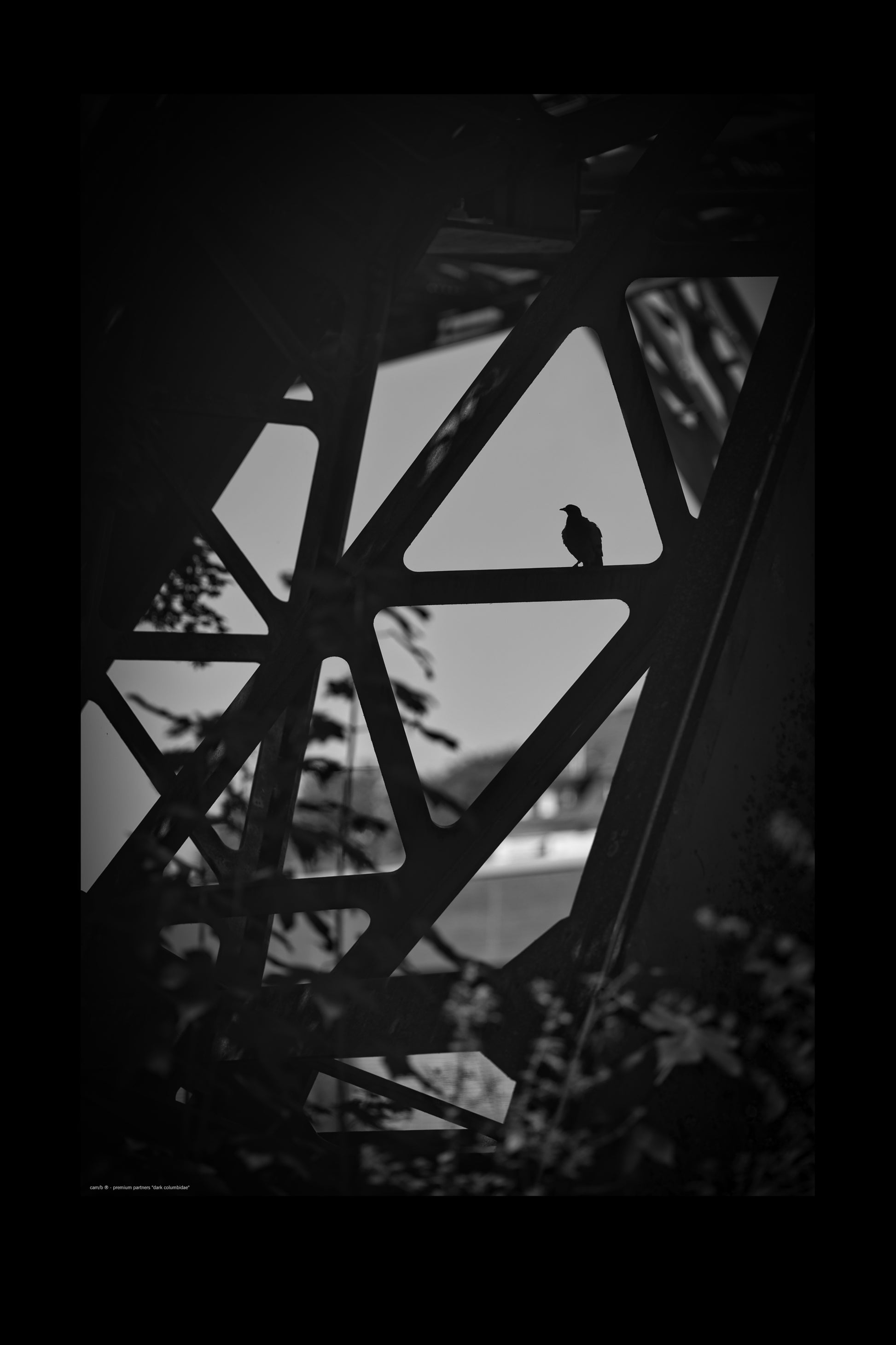 Schönes s/w Bild einer Taube bei Abenddämmerung auf dem Gerüst der Wuppertaler Schwebebahn (Fotograf: wuppigraphy, 2024).