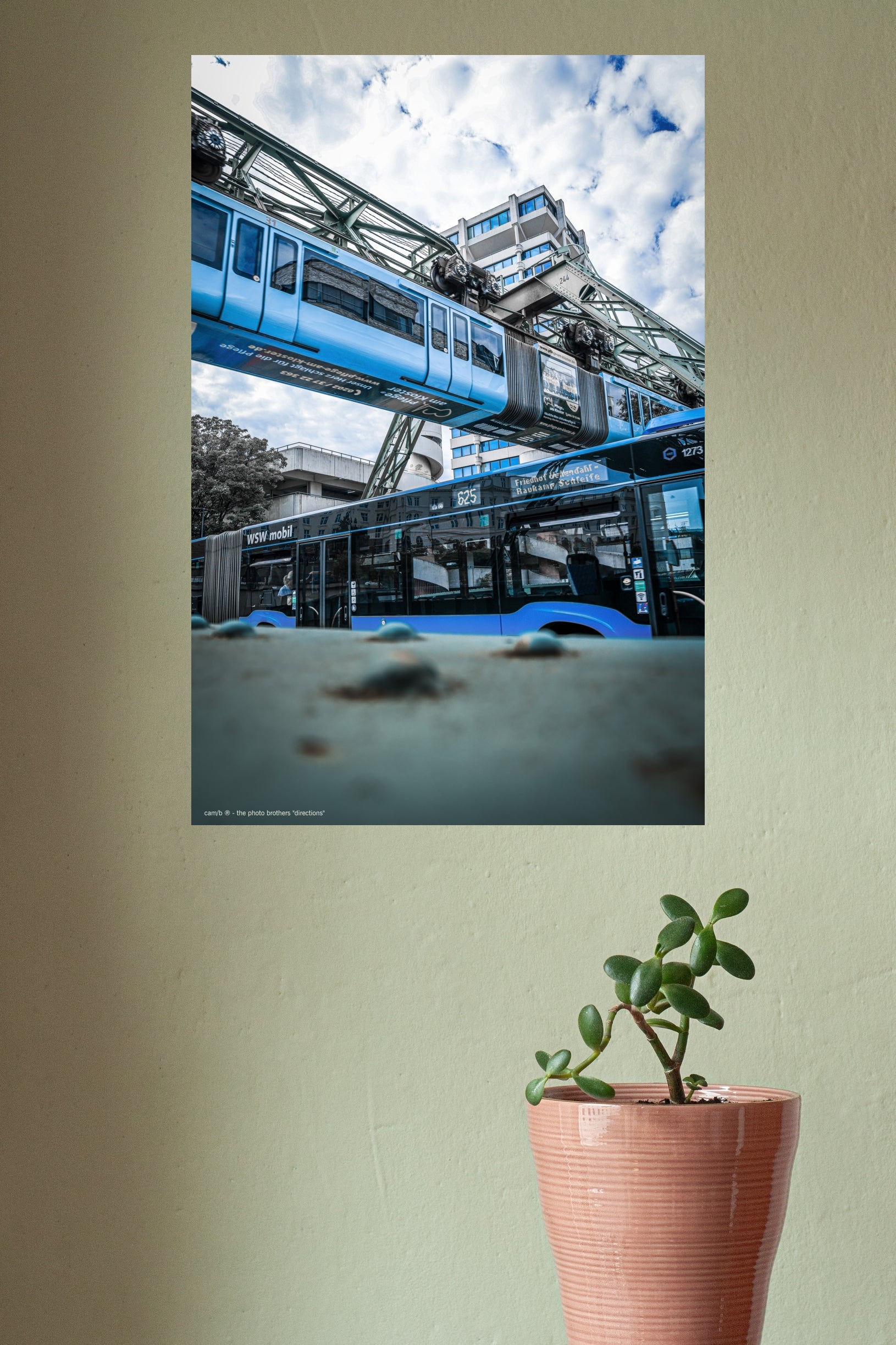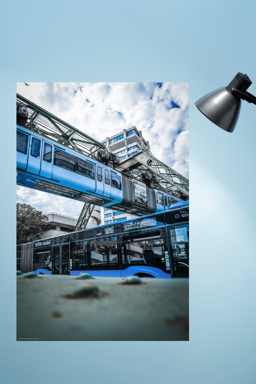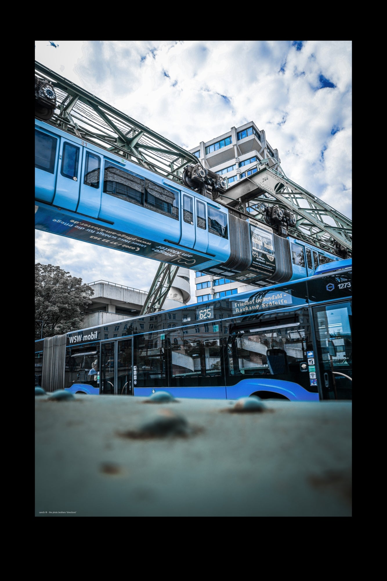 Die Schwebebahn kreuzt an vielen Stellen der Stadt Straßen und Brücken - wie hier an einer Brücke über die Wupper in Richtung Am Wall. Im Hintergrund auf diesem in einem zarten Blauton gehaltenen Wandbild das Hochhaus der Wuppertaler Stadtsparkasse (Fotograf: DE, 2025).