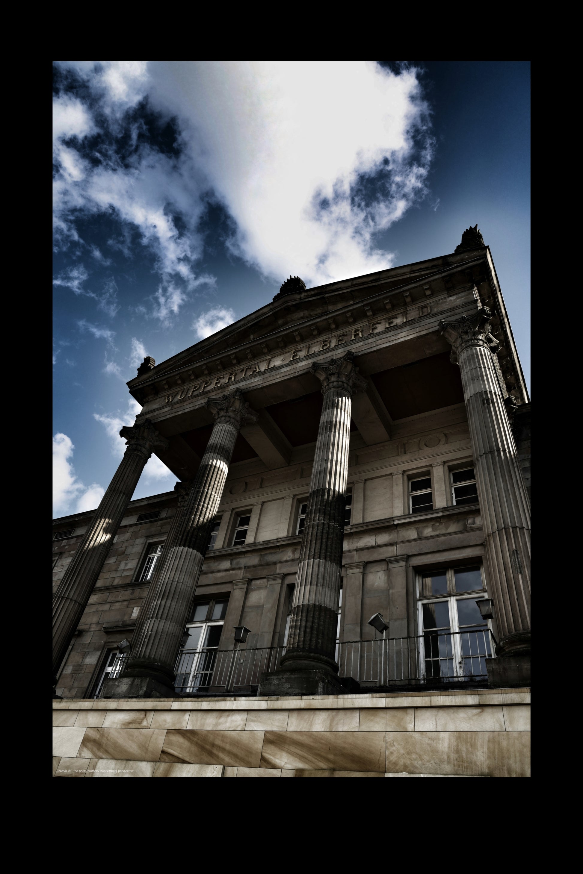 Dieses Bild in ungewöhnlicher Perspektive zeigt die historische Fassade des Bahnhofs Elberfeld Döppersberg, der jetzige Hauptbahnhof von Wuppertal (Fotograf: DE, 2022).