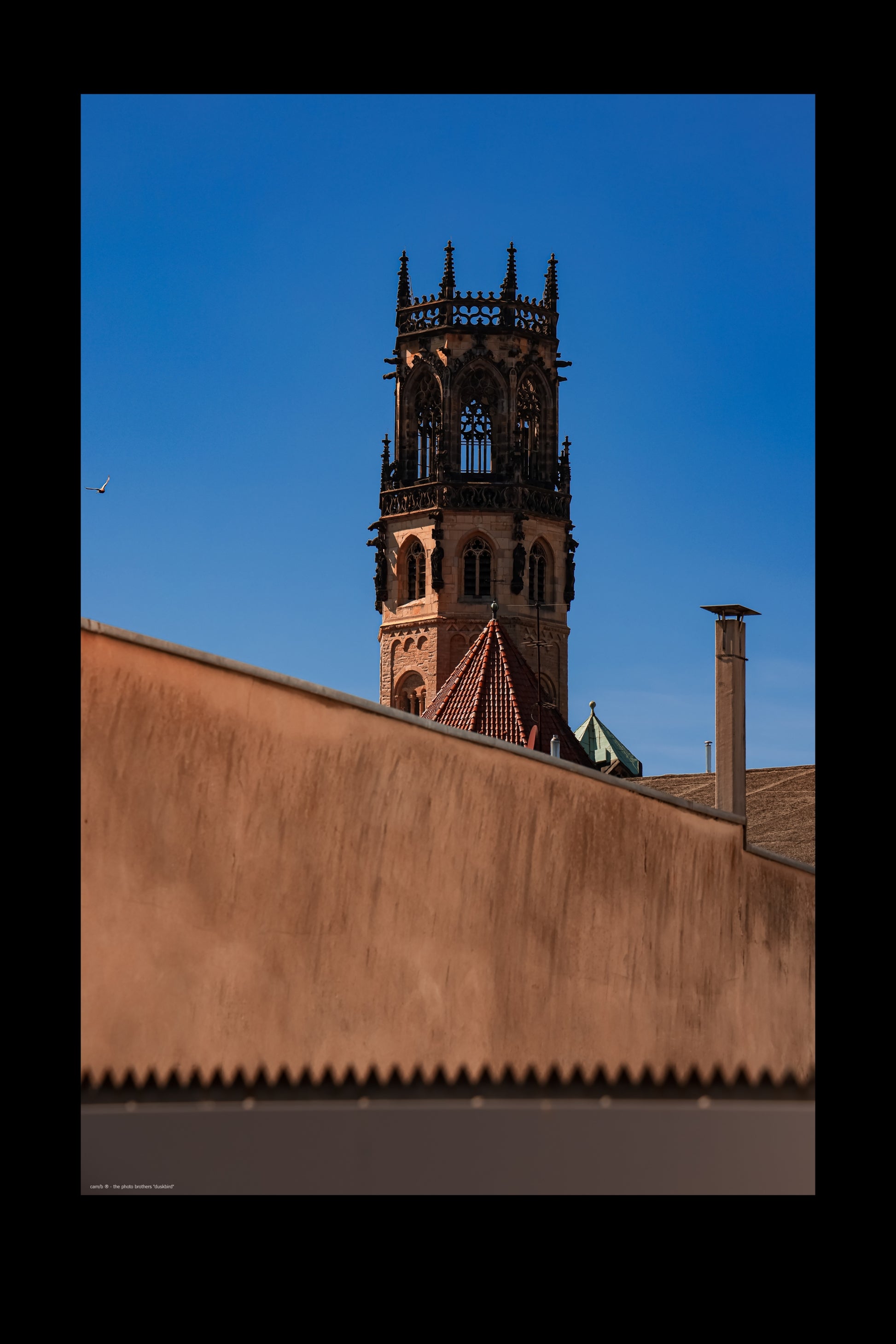 Blick vom Hinterhof auf die 1880 im Romanik Stil erbaute St. Ludgeri Kirche in Münster bei Abenddämmerung (Fotograf: DE, 2022).
