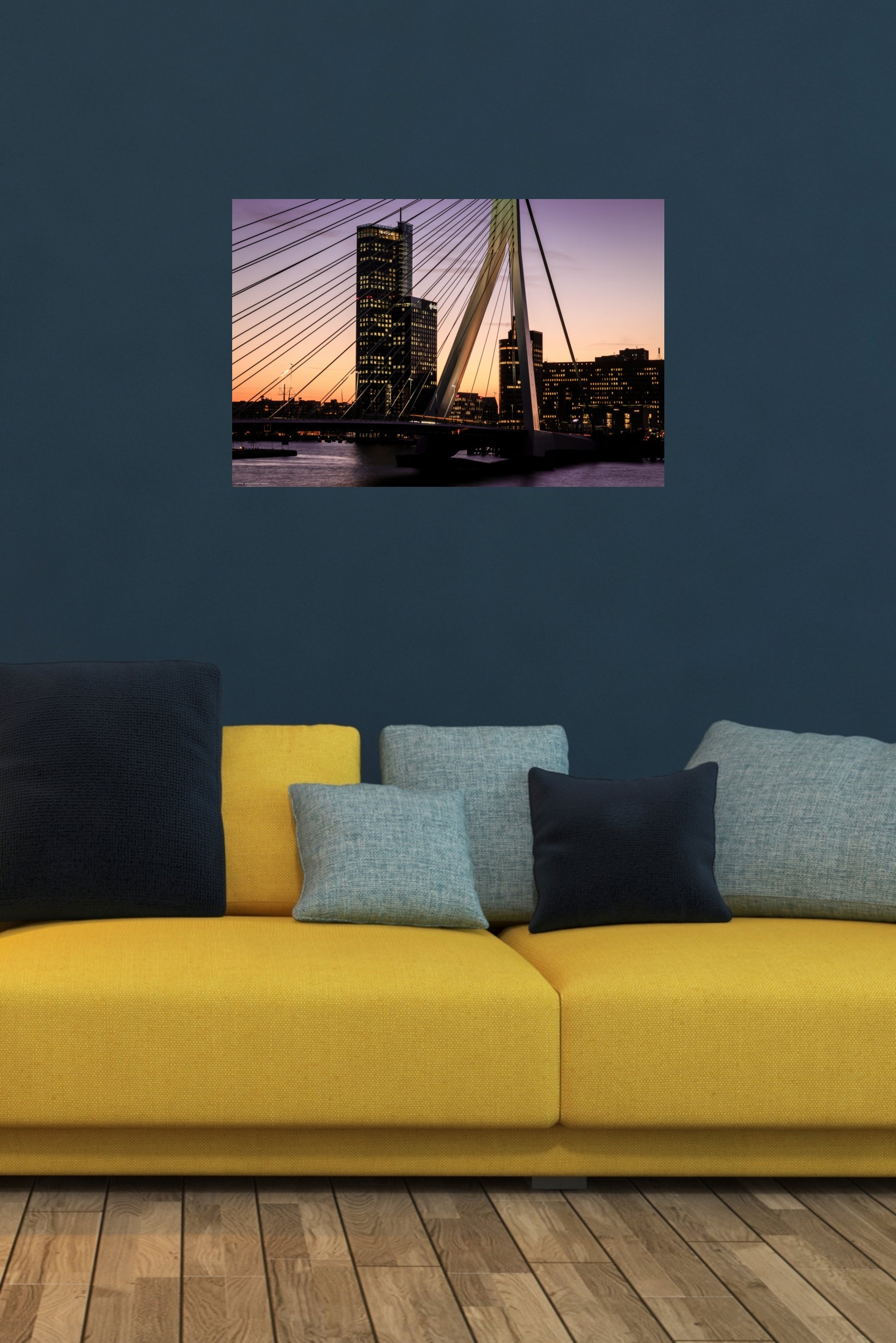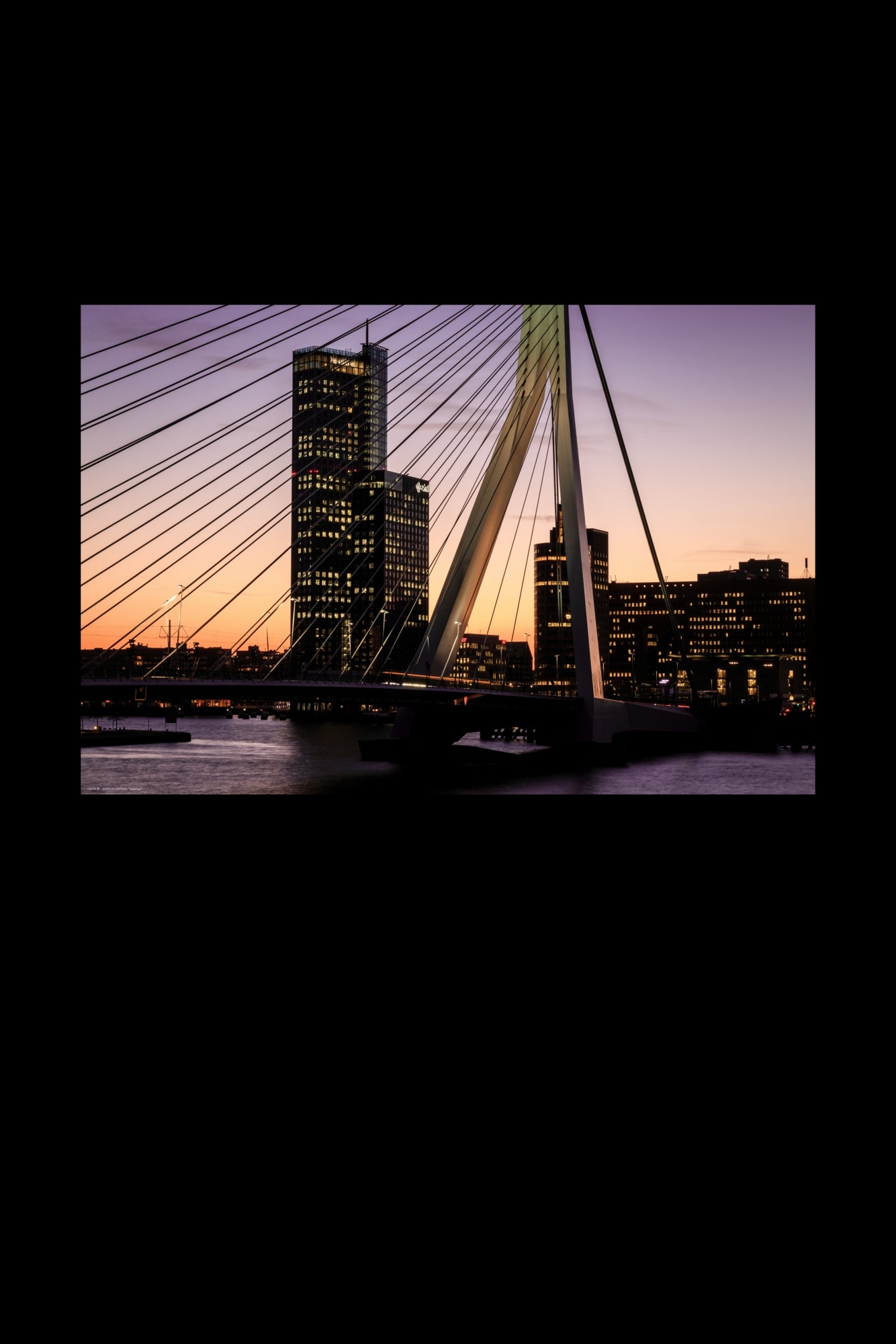 Wunderschöne Nachtaufnahme der Erasmusbrücke in Rotterdam. Die Brücke wurde im Jahr 1996 von der Königin Beatrix der Niederlande eröffnet und ist die letzte Nord-Süd Verbindung vor dem Hafen on Rotterdam und der Nordsee. Benannt wurde diese nach dem Philosophen Erasmus von Rotterdam. Besonders markant ist der 139 Meter hohe Pylon (Fotograf: Shadowart Photography, 2016).