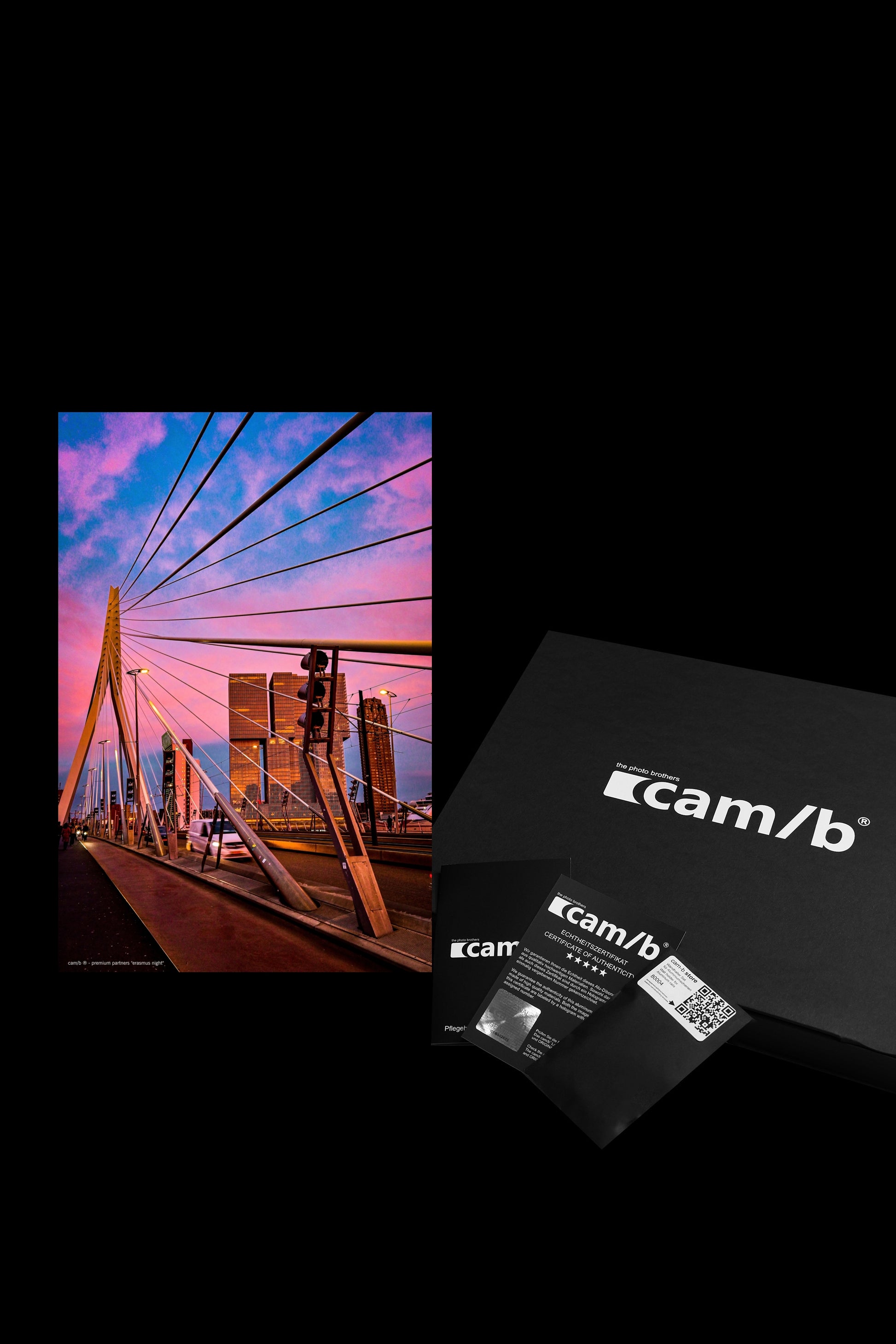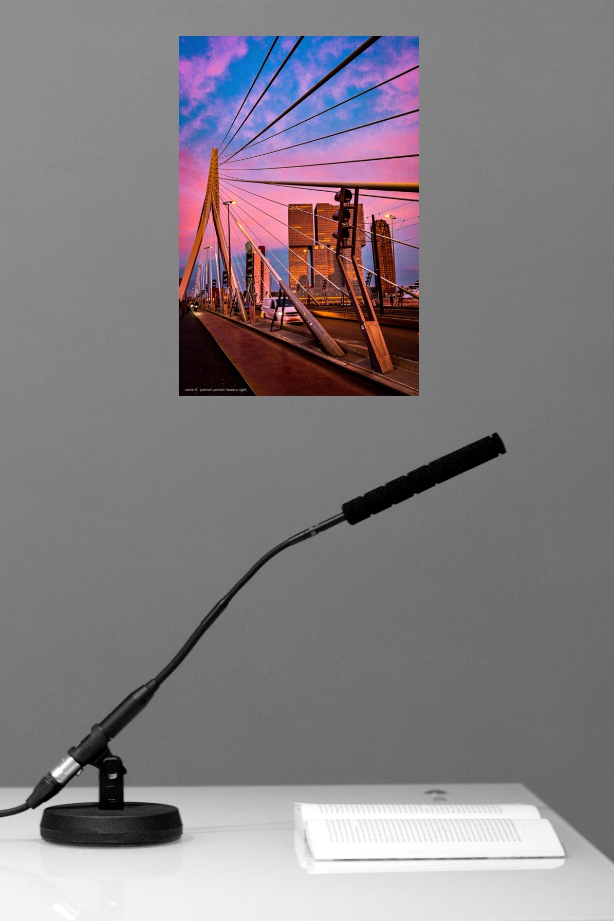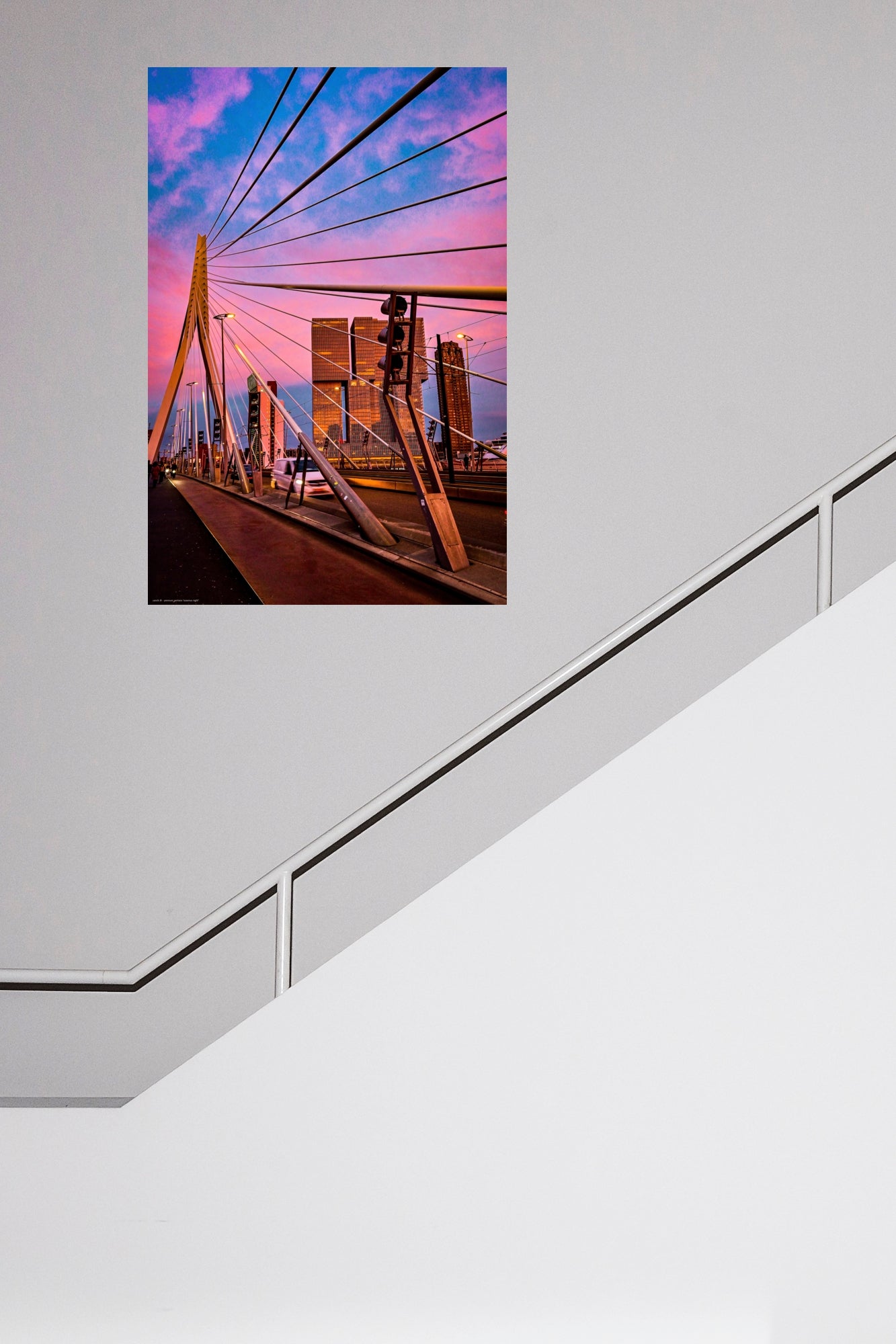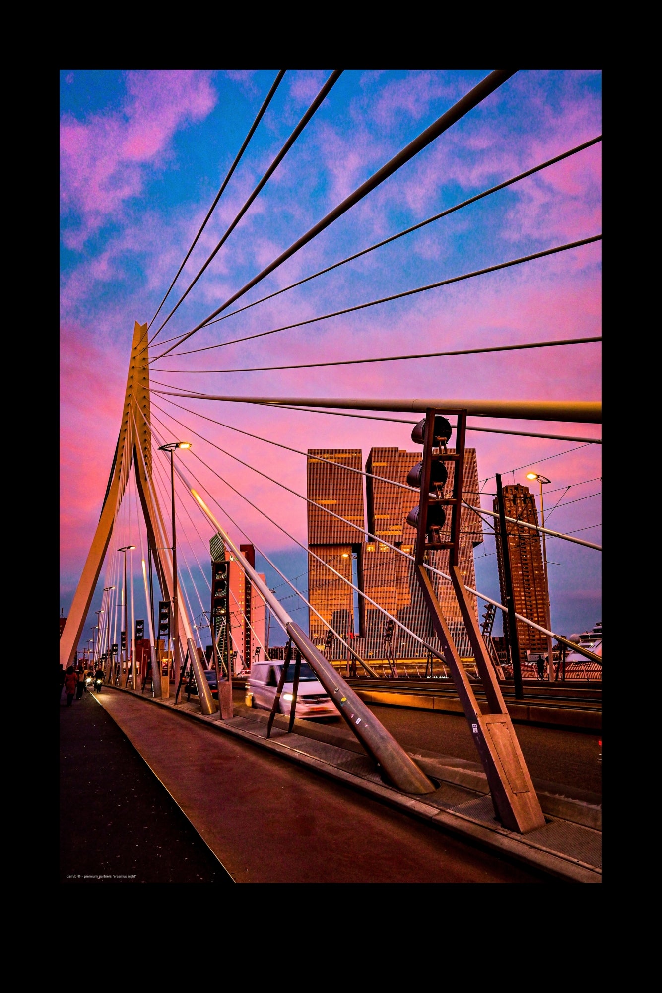 Eine phantastische Fotografie der Erasmusbrücke in Rotterdam in der Abenddämmerung. Die Erasmusbrücke wurde im Jahr 1996 von der Königin Beatrix der Niederlande eröffnet und ist die letzte Nord-Süd Verbindung vor dem Hafen on Rotterdam und der Nordsee. Besonders markant ist der 139 Meter hohe Pylon (Fotograf: Christian Horenkamp, 2024).