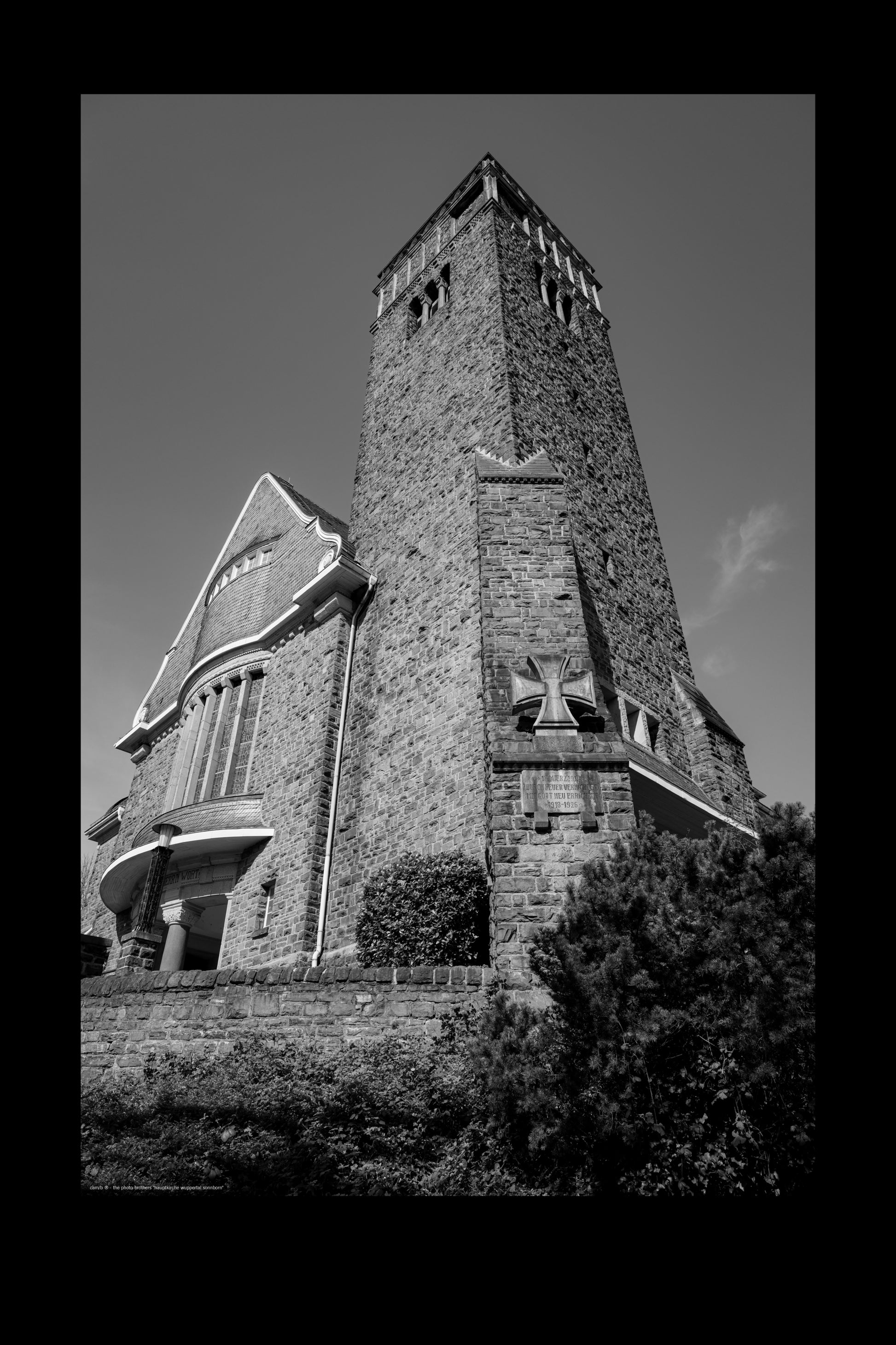 Die evangelische Hauptkirche Sonnborn steht auf einer Anhöhe in direkter Näher der Wupper und der Schwebebahn. Von der Freitreppe aus hat man eine schöne Sicht auf das Stadion am Zoo (Fotograf: DE, 2024).