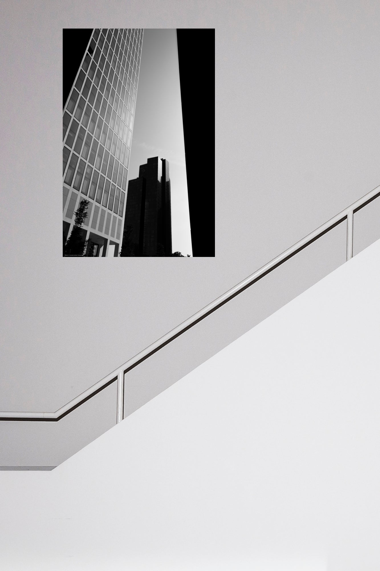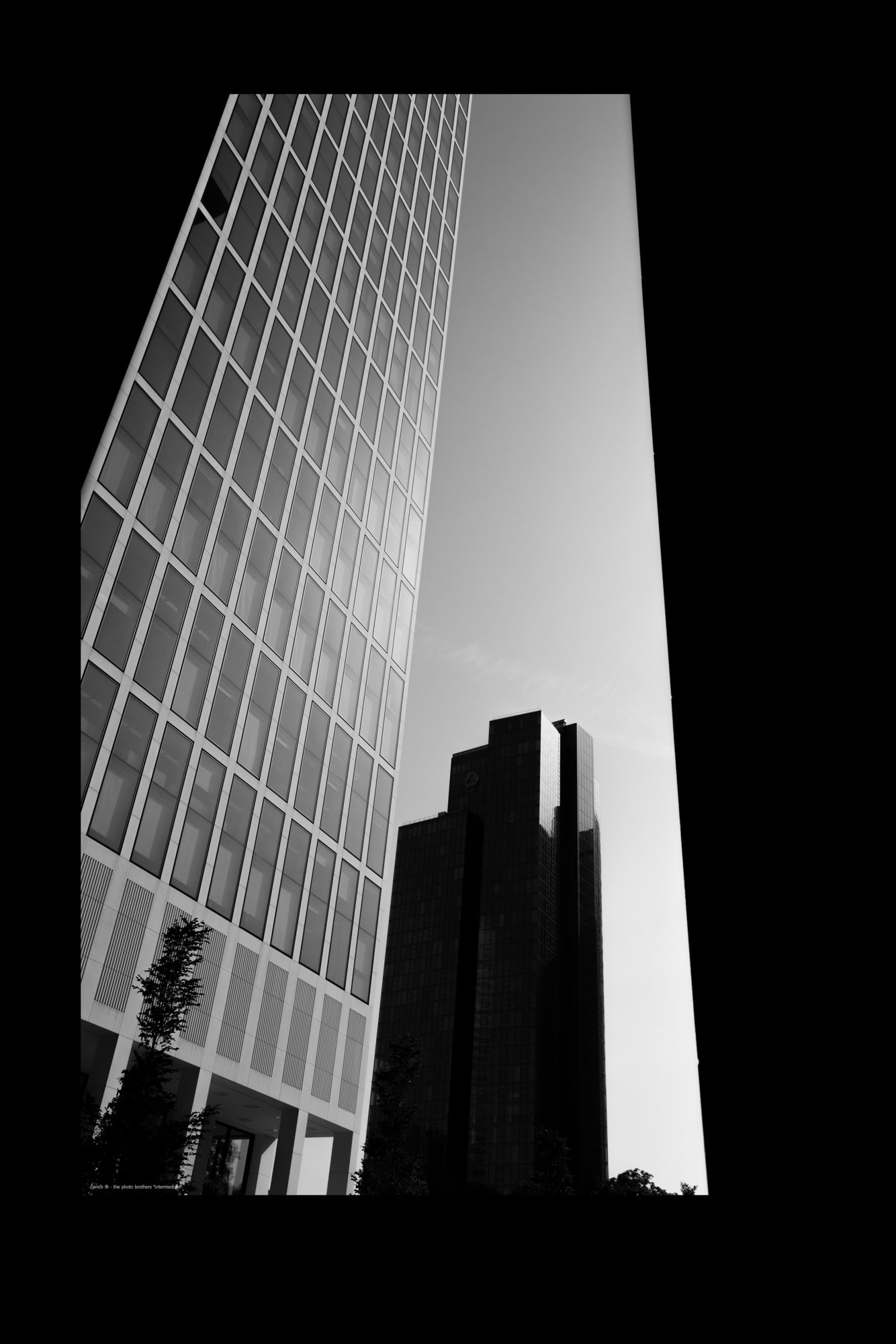 Blick zwischen die Wolkenkratzer in Frankfurt am Main in einem faszinierenden schwarz-weiß Edit (Fotograf: DE, 2022).