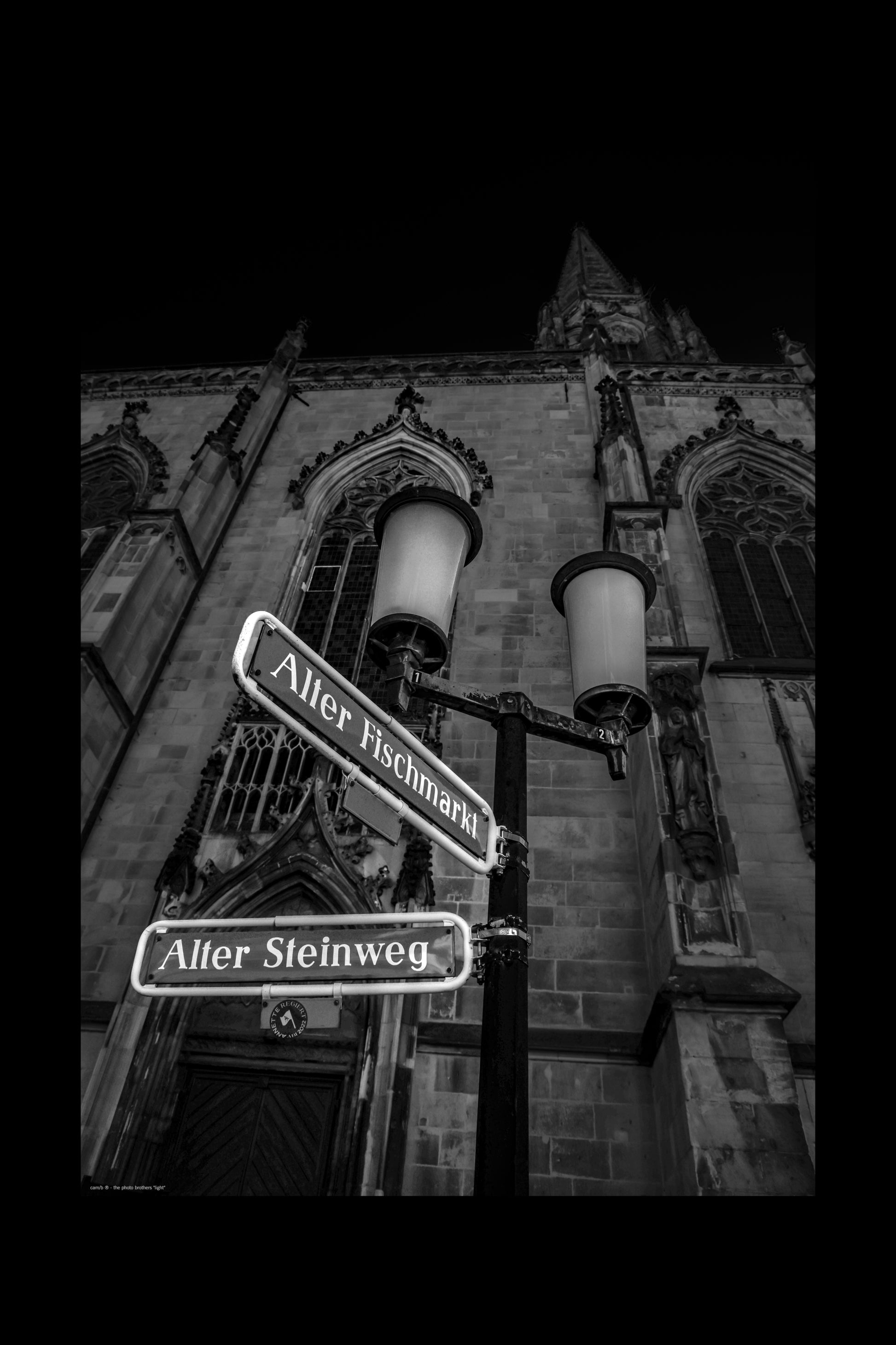 Schöne Straßenlaterne am Alten Fischmarkt in Münster. Im Hintergrund die römisch-katholische Kirche St. Lamberti (Fotograf: DE, 2022).
