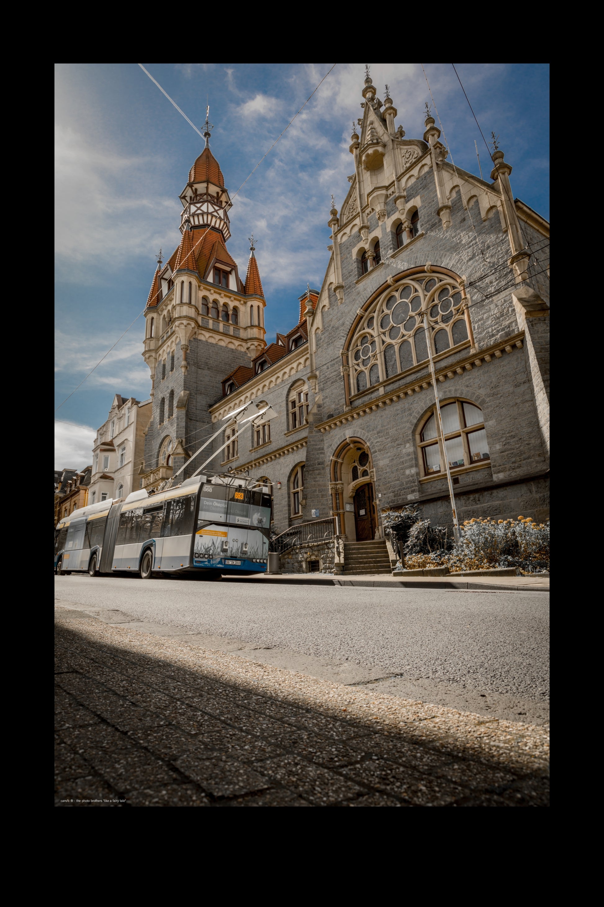 Blick auf das historistische Rathaus Wuppertal Vohwinkel - markant ist der 38,50 m hohen Turm. Erbaut wurde das Rathaus 1897 bis 1898. Im Vordergrund ein Oberleitungsbus der Linie 683 der Stadtwerke Solingen (Fotograf: DE, 2024).