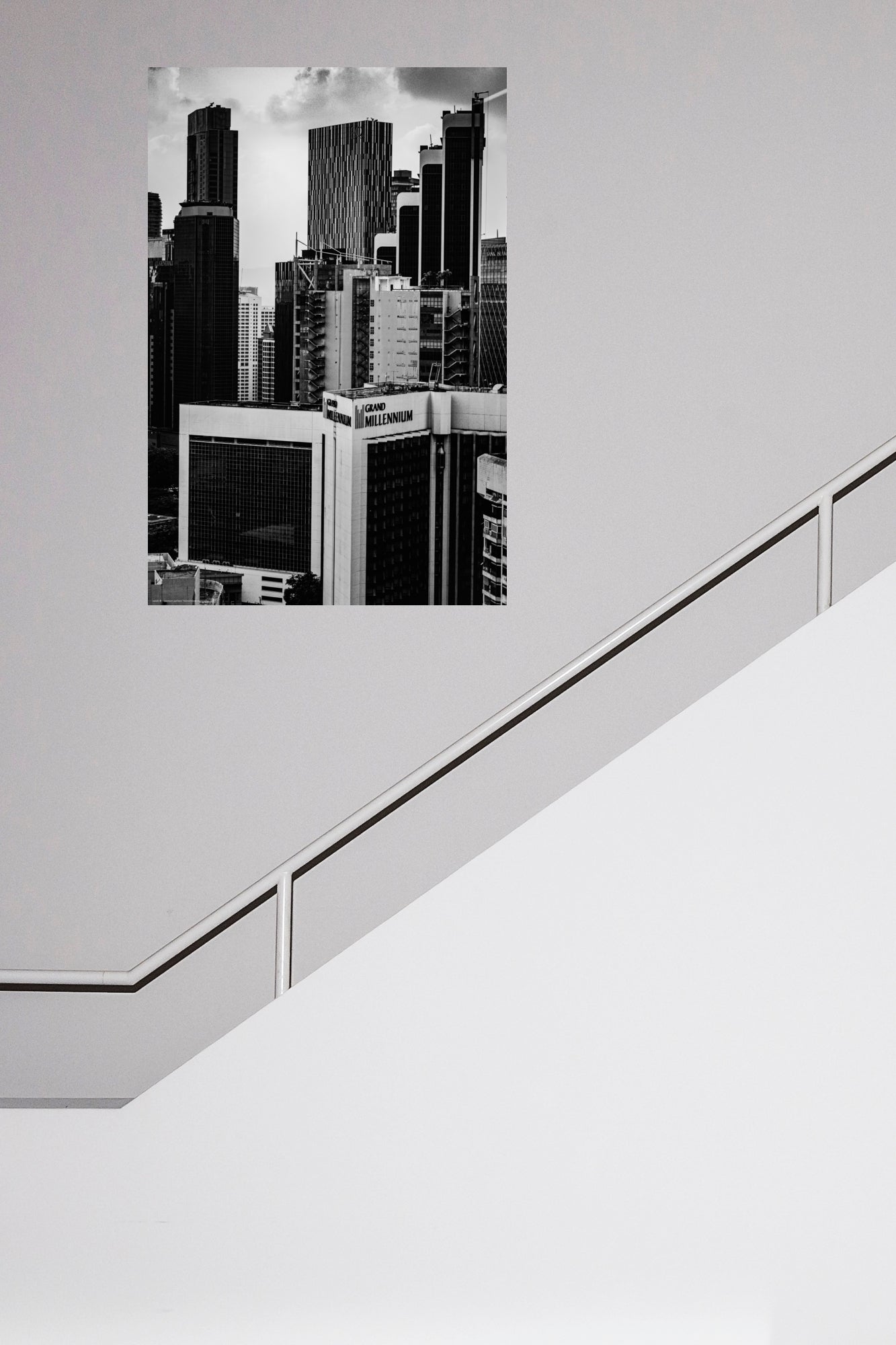 Holen Sie sich mit diesem eindrucksvollen Wandbild die zeitlose Eleganz moderner Architektur in Ihre Räume. Die Schwarz-Weiß-Fotografie fängt die Skyline von Kuala Lumpur in einem Moment purer Klarheit ein. Im Zentrum steht das ikonische Grand Millennium, umrahmt von den kontrastreichen Texturen und geometrischen Linien der umgebenden Wolkenkratzer (Fotograf: Christian Horenkamp, 2025).
