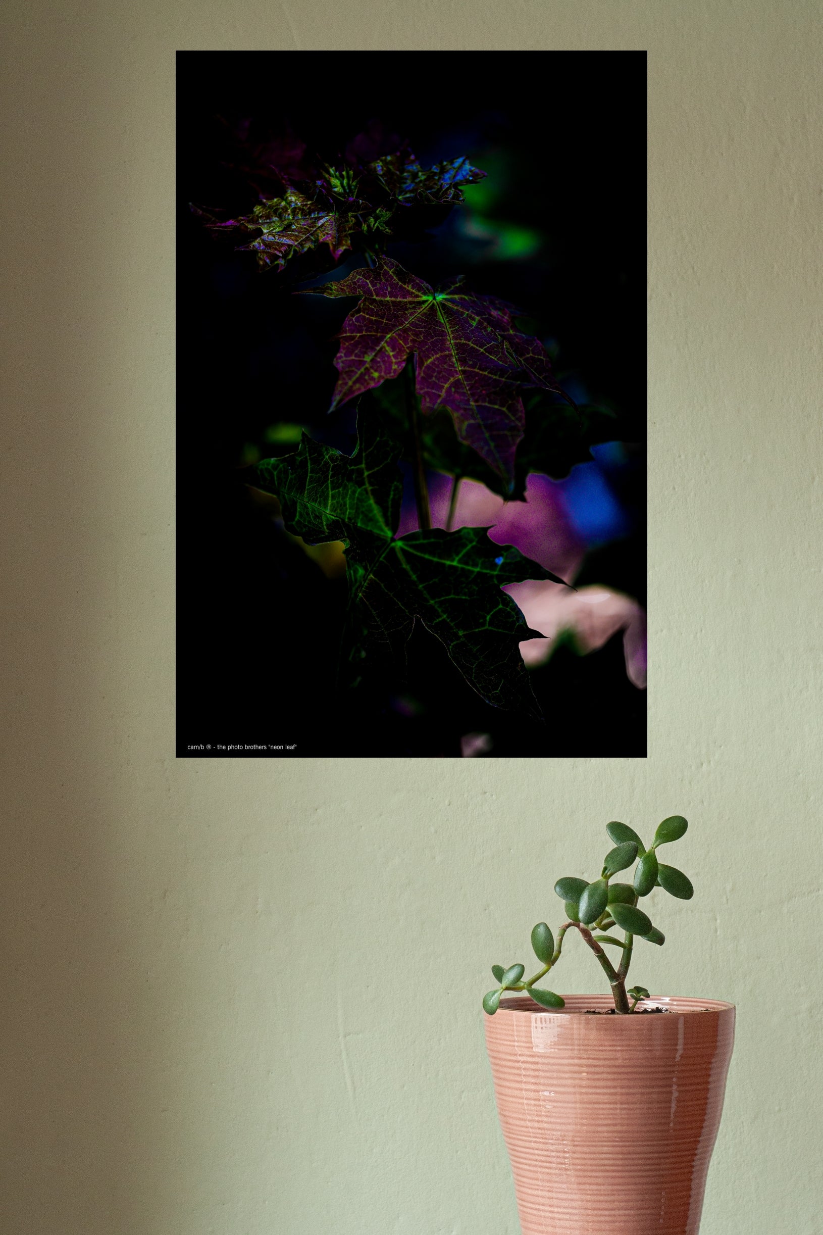 Wunderschöne Ahorn Blätter im farbigen Neon Licht und in einem phantastischen Edit (Fotograf: DE, 2024).