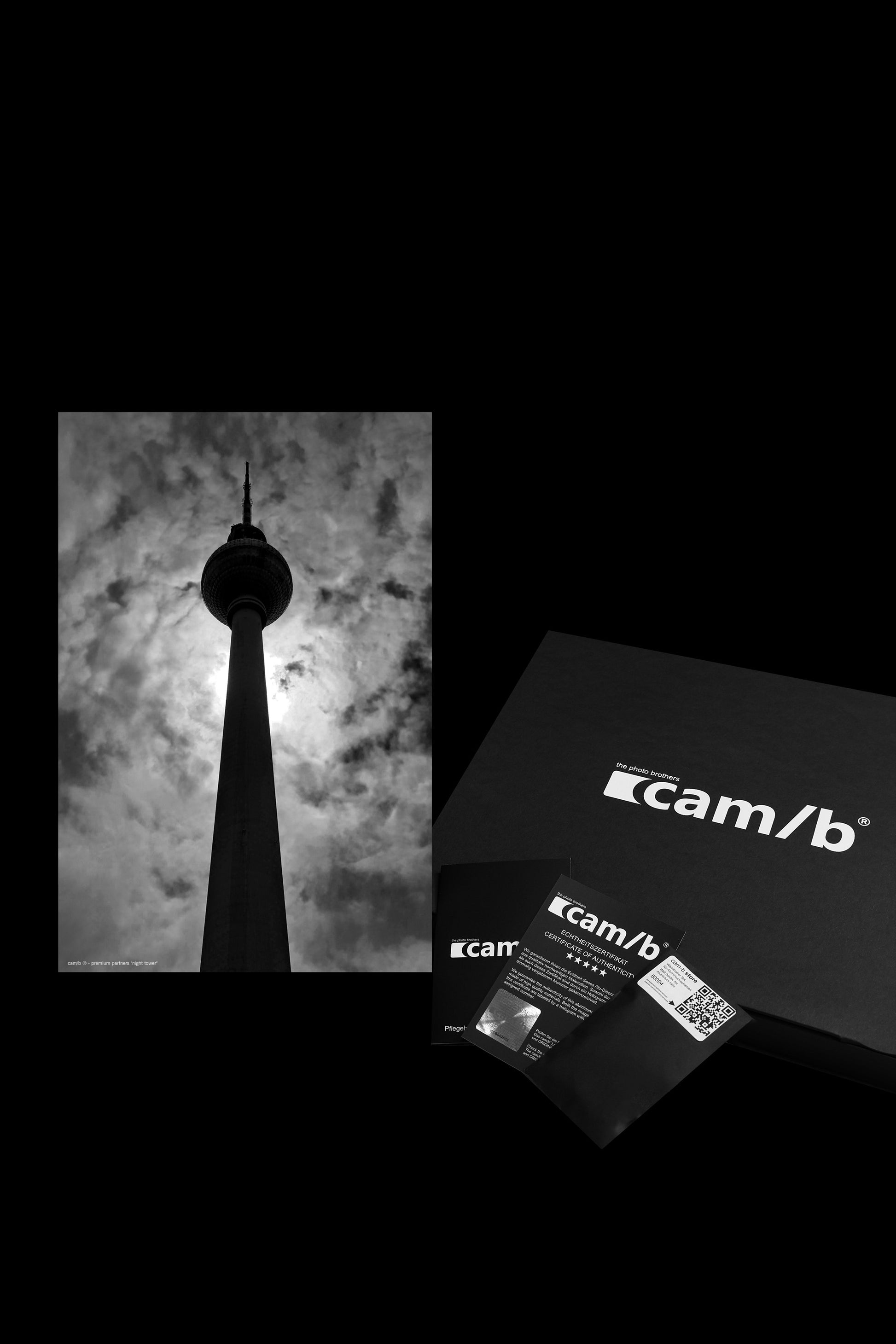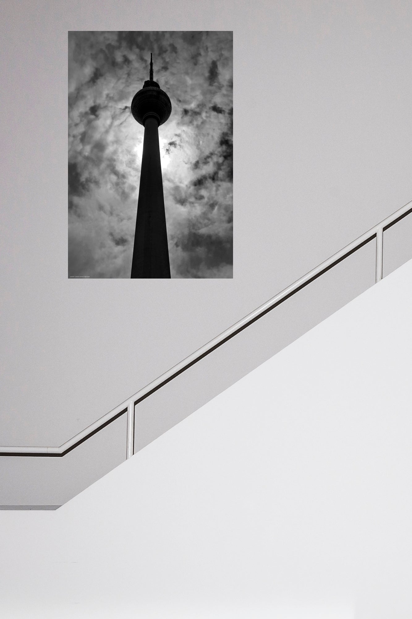 Imposantes Alu-Dibond Wandbild des Fernsehturms in Berlin am Alexanderplatz. Mit 368 Metern ist der Berliner Fernsehturm das höchste Bauwerk Deutschlands, und war 1969 sogar der zweithöchste Fernsehturm der Welt. Erbaut wurde dieser imposante Fernsehturm von der Deutschen Post der damaligen DDR von 1965 bis 1969. Anlässlich der Fußball-Weltmeisterschaft 2006 in Deutschland wurde die Turmkugel im Rahmen einer Werbeaktion als überdimensionaler Fußball beklebt (Fotograf: Manuel Heywinkel, 2025).