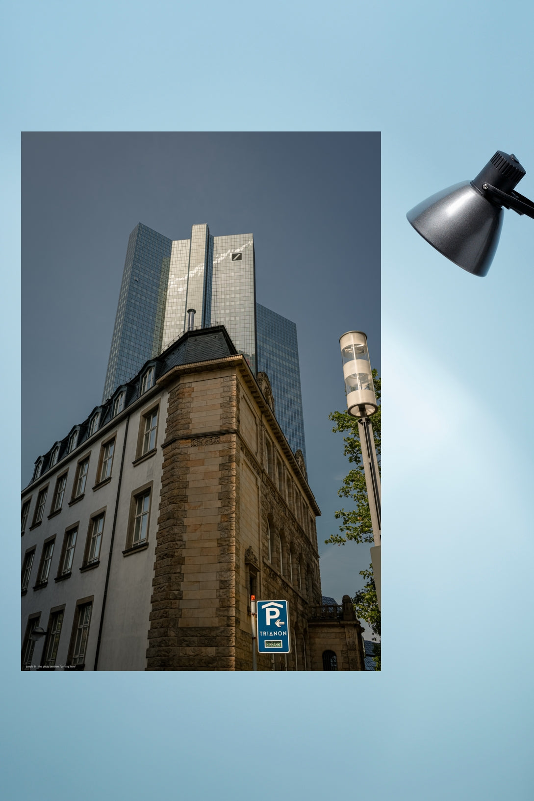 Schöne Perspektive auf das Gebäude der Deutschen Bank in Frankfurt am Main (Fotograf: DE, 2022).