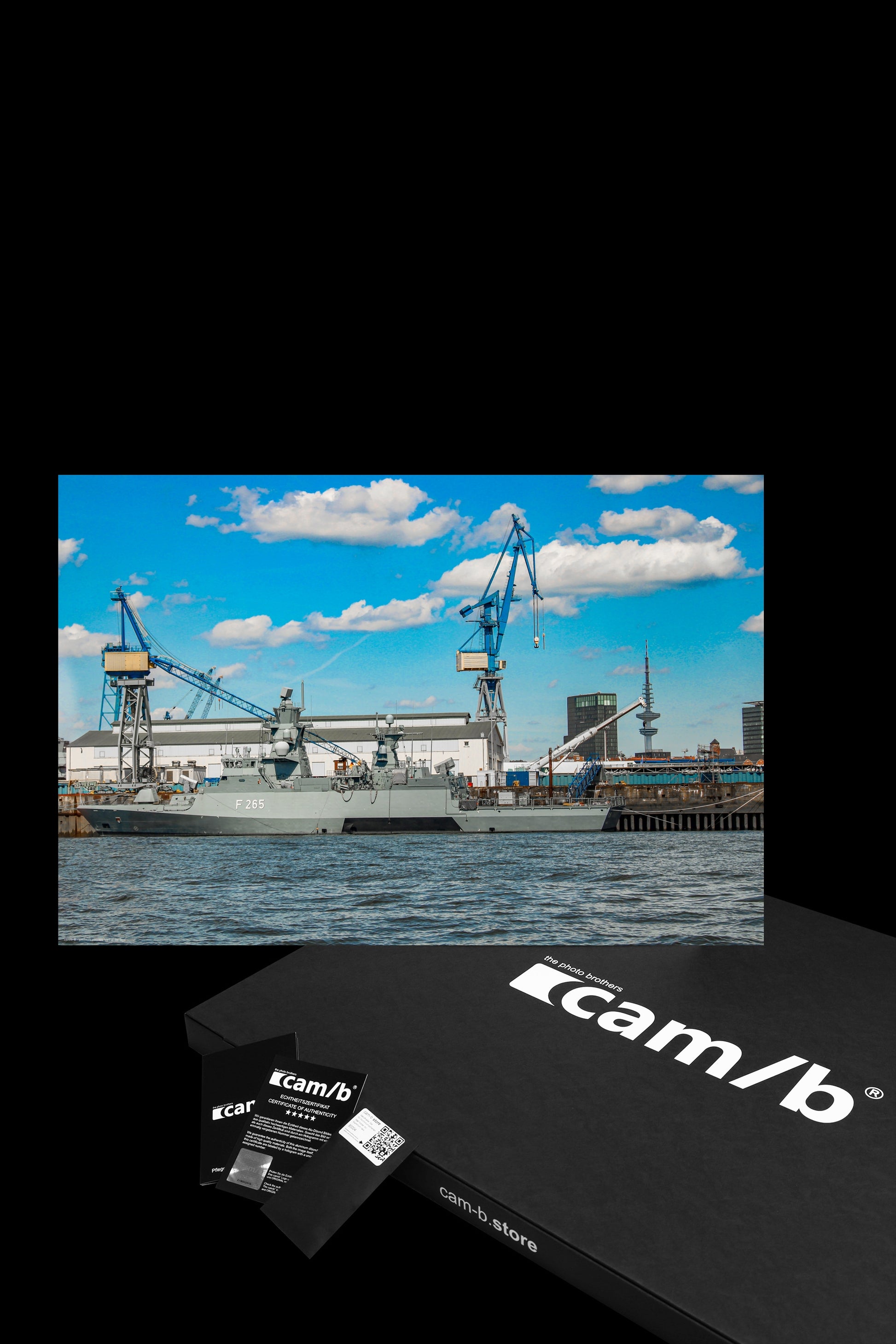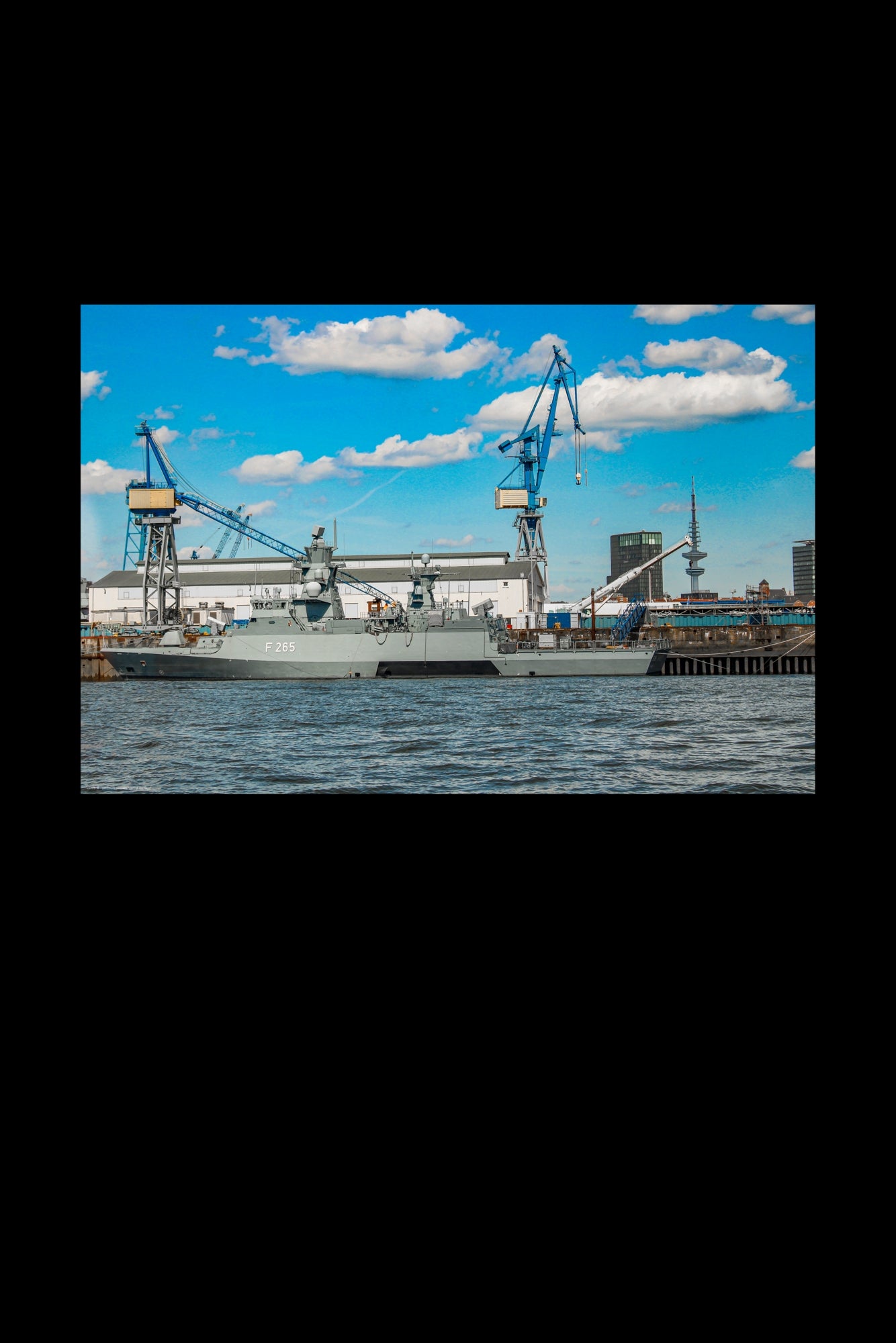 Die Korvette Köln (Kennummer F 265, Braunschweig Klasse) der deutschen Marine im Hafen von Hamburg. Im Hintergrund der Heinrich-Hertz Fernsehturm (Fotograf: Luise, 2025).