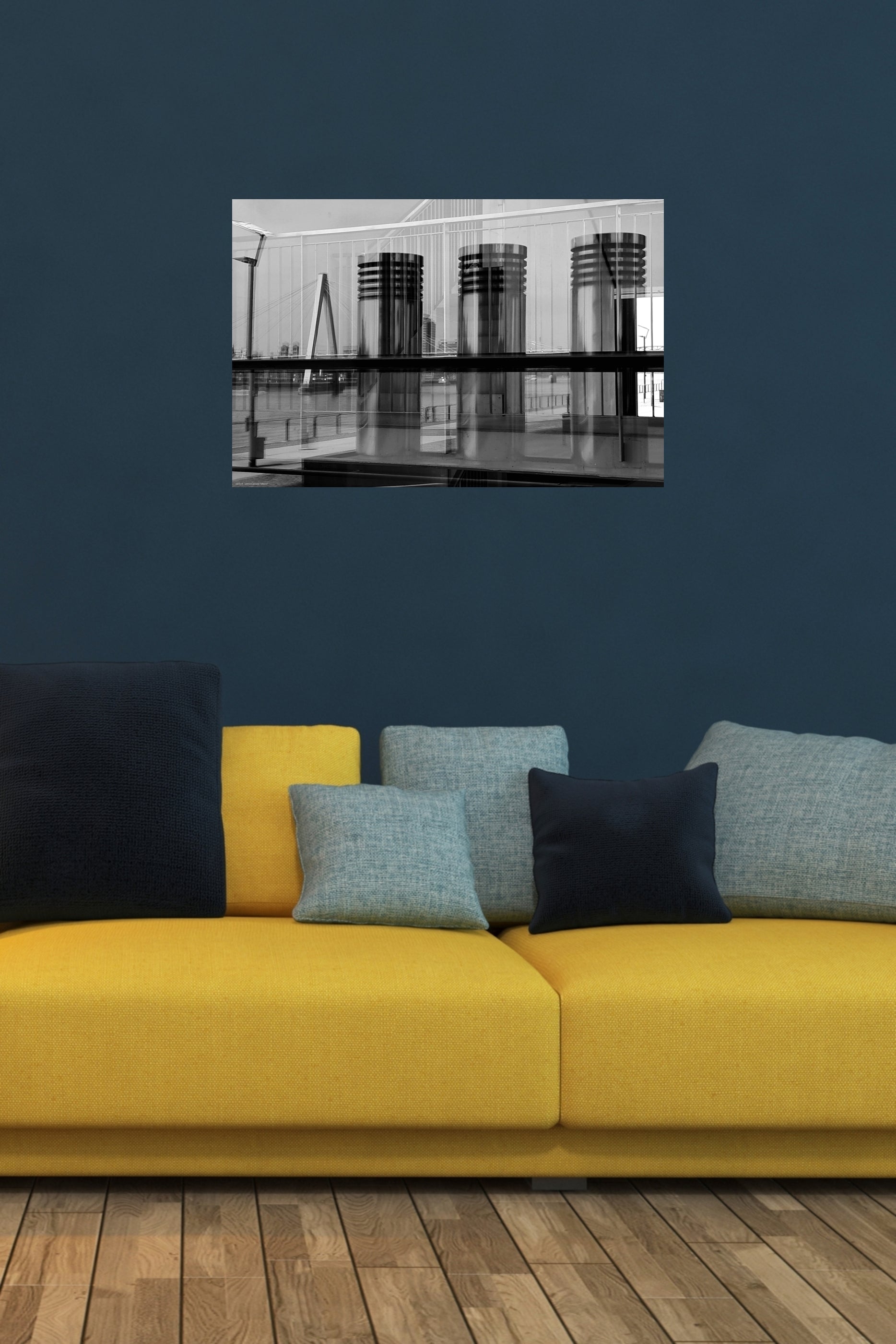 Blick auf den Rhein in Köln in einer wunderschönen Reflexion indem die bewusste Unschärfe dominant im Vordergrund steht. Die Tiefe dieses Bildes wird durch das kontrastreiche s/w Edit aktiv hervorgehoben und bildet einen perfekten Gegensatz zur Realität (Fotograf: Manuel Heywinkel, 2025).
