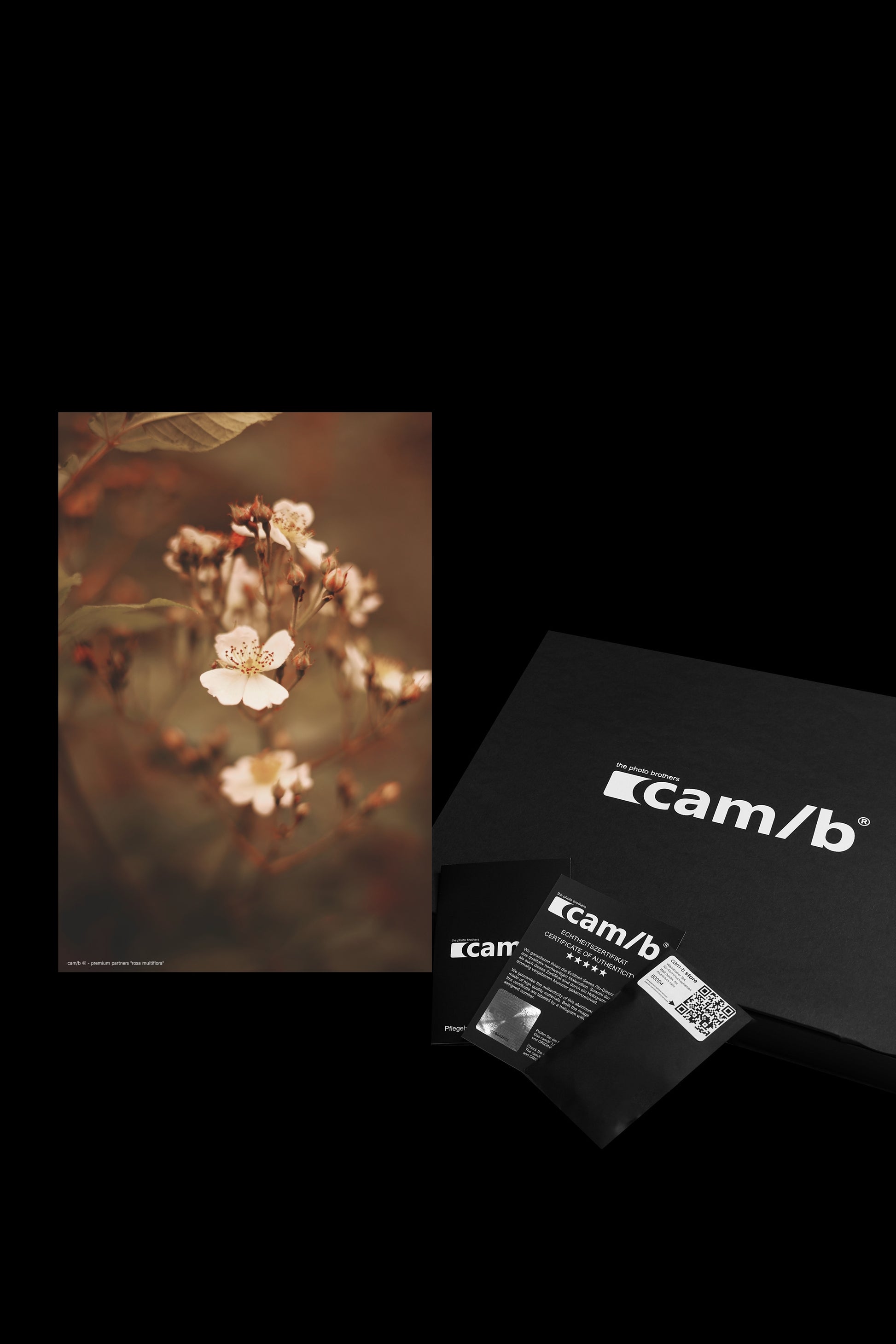 Phantastisches Wandbild in zartem Braun- und Weißton mit fokkusierung auf die Blüte der Büschel-Rose. Diese kann bis zu 3 m hoch wachsen. Die Rosa multiflora ist perfekt geeignet als Kletterrose an Zäunen oder Rankgittern, auch und besonders weil sie besonders dicht wächst und kaum Stacheln besitzt (Fotograf: wuppigraphy, 2024).