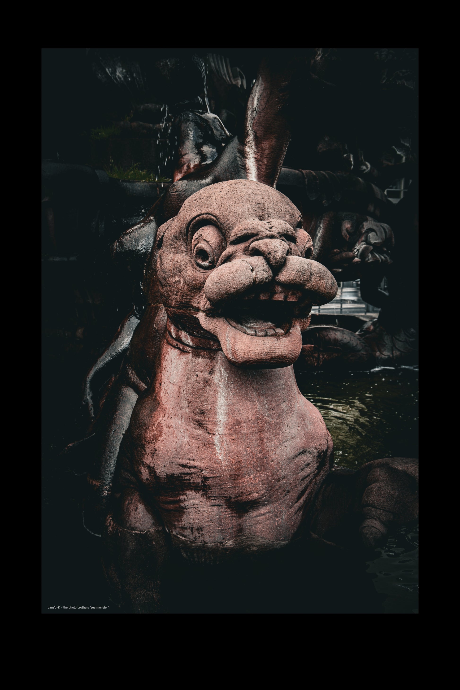 Seeungeheuer im Jubiläumsbrunnen, im Volksmund auch Neptunsbrunnen genannt. Dieser wurde vom Düsseldorfer Bildhauer Leo Müsch als Nachbau des Neptunsbrunnen auf der „Piazza Duomo“, dem Domplatz in Trient, erschaffen (Fotograf: DE, 2023).