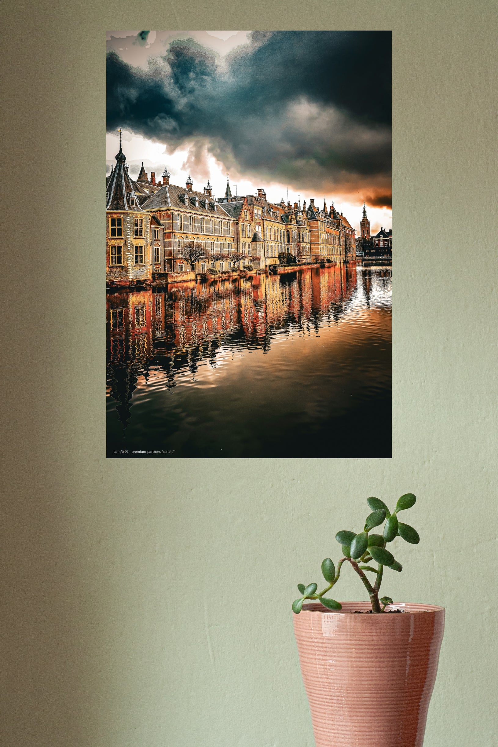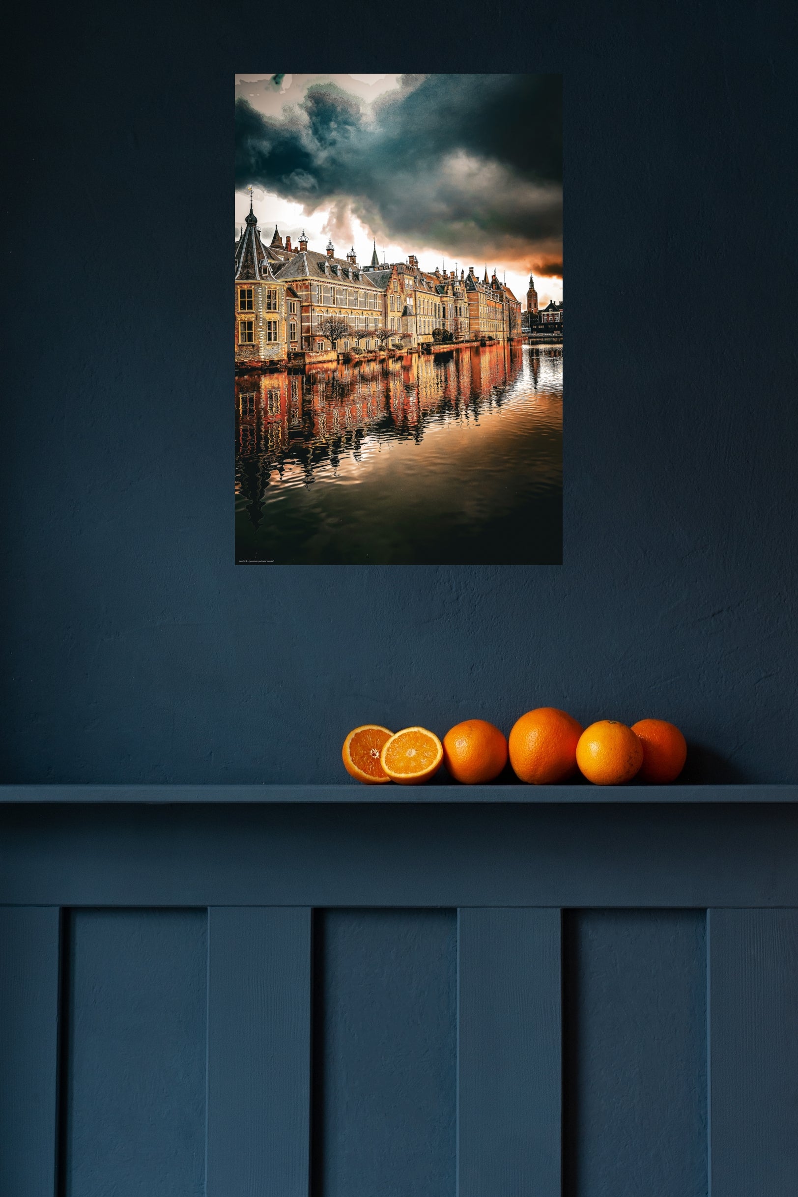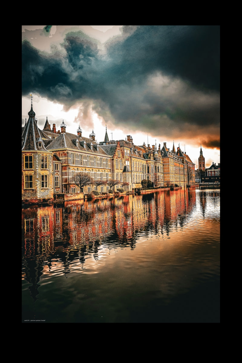 Mitten in der Stadt von Den Haag liegt der Binnenhof. Dieses Gebäude aus dem 13. Jahrhundert dient heute als Sitz der ersten Kammer und des Parlamentes. Dieses schöne Wandbild präsentiert das Gebäude selbst und den davor liegenden See in einem zum Bild perfekt passenden mystisch wirkendem Edit (Fotograf: Christian Horenkamp, 2024).