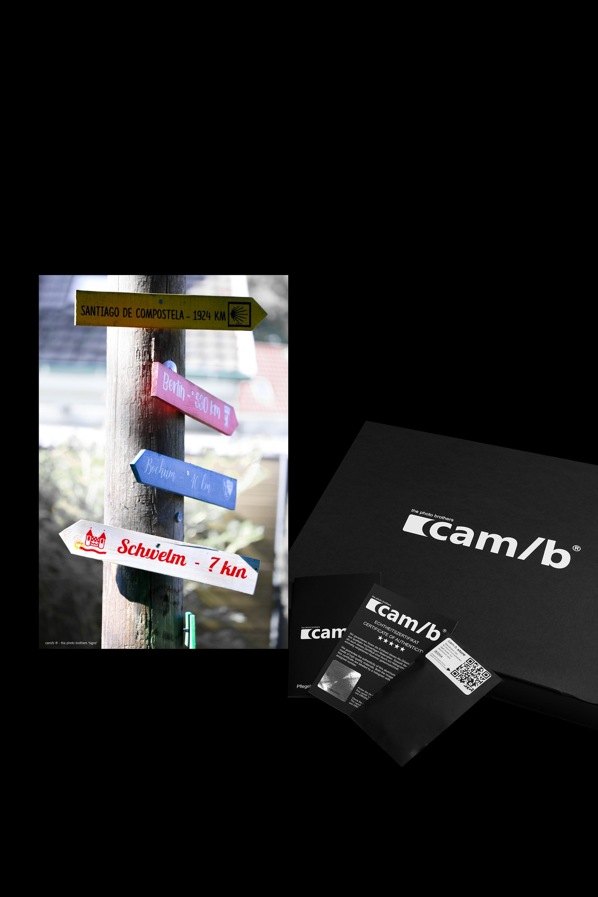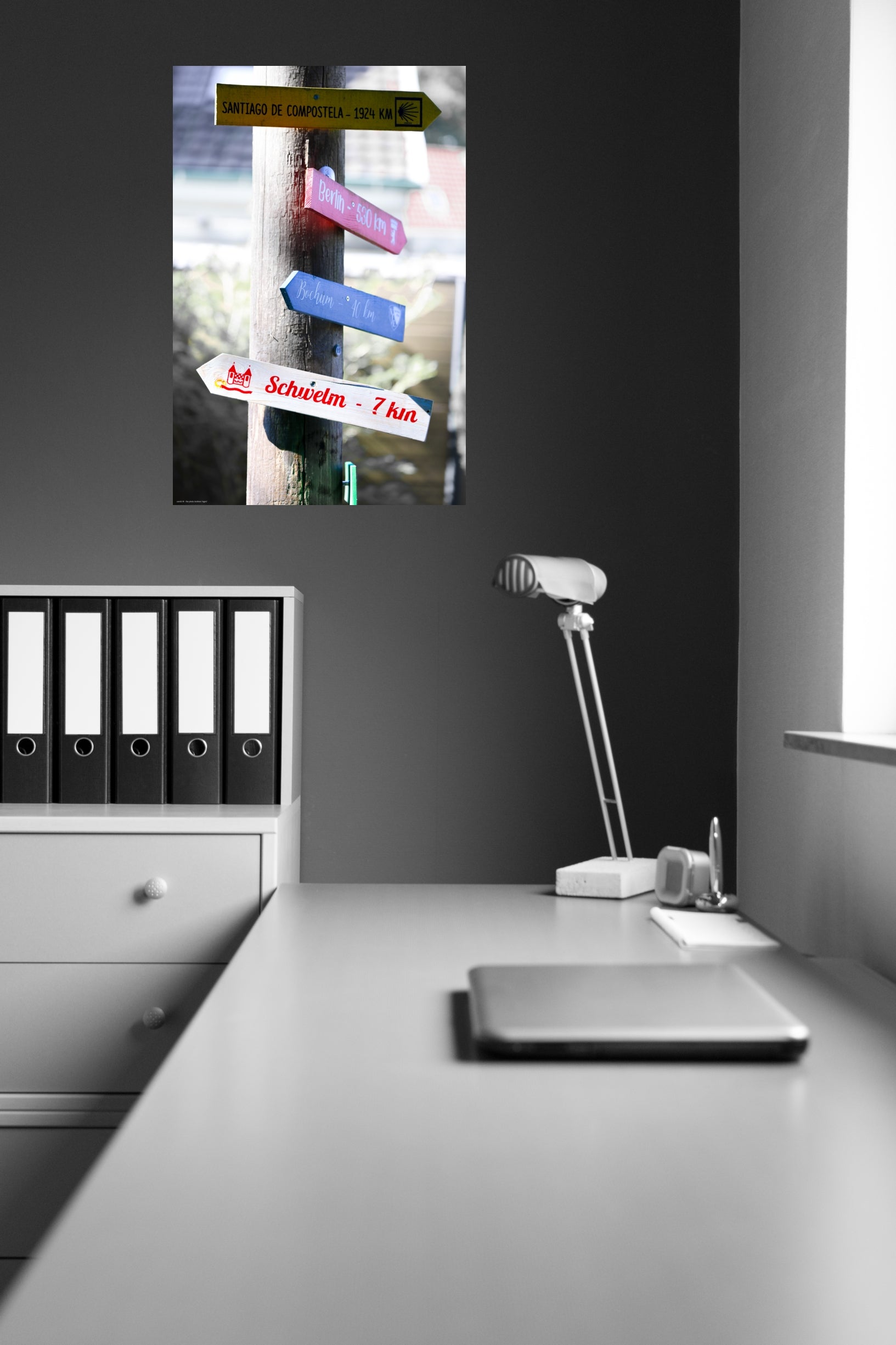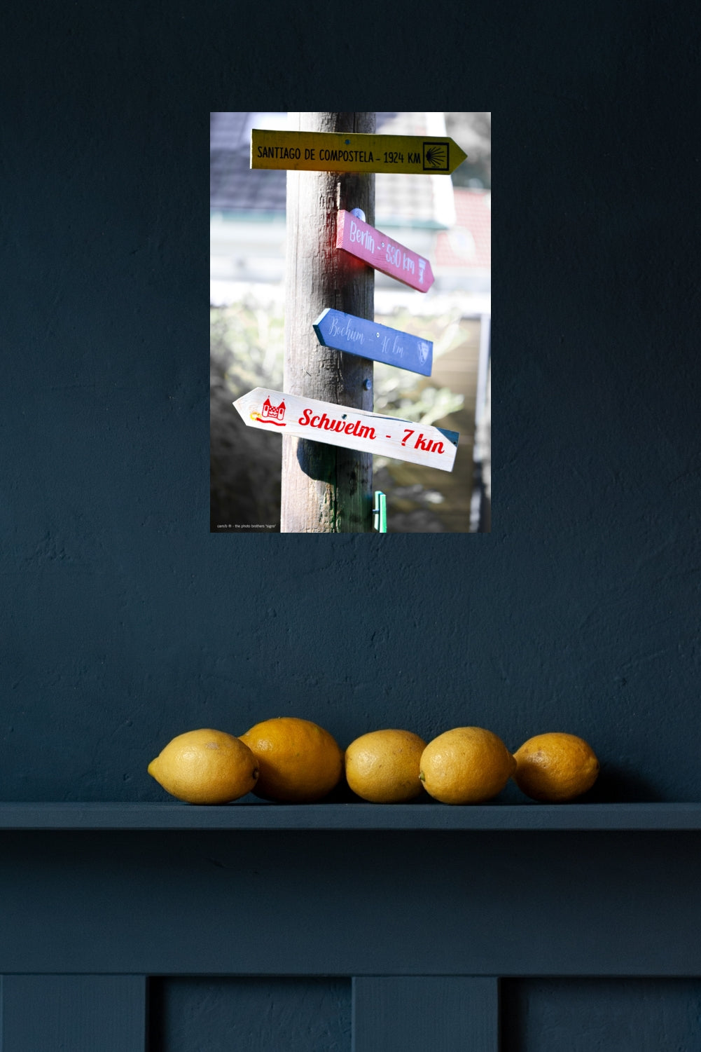 Wandbild eines schönes farbenfrohes Hinweisschild aus Holz in Wuppertal Beyenburg auf die Städte Santiago de Compostela, Berlin, Bochum und Schwelm (Fotograf: DE, 2024).