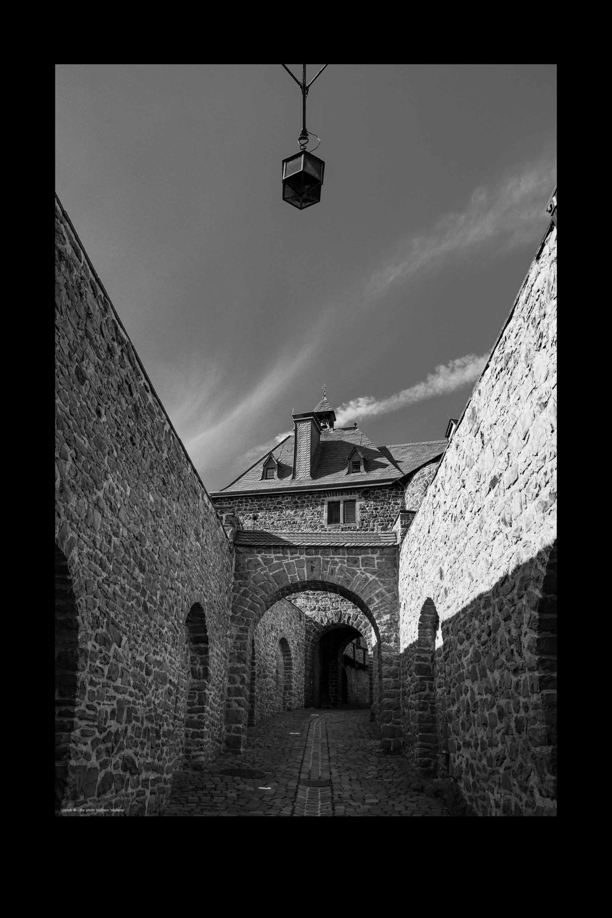 In diesem schönen s/w Bild sieht man den Eingang zur Burg Altena - die Lampe scheint dabei in der Luft zu schweben (Fotograf: DE, 2022).