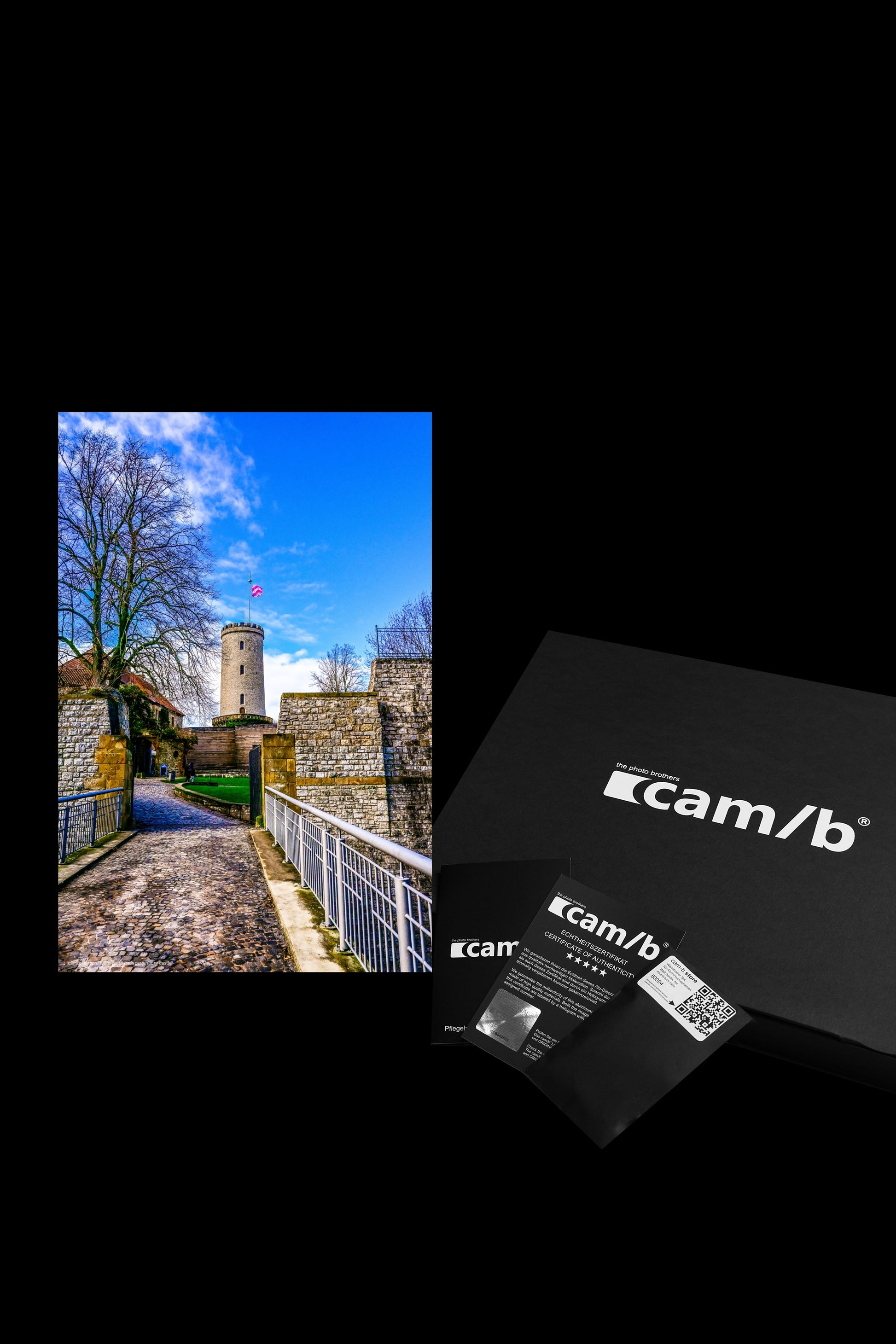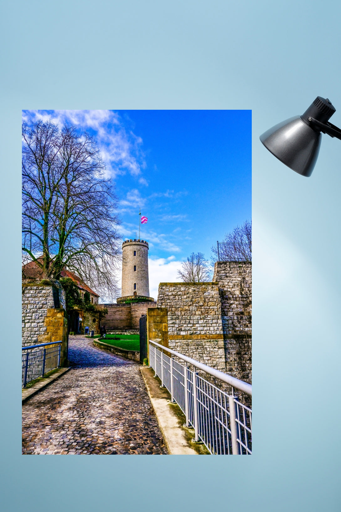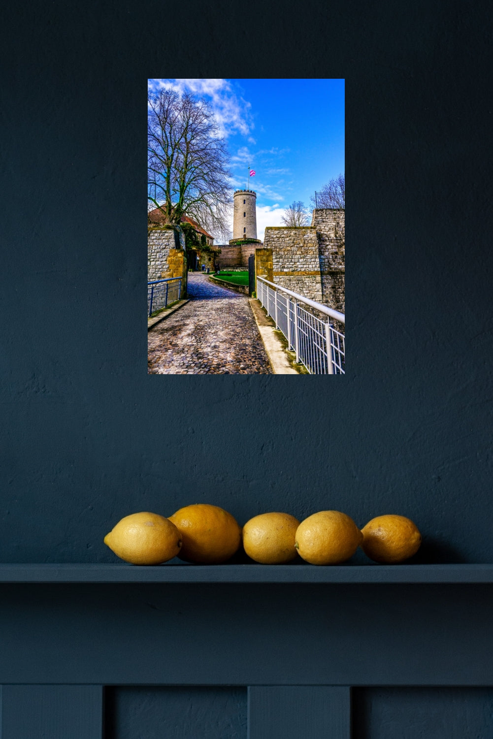 Schönes Alu-Dibond Wandbild der Sparrenburg in Bielefeld, erbaut 1250 durch die Grafen von Ravensberg liegt diese auf dem 180 m hohen Sparrenberg im Teutoburger Wald. Bekannt ist die Burg auch für das jährlich dort stattfindende Sparrenburgfest (Fotograf: Christian Horenkamp, 2019).