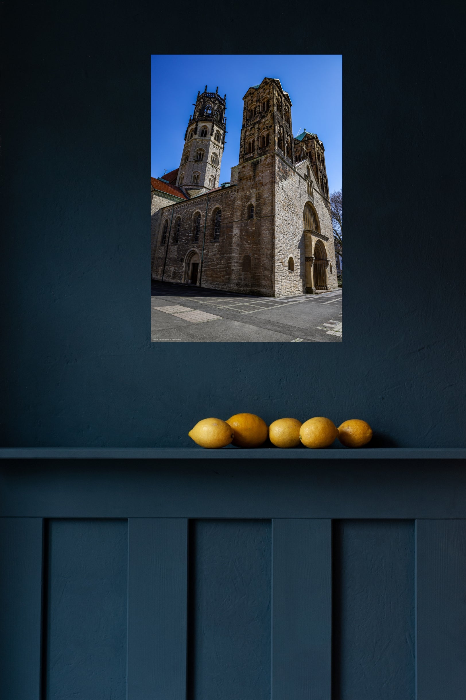 Auf diesem Bild aus dem Jahr 2022 ist die um 1880 im Romanik Stil erbaute St. Ludgeri Kirche Münster in interessanter Perspektive (Fotograf: DE, 2022).