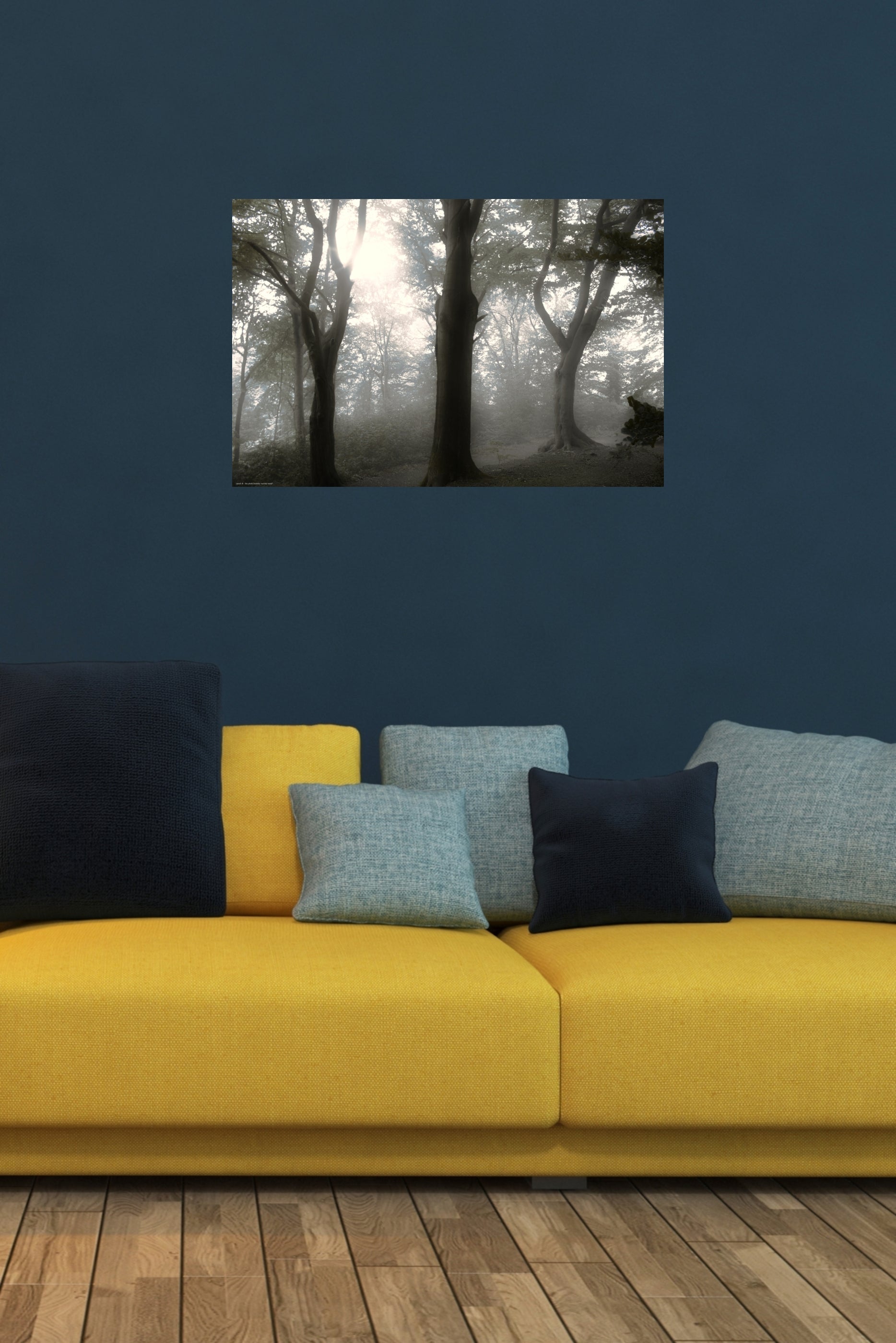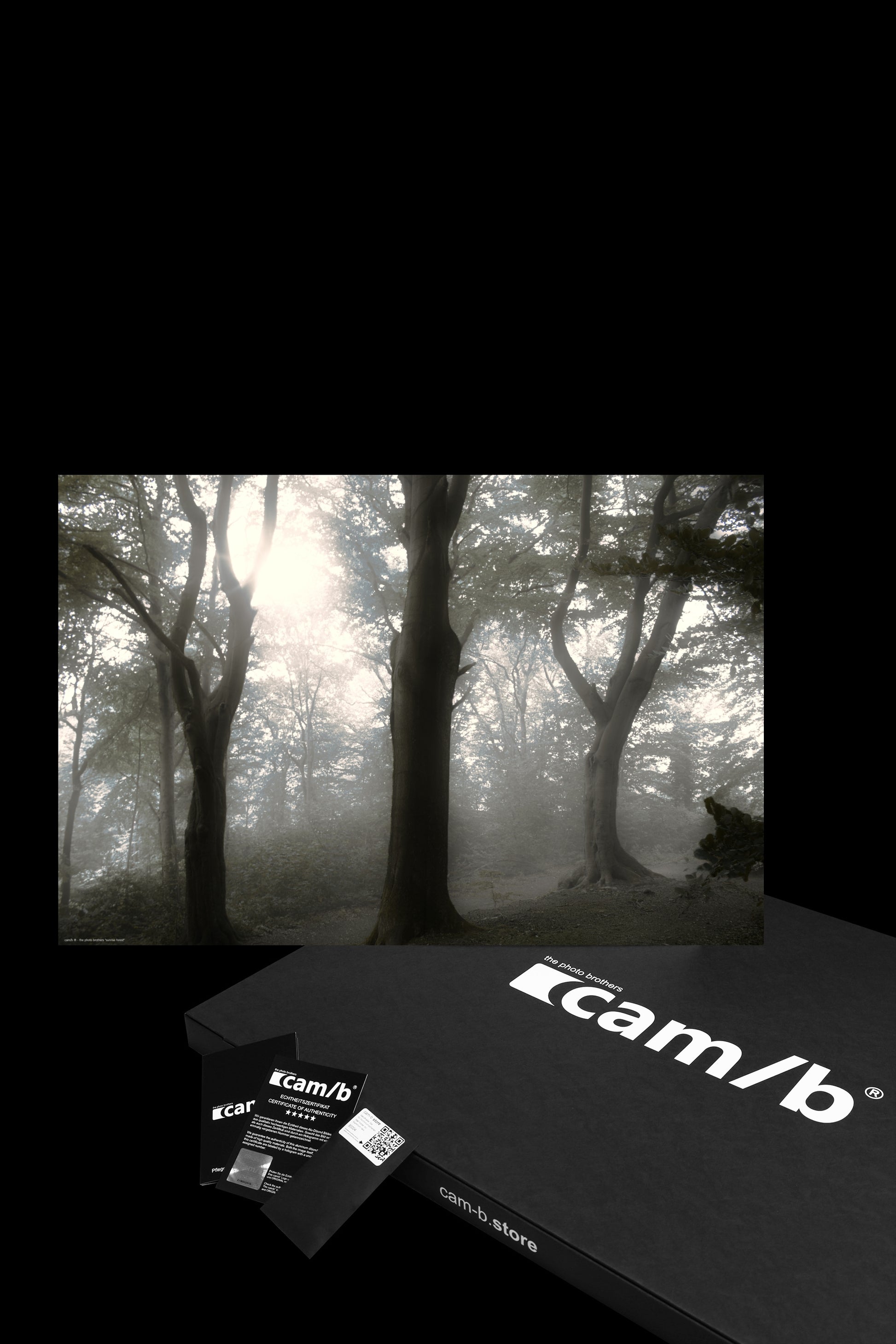 Ein Spaziergang im Wald am frühen morgen bei Sonnenaufgang ist mitunter ein ganz besonderes Erlebnis - und in diesem schönen Wandbild in einem s/w Edit kann man diese Atmosphäre nahezu förmlich greifen (Fotograf: TE, 2025).