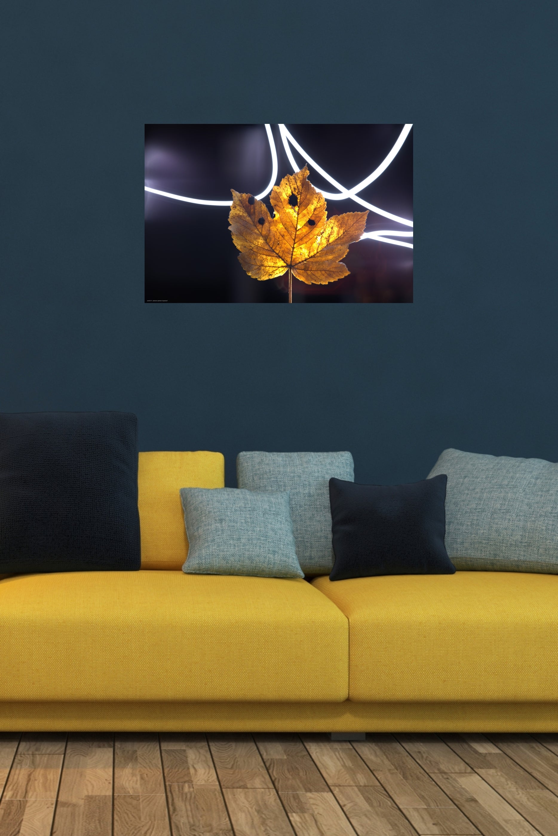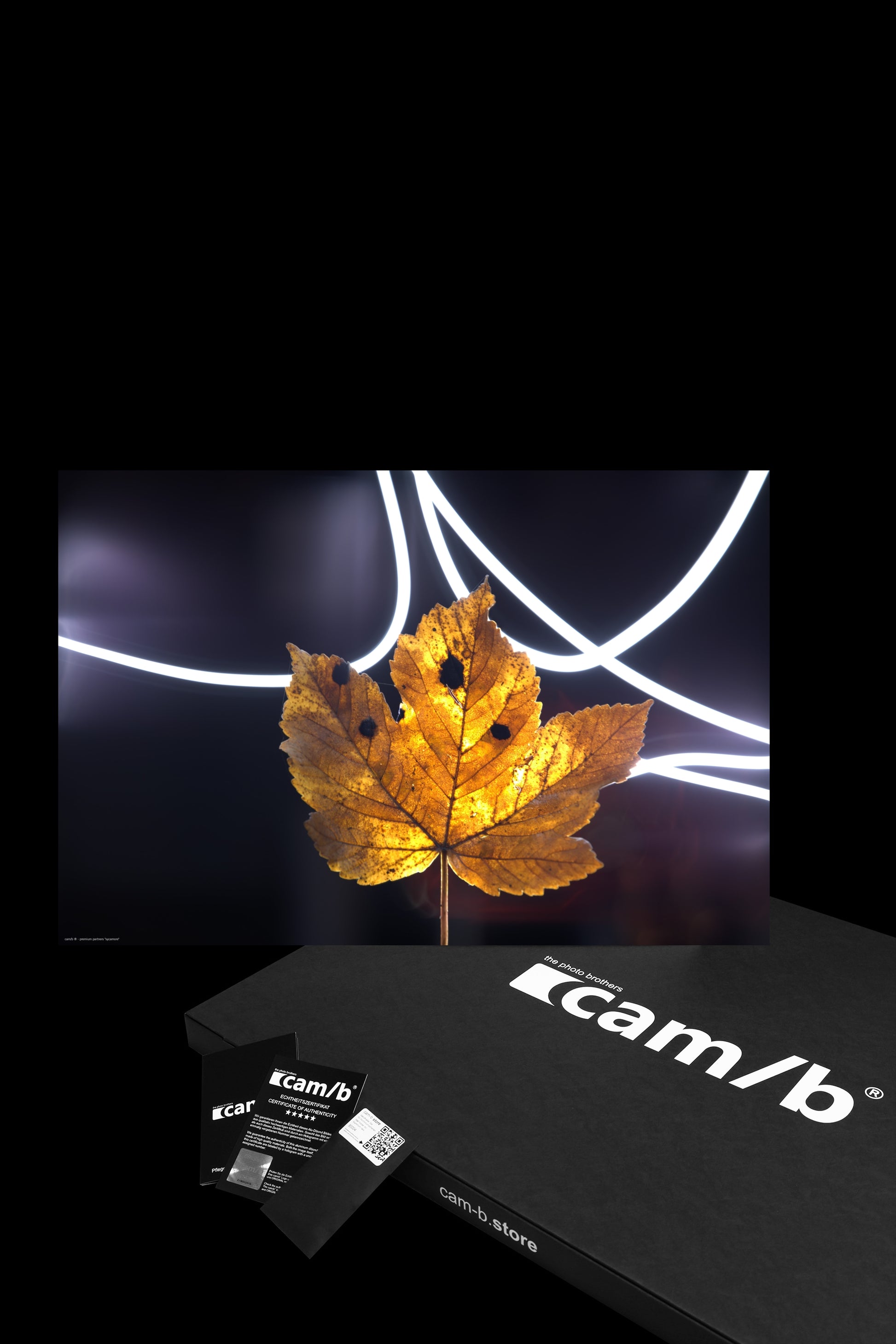 Herbstliches Blatt eines Bergahorn vor einer abstrakten Lichtinstallation (Fotograf: wuppigraphy, 2025).