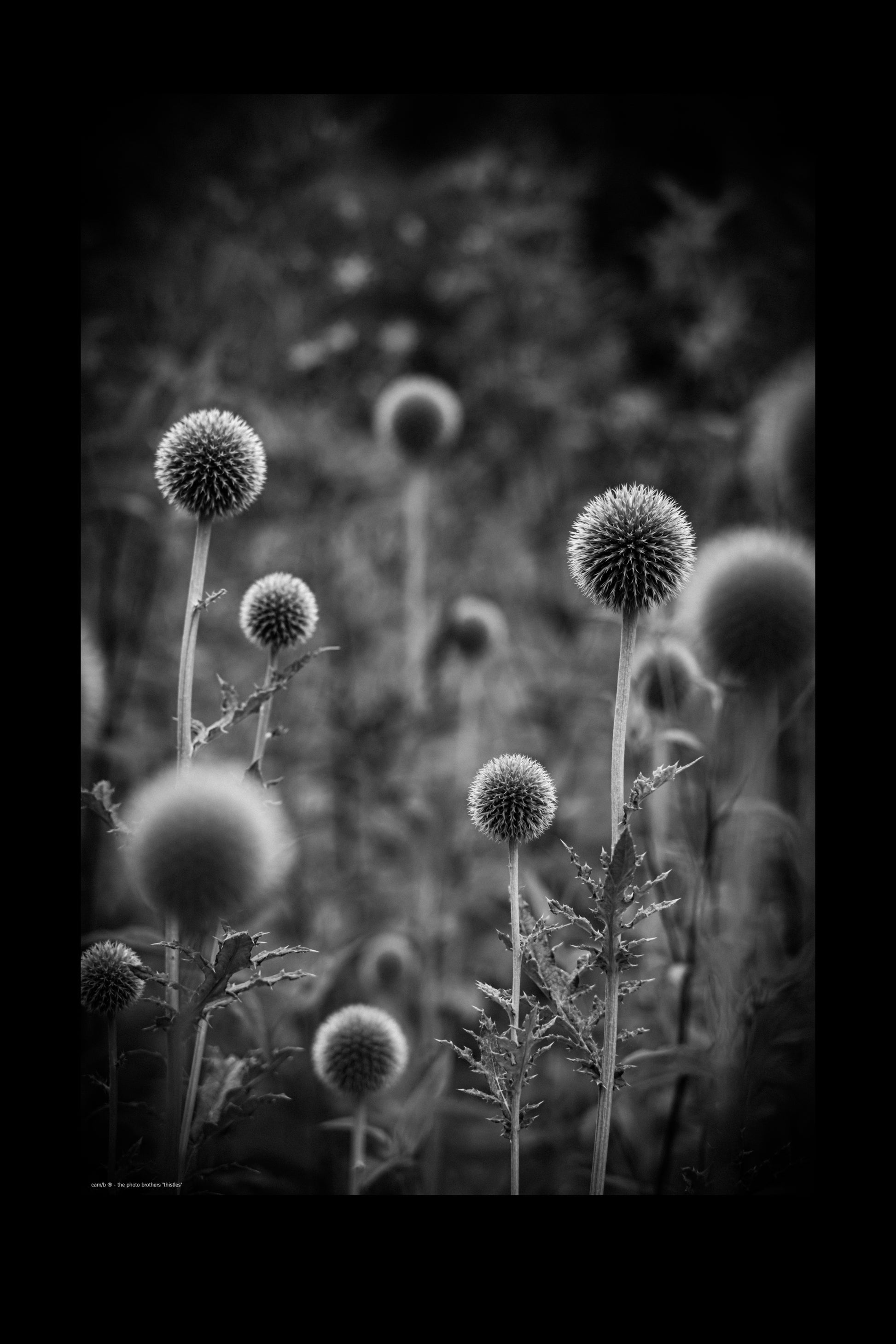 Schönes s/w Bild mit einer leichten Körnung von einem Distel Feld - wirkt es doch ein wenig wie "nicht von diese Welt" (Fotograf: DE, 2023).