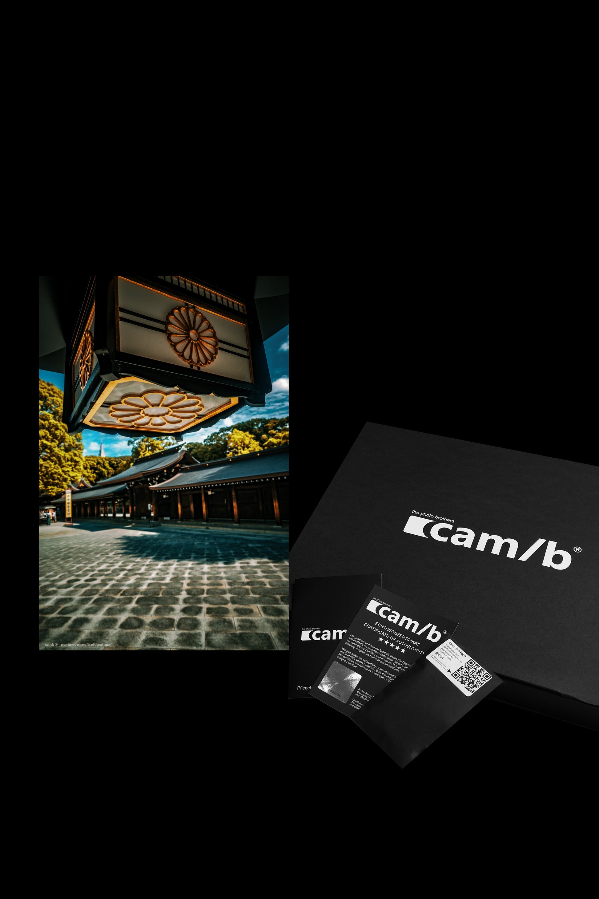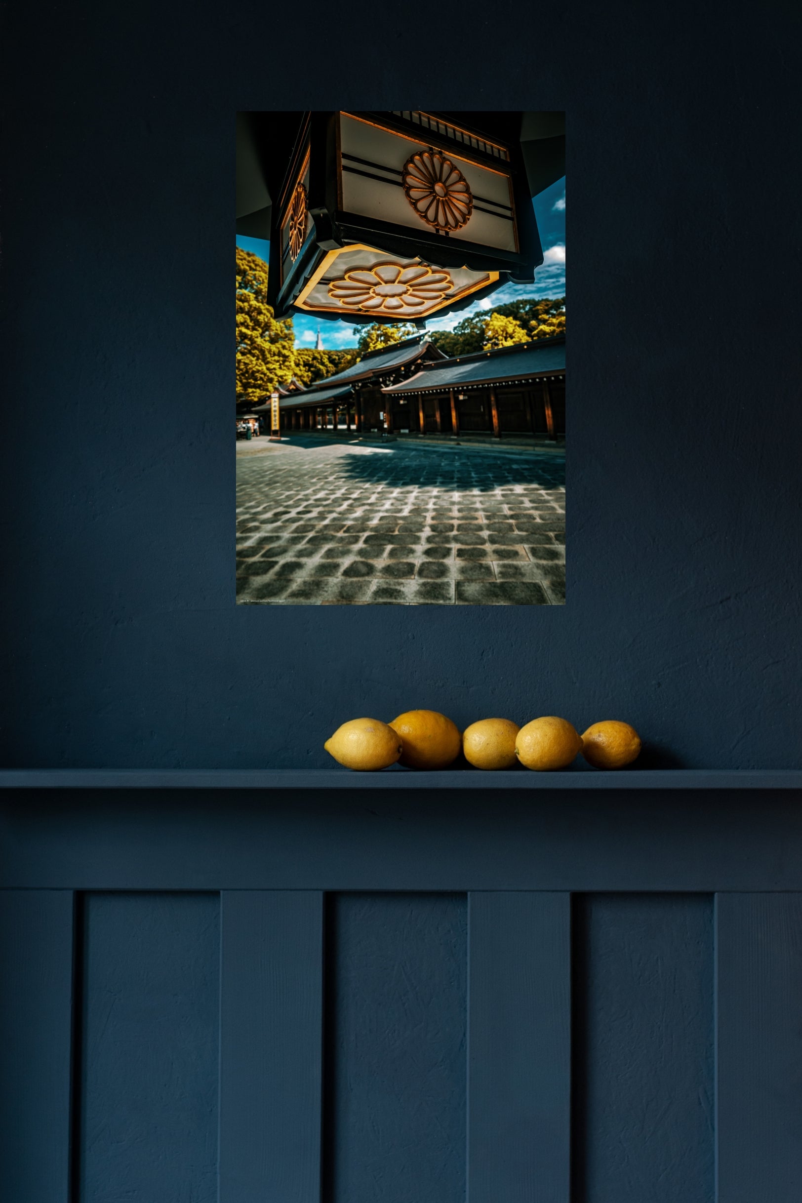 Dieses Wandbild fängt die ruhige Atmosphäre des traditionellen japanischen Meiji-Schrein in Tokio ein. Im Vordergrund sind kühle Steinplatten zu sehen, die in warme Holzbauten übergehen, welche von tiefen, elegant geschwungenen Dächern gekrönt sind. Die goldverzierten hängenden Laternen tragen das kaiserliche Chrysanthemen-Emblem und unterstreichen die historische Bedeutung des Ortes. Umgeben von sattgrünen und gelb belaubten Bäumen strahlt die Szene eine zeitlose Ruhe aus, die typisch für die Kultur und Architektur Japans ist (Fotograf: Christian Horenkamp, 2024).
